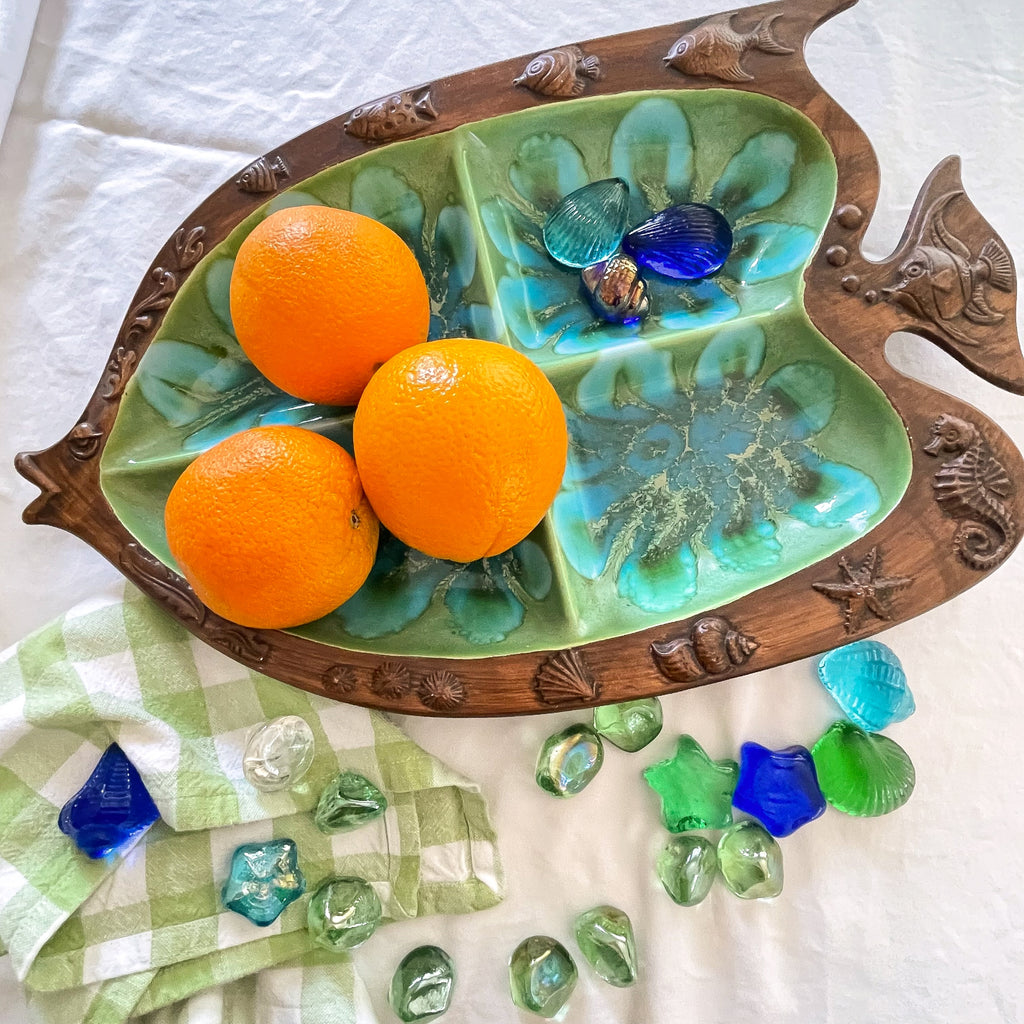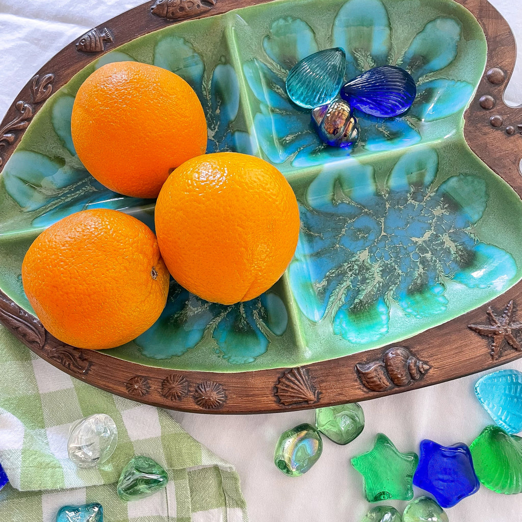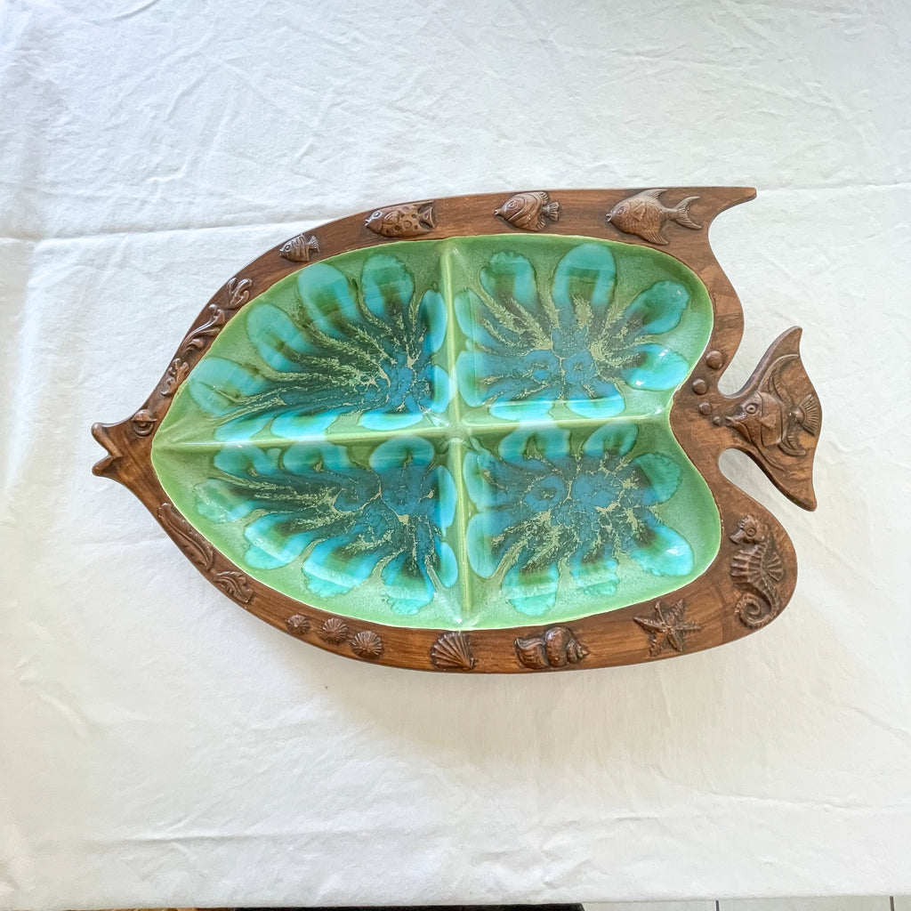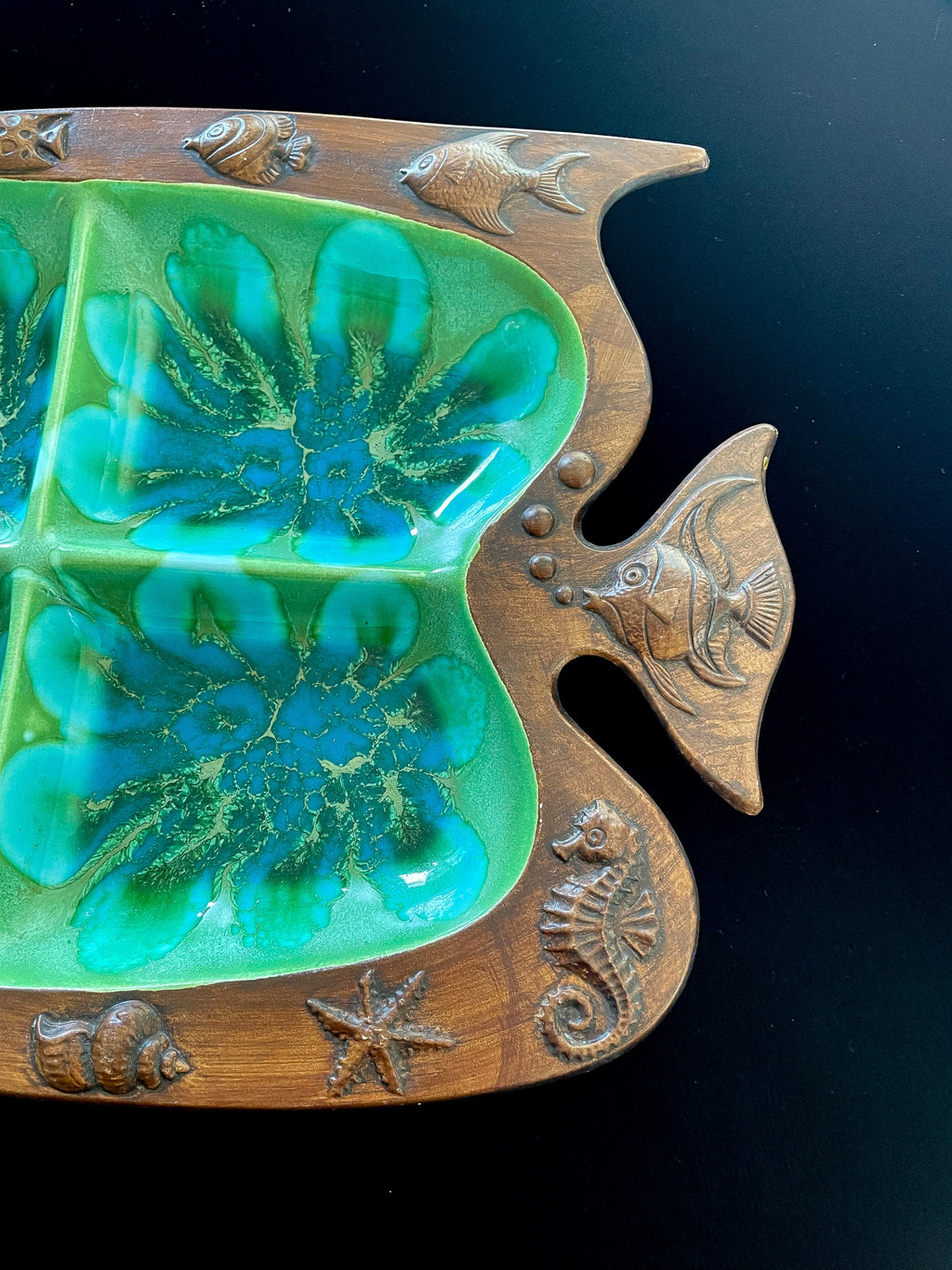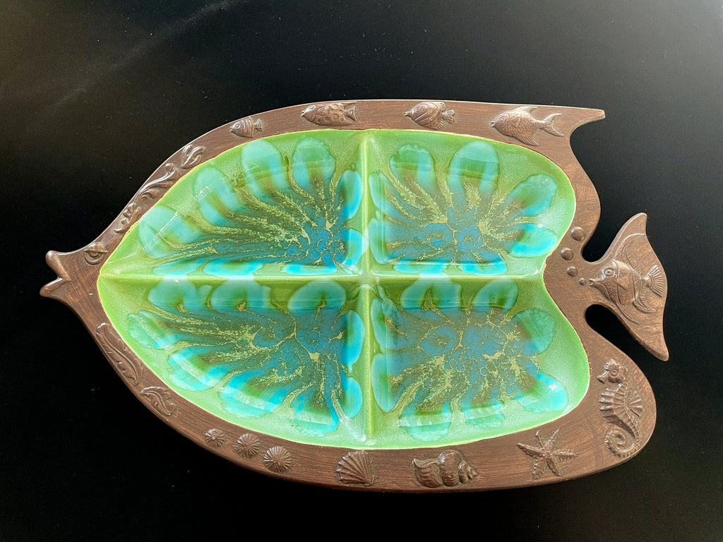Charming MCM serving decor, 4 divided compartments, glazed in green & blue swirls.