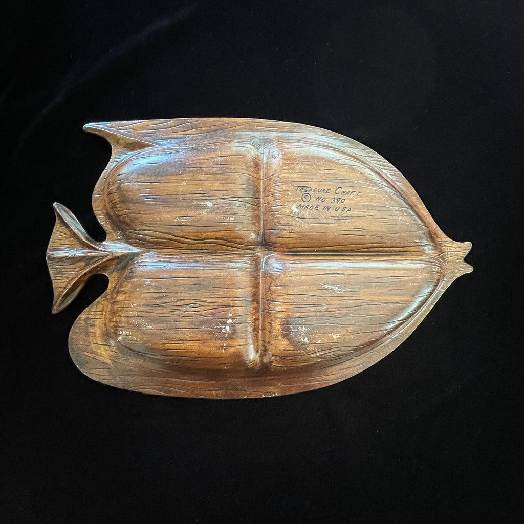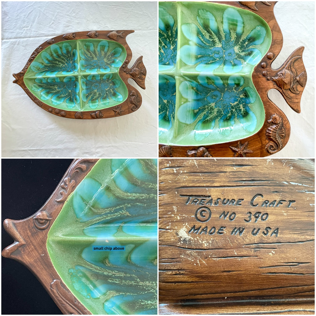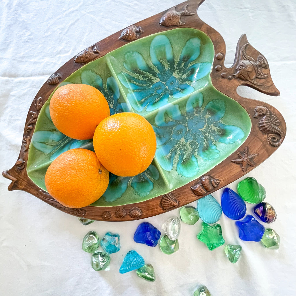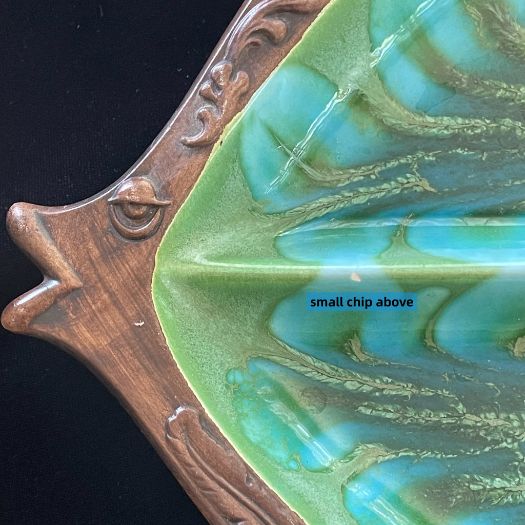 Charming MCM serving decor, 4 divided compartments, glazed in green & blue swirls.