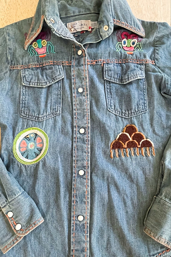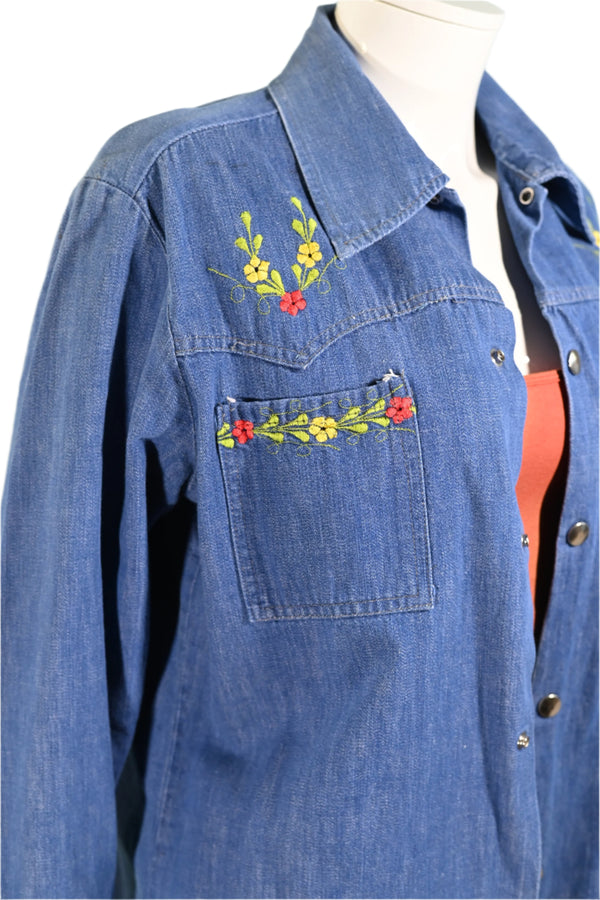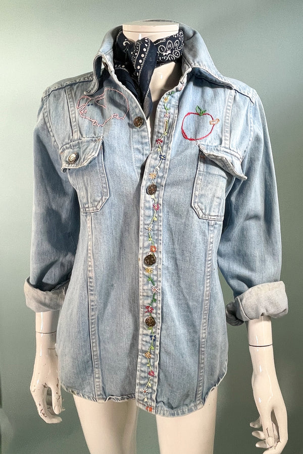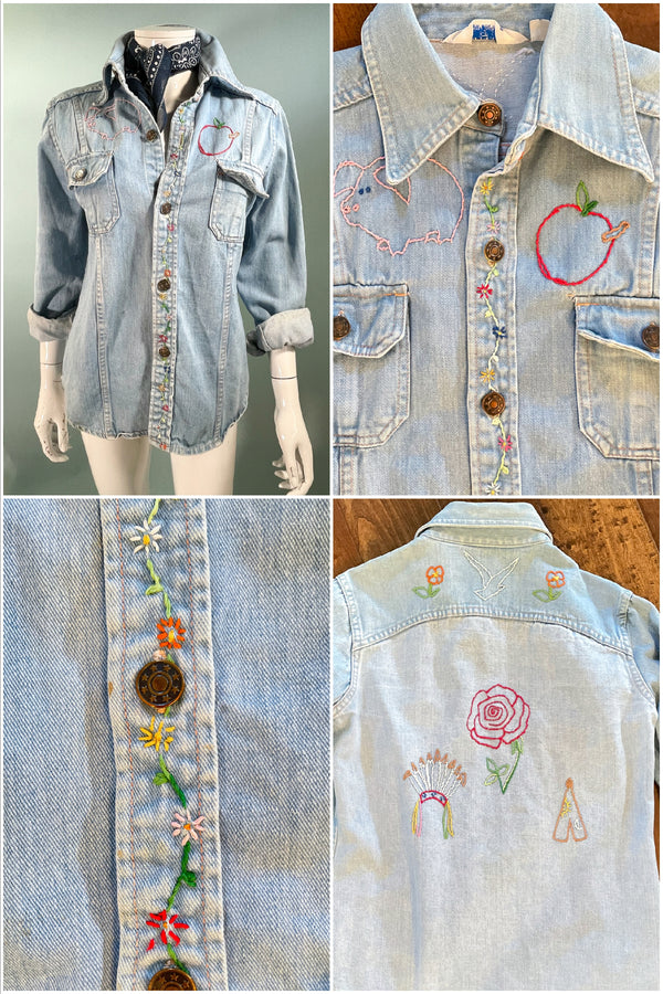 70s Sears Fashions Hand Embroidered Denim Shirt, OOAK Hippie Blouse