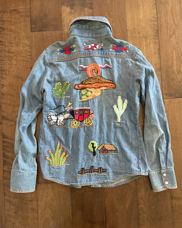 SOLD Vintage 60s/70s Hand Embroidered Denim Shirt, Pearl Snaps by H.I.S.,OOAK Hippie Shirt SZ 5/7 S/XS