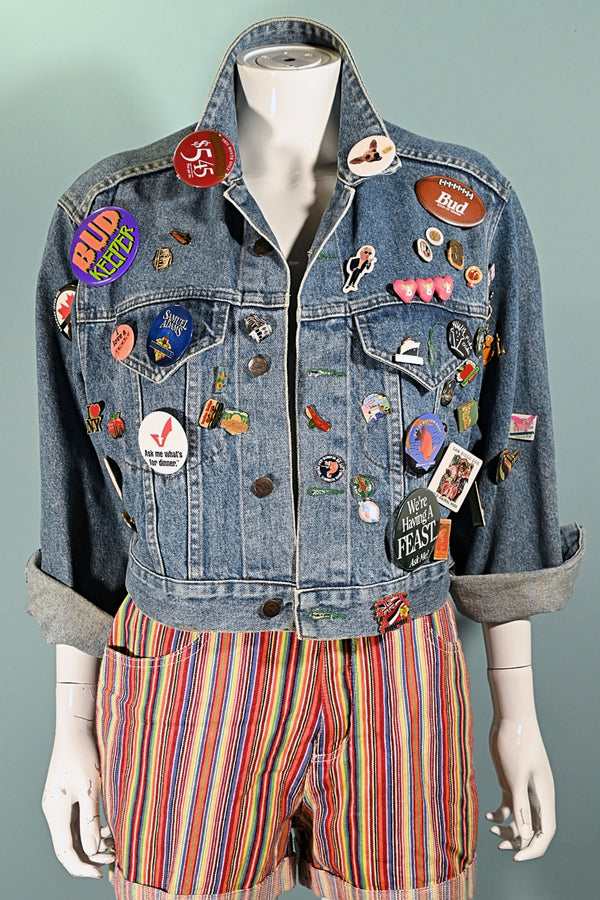 SOLD Vintage Cropped Bongo Denim Jacket, 90s Pins & Buttons, OOAK S