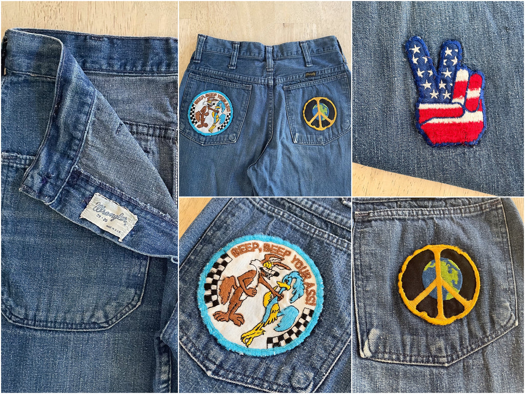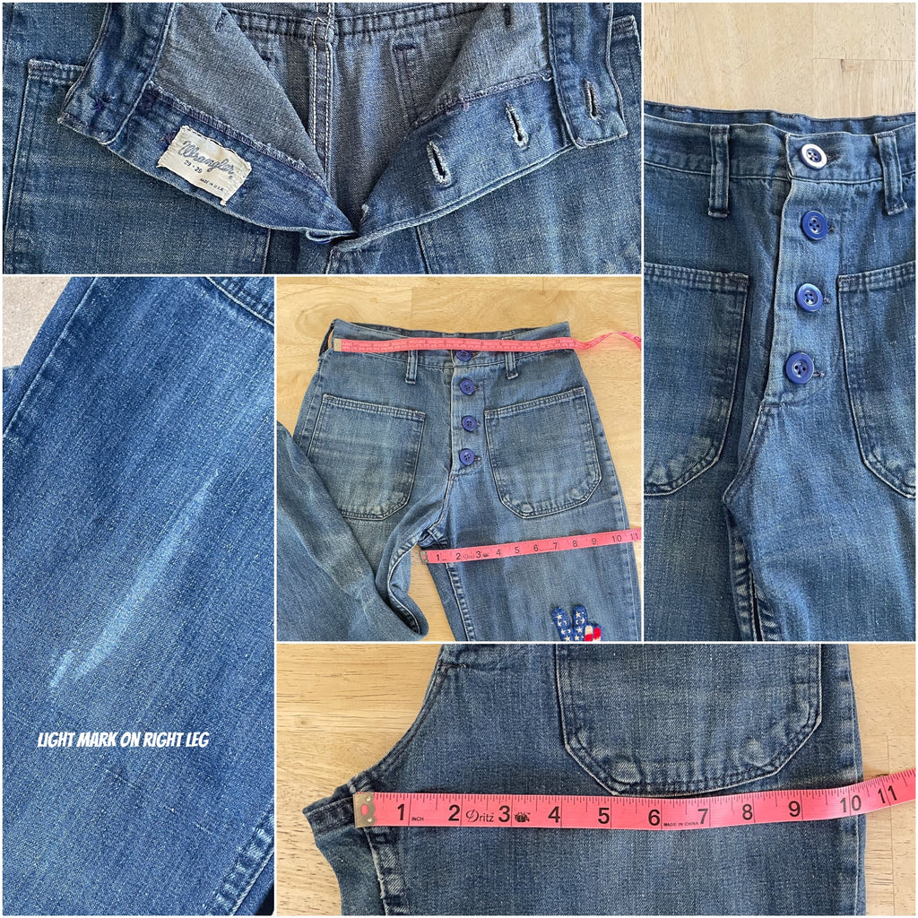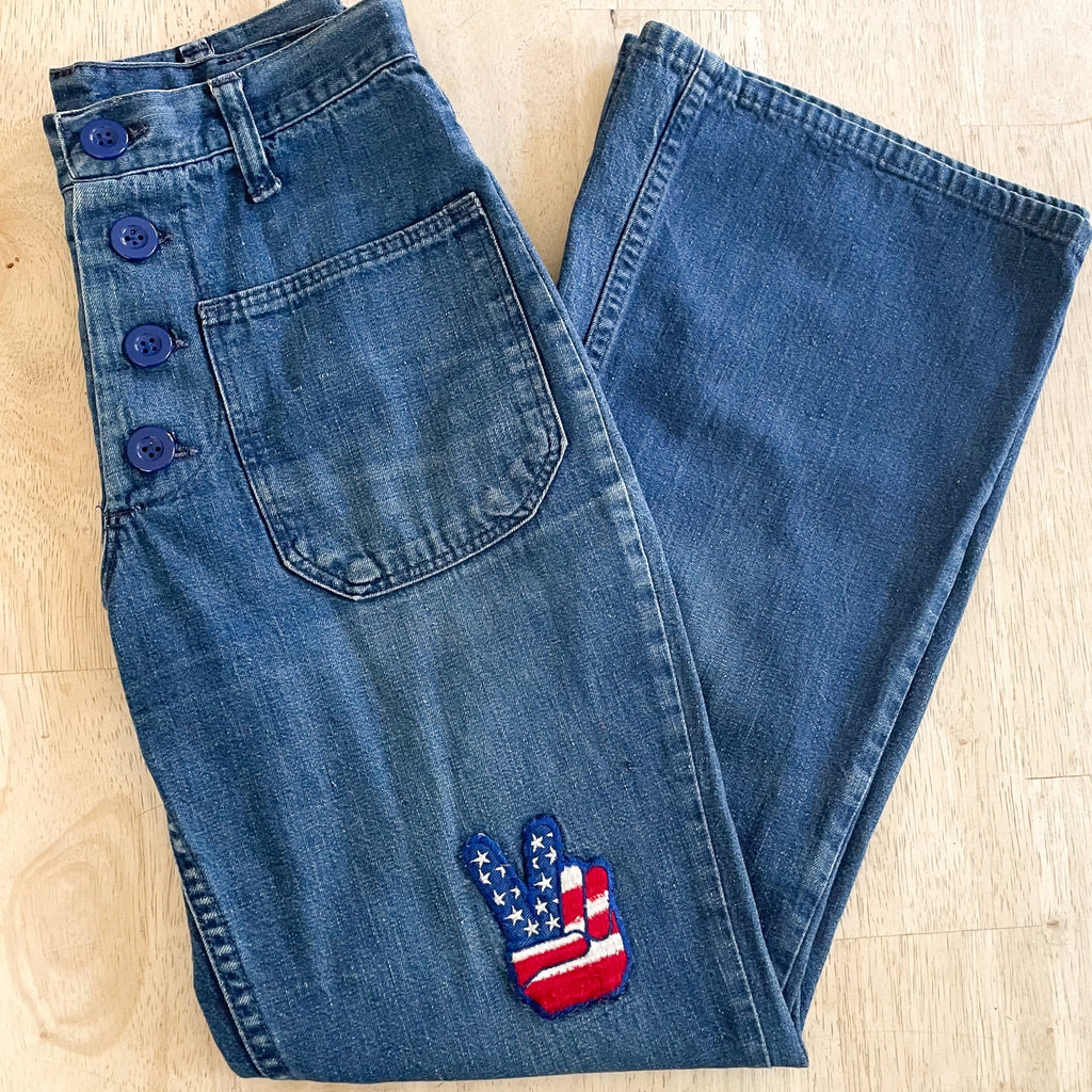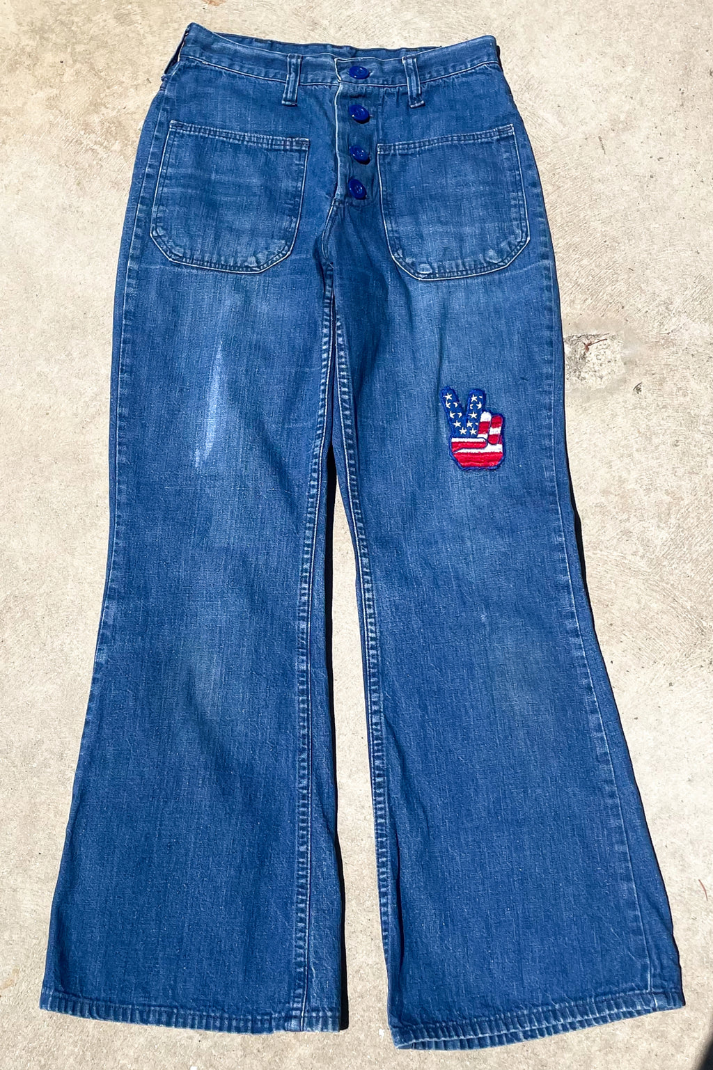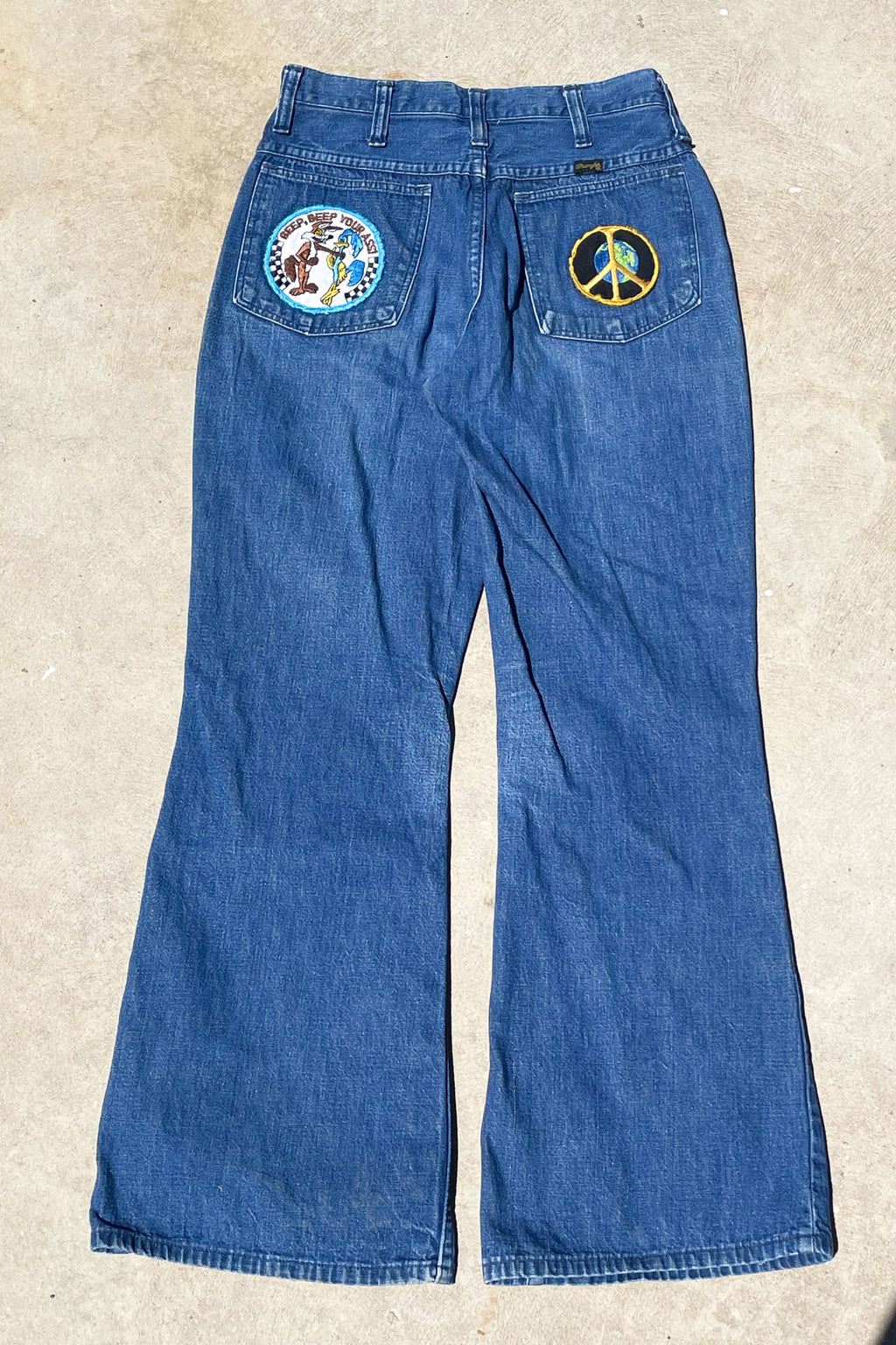 SOLD Vintage 60s/70s Wrangler Bell Bottom Jeans, Hippie Patches XS/S