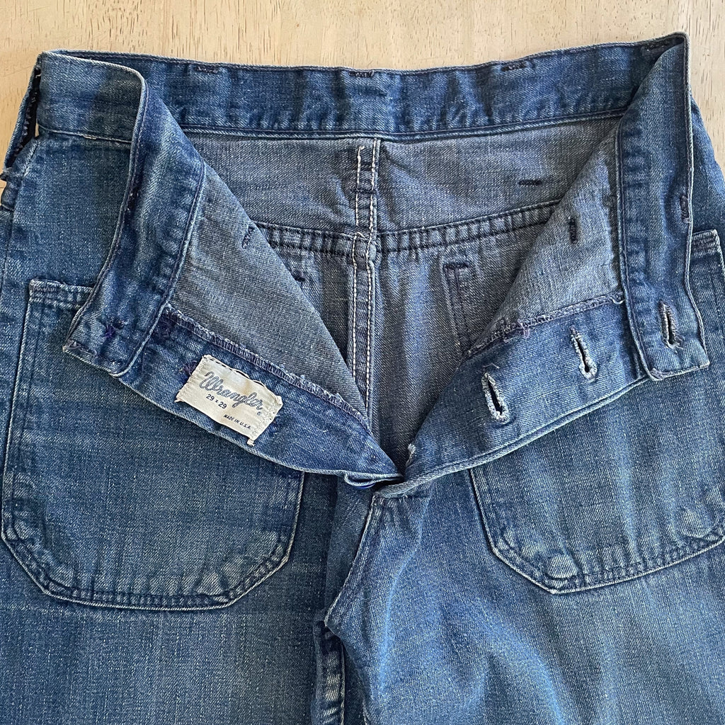 Vintage denim jeans with buttons up the front and patch pockets on the front and back.