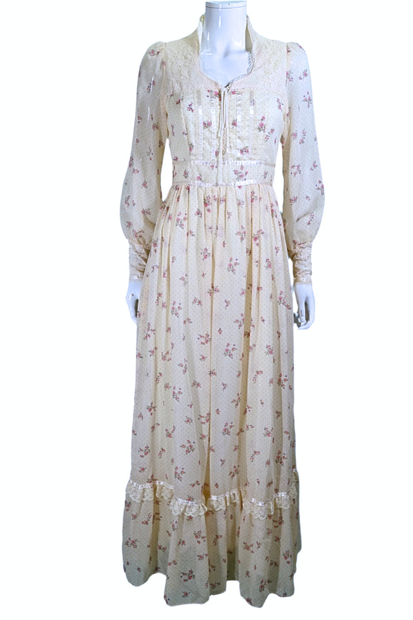 SOLD 70s Gunne Sax Dress Rose Bud Lace Up Maxi Dress, Cottagecore Long Dress S