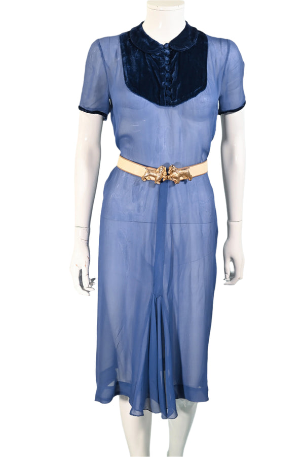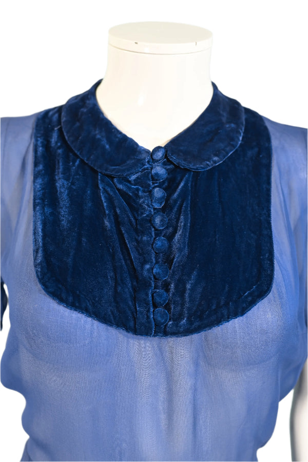 SOLD 30s Blue Chiffon & Velvet Dress, Peter Pan Collar Short Sleeve Dress M