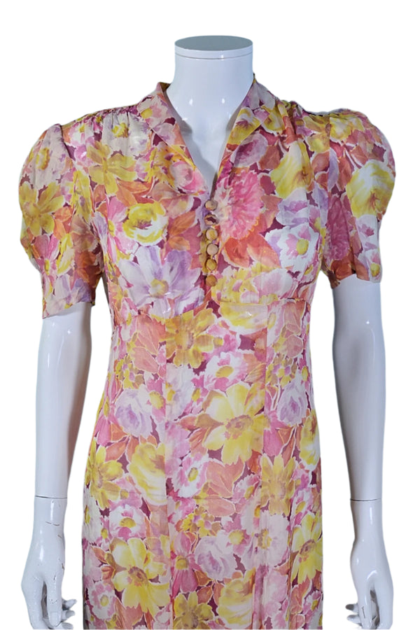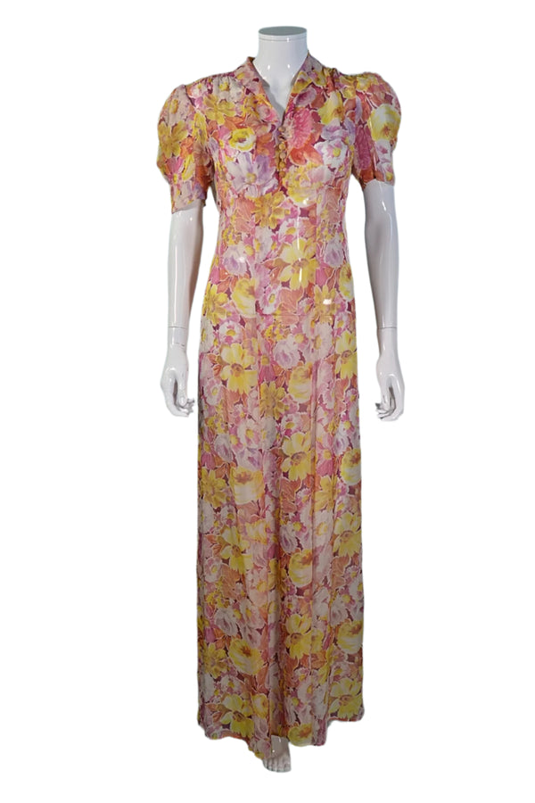 Vintage 1930s Sheer Floral Print Maxi Dress Puff Sleeves