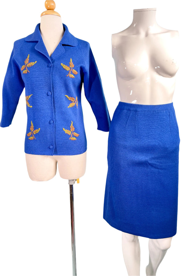 Jacelon of Calif, 60s Royal Blue Wool Knit Suit, Embroidered Jacket + Skirt, XS/S