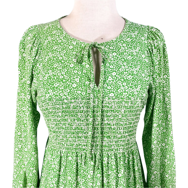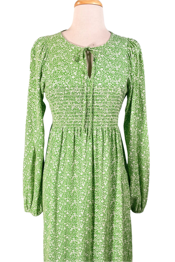 Vintage Mod Calico Print Dress, Smocked Top Sash Tie Long Sleeve Dress S