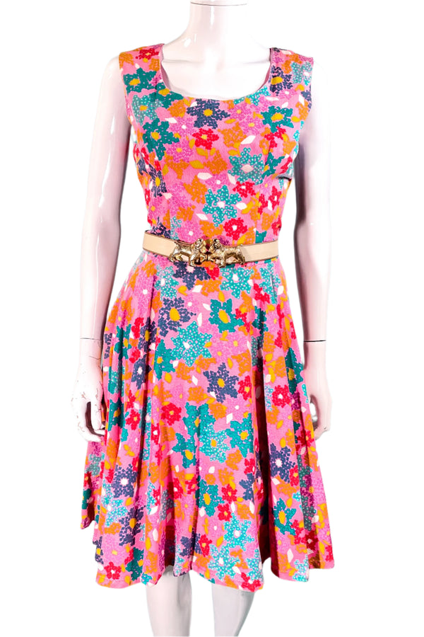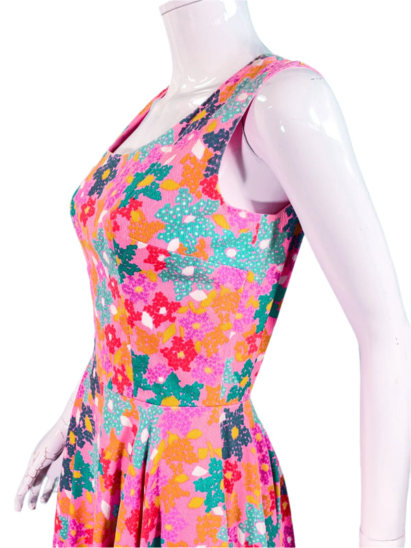 Vintage 60s Bright Pink Floral Dress, Full Skirt + Pocket M