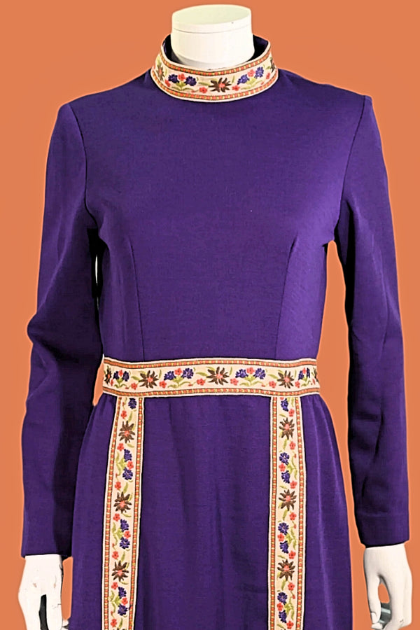 Vintage 60s Purple Hippie Dress, Embroidered Trim, 70s Bohemian Shift Dress M