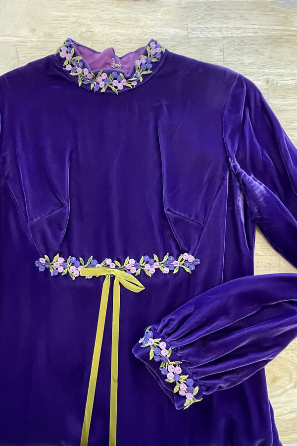 Vintage 60s Purple Velvet Long Sleeve Empire Waist Maxi Dress M