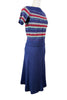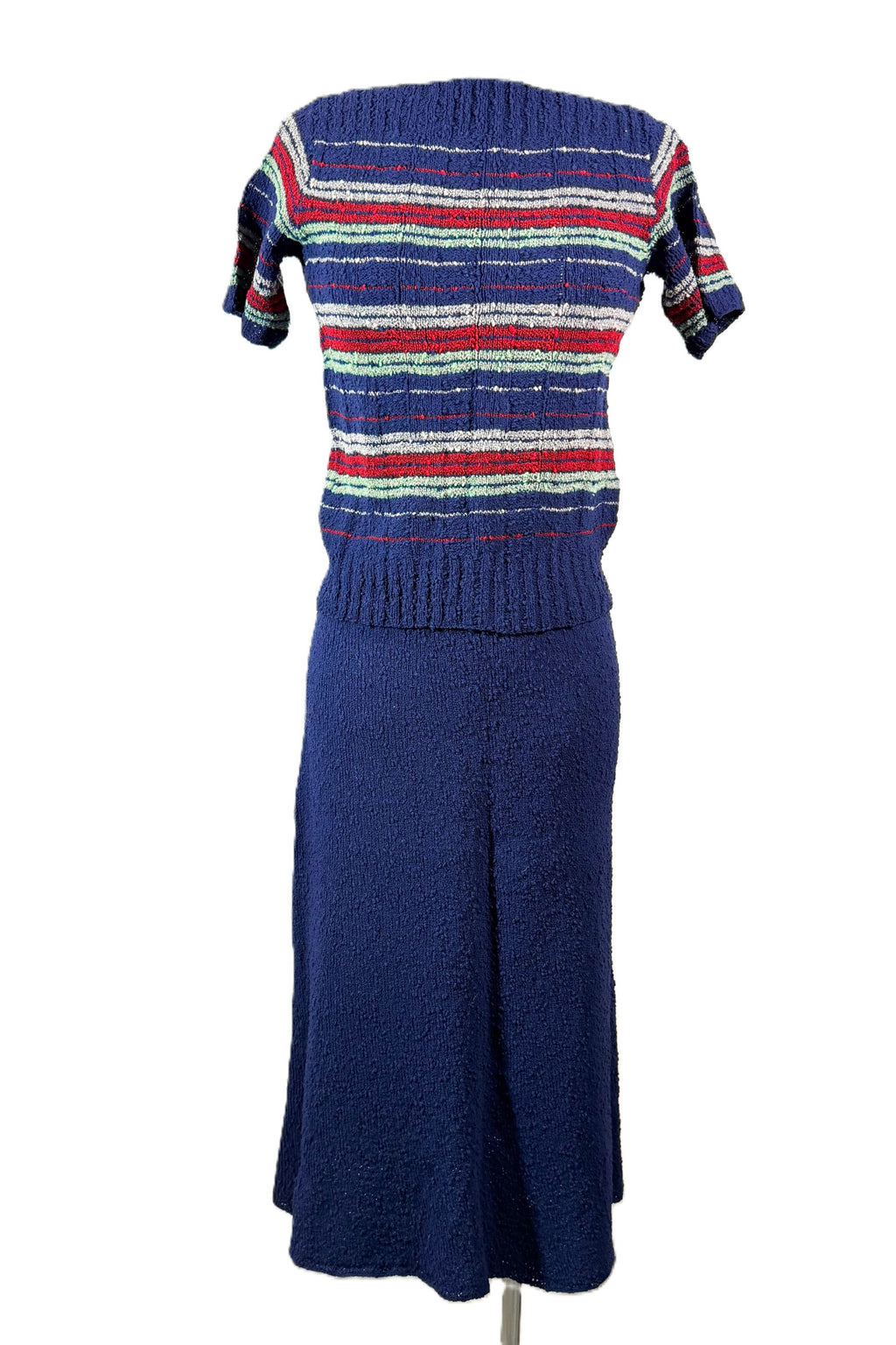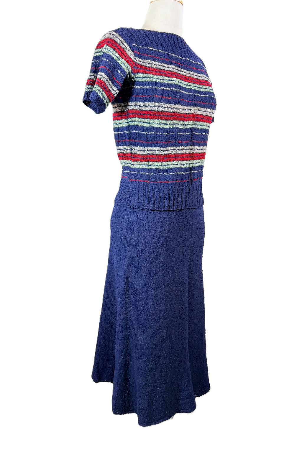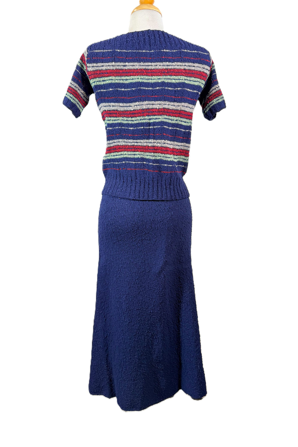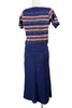 Short sleeve pullover top with stripes, slim A line skirt with elastic waist.