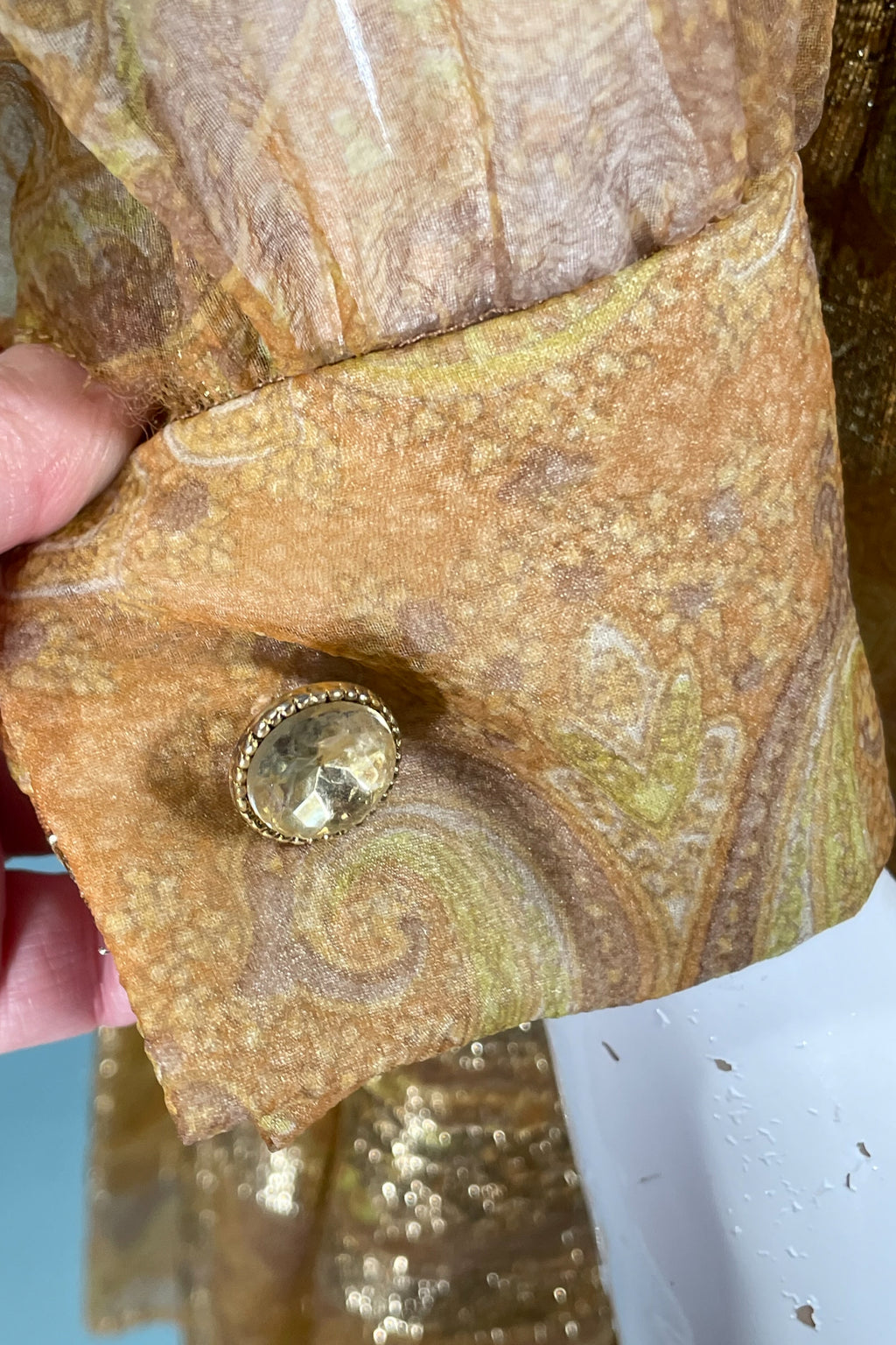 Large collar, semi sheer paisley pattern with metallic gold accents.