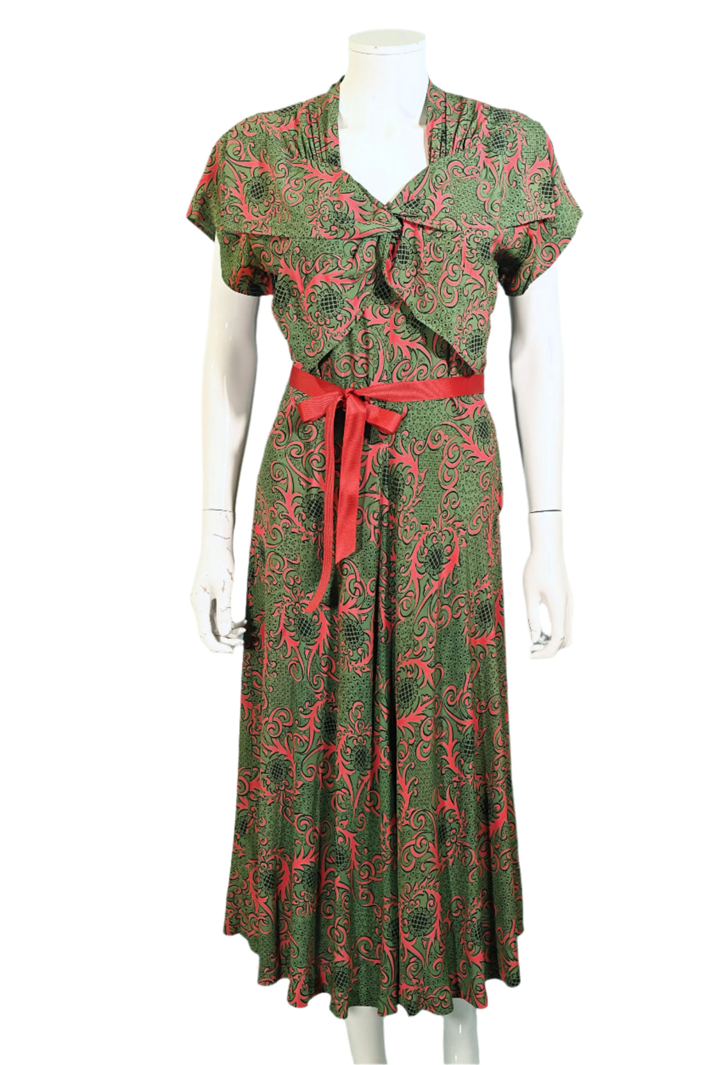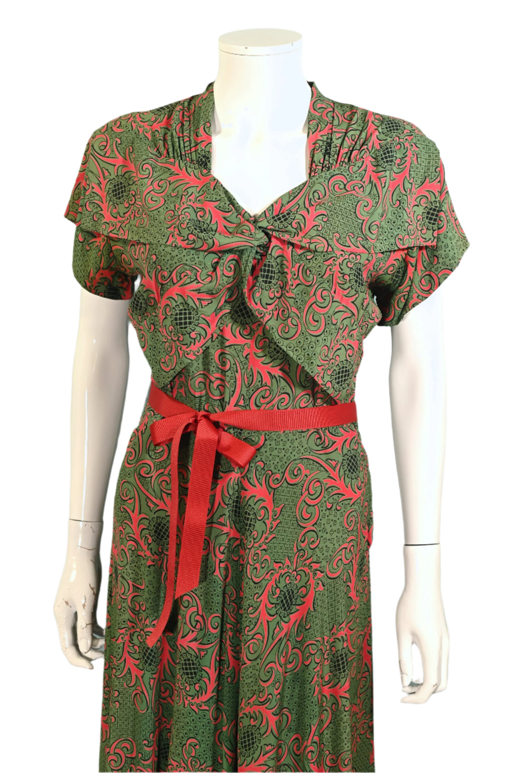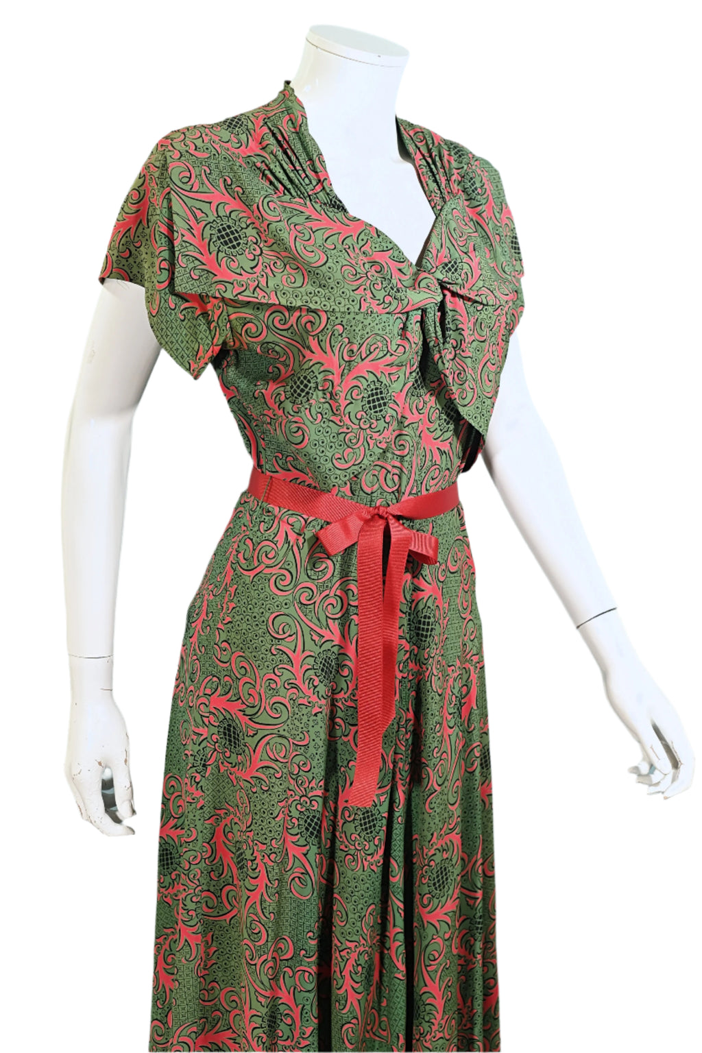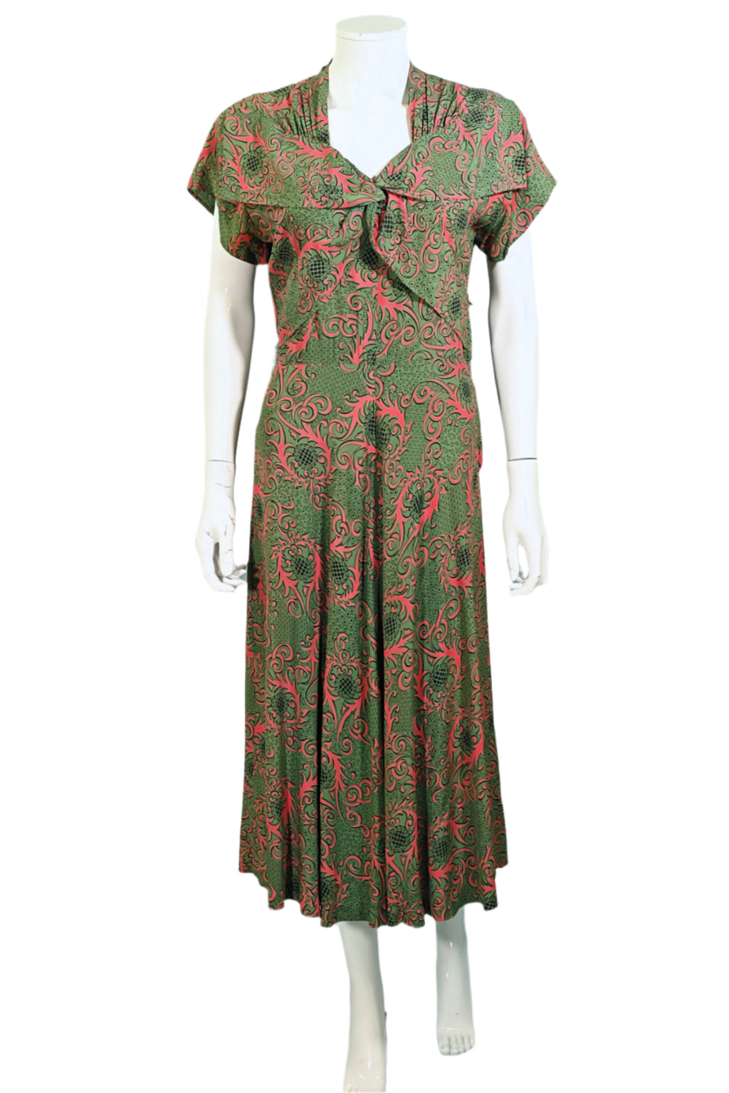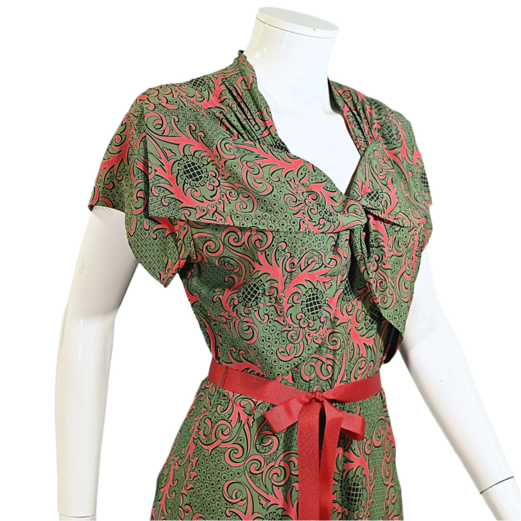 Vintage 40s dress with fitted waist, gathers on the shoulders and draped front.