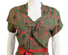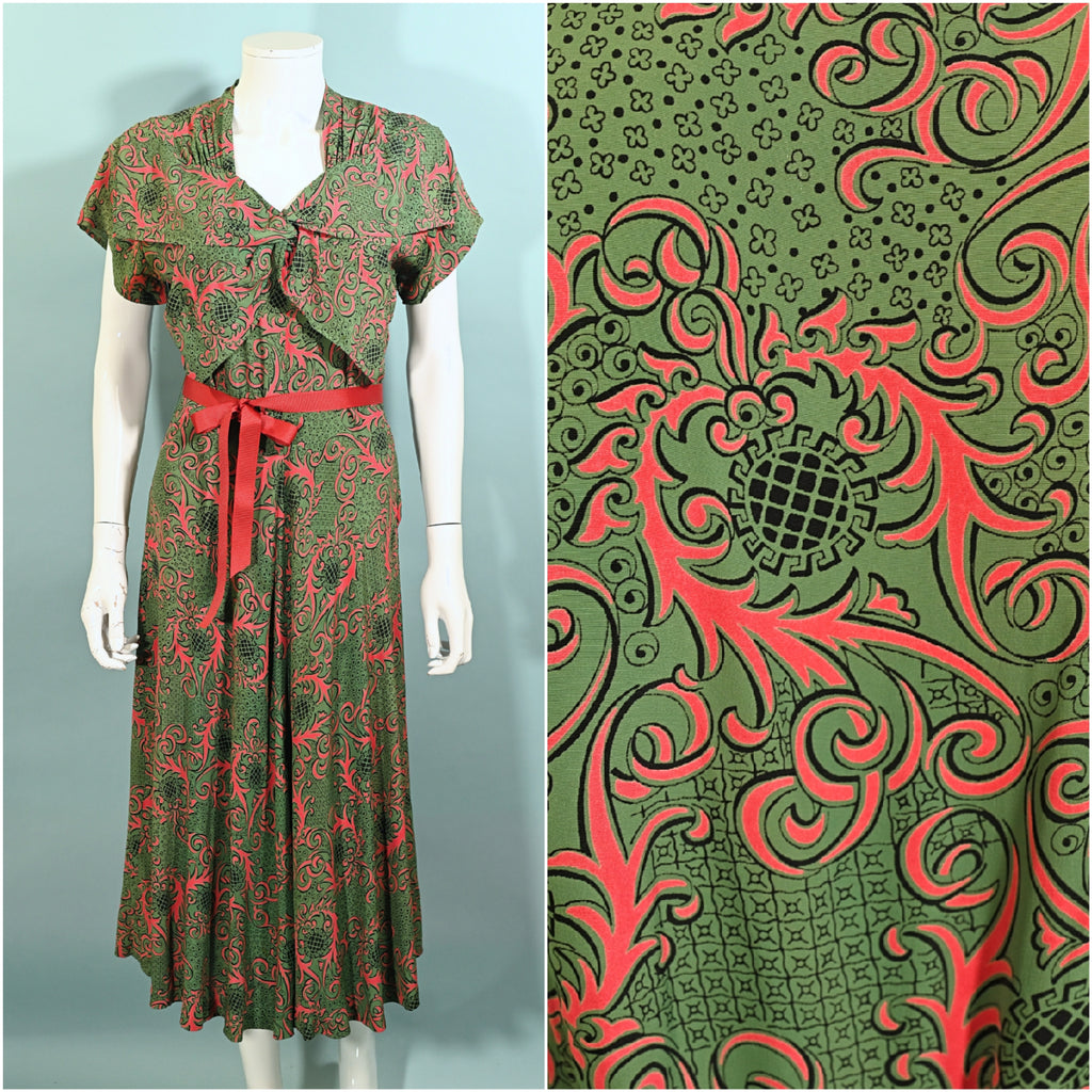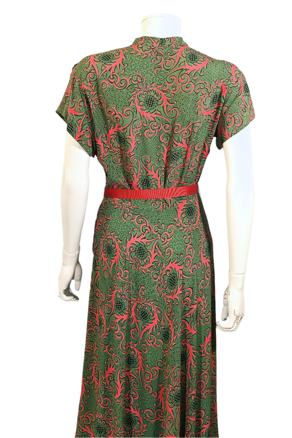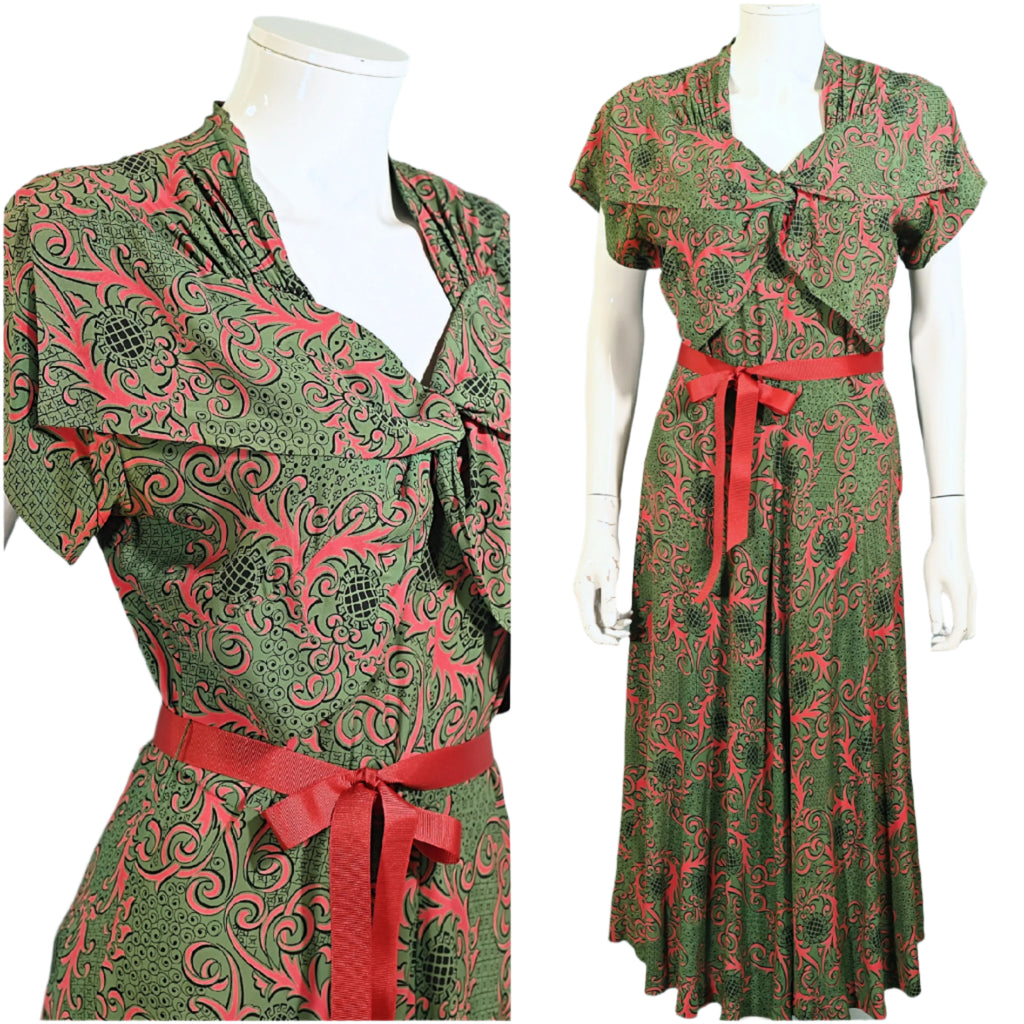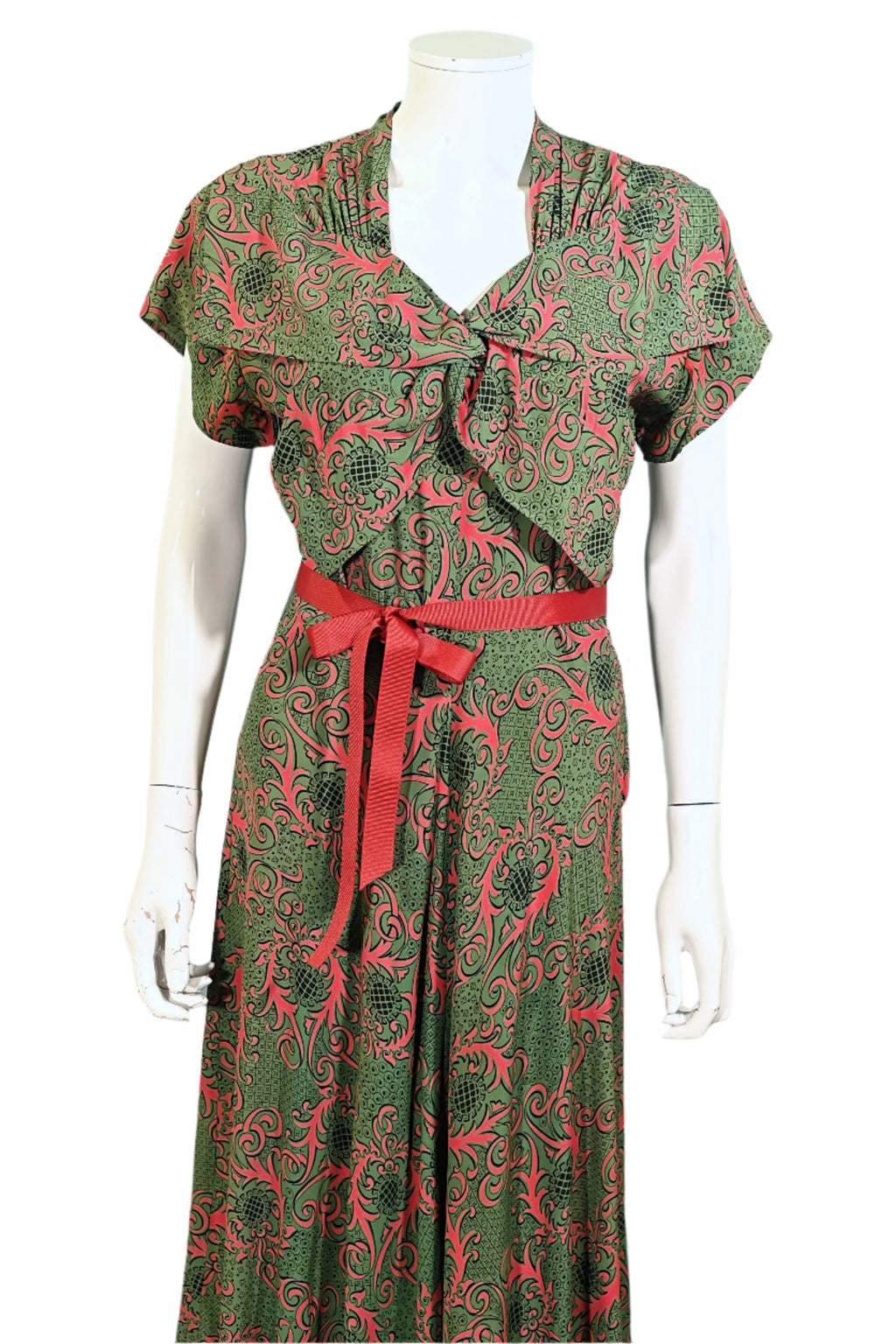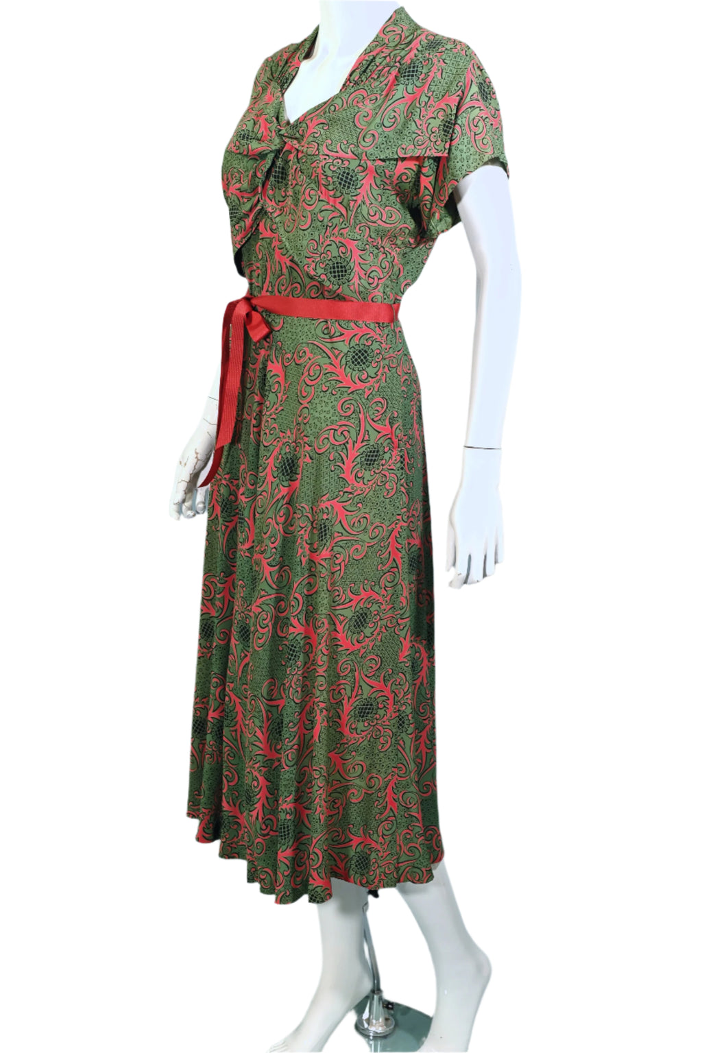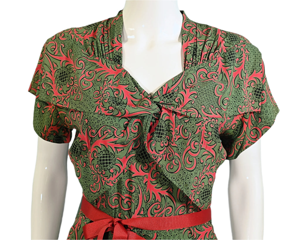 Vintage 40s dress with fitted waist, gathers on the shoulders and draped front.