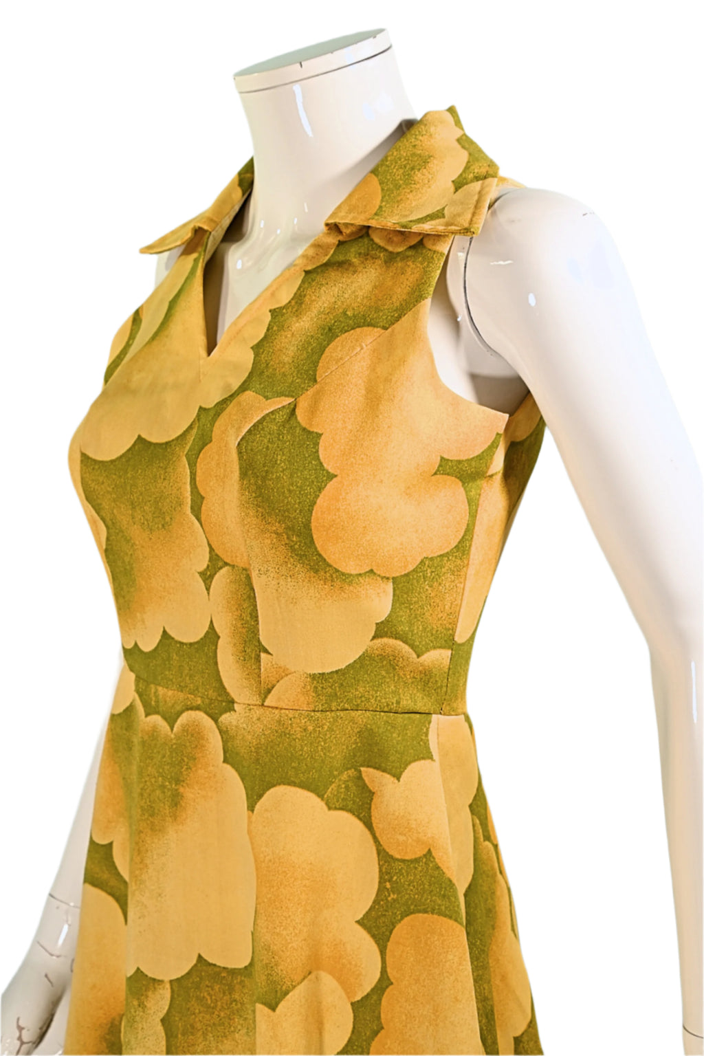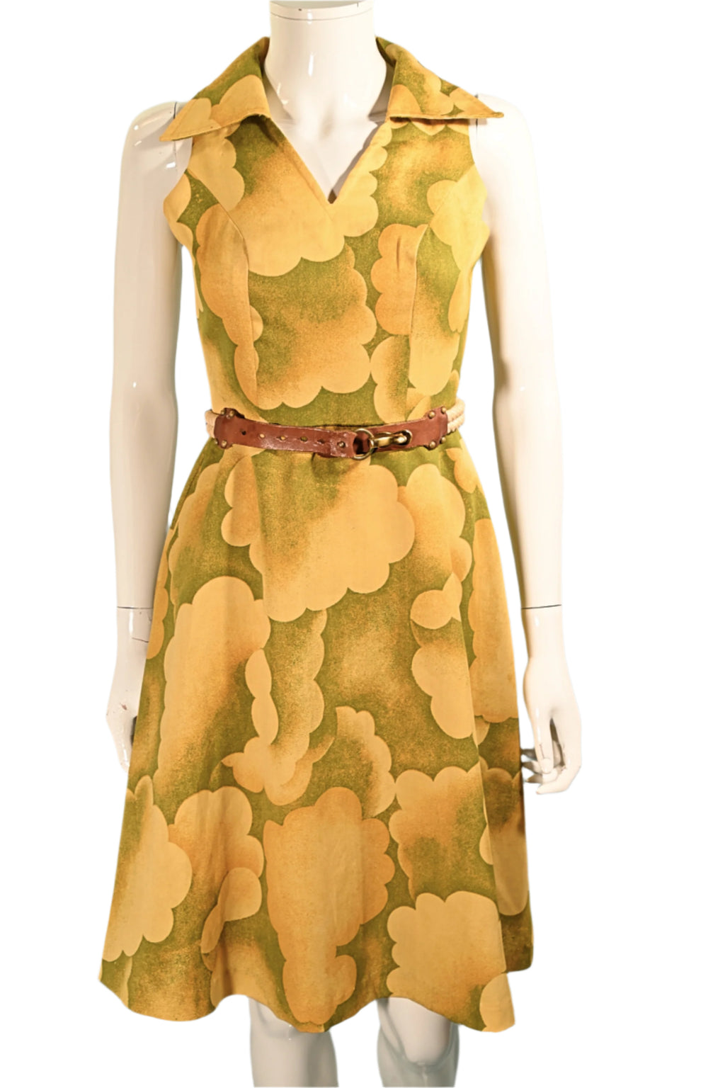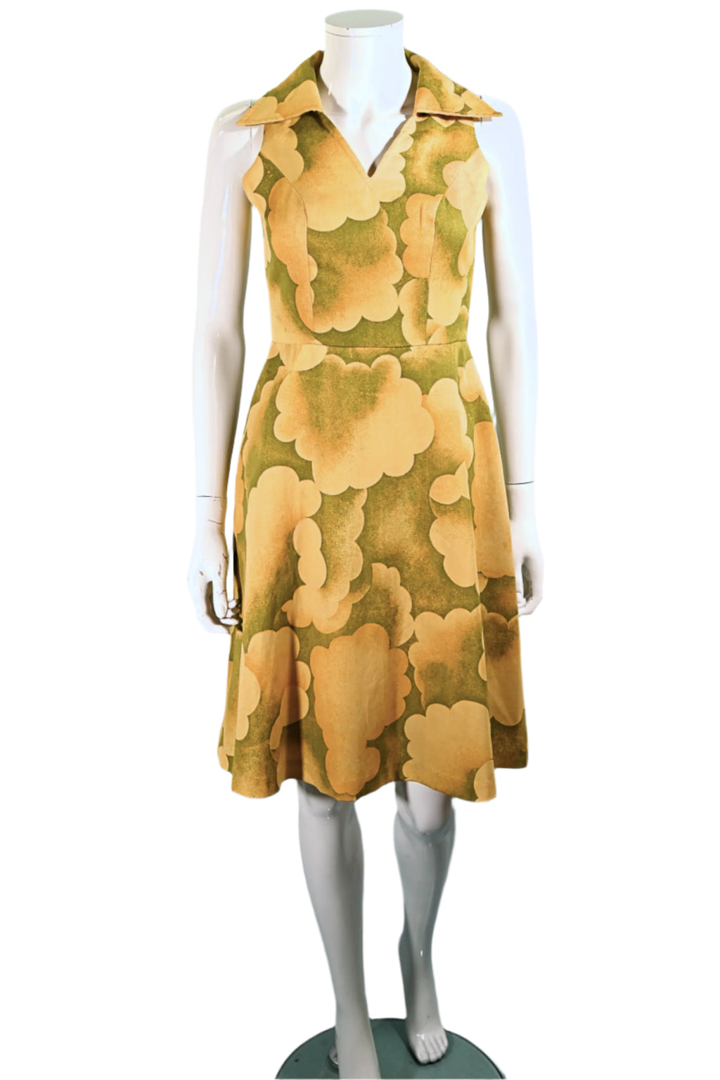 Vintage 60s dress with V neckline, large pointed collar, sleeveless.