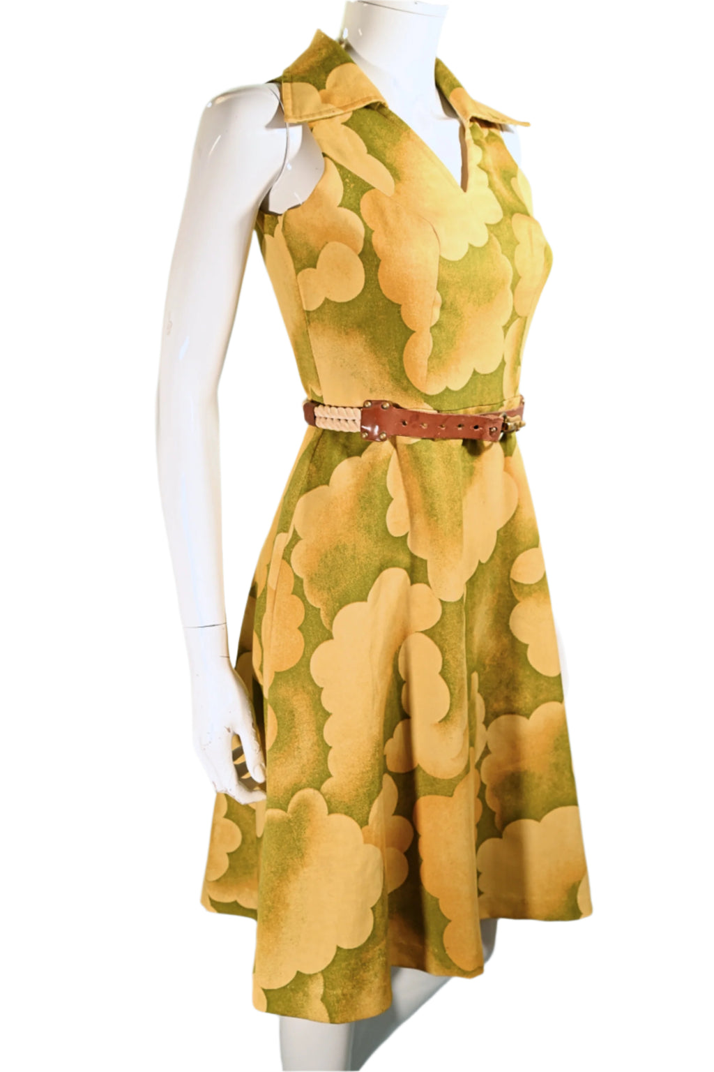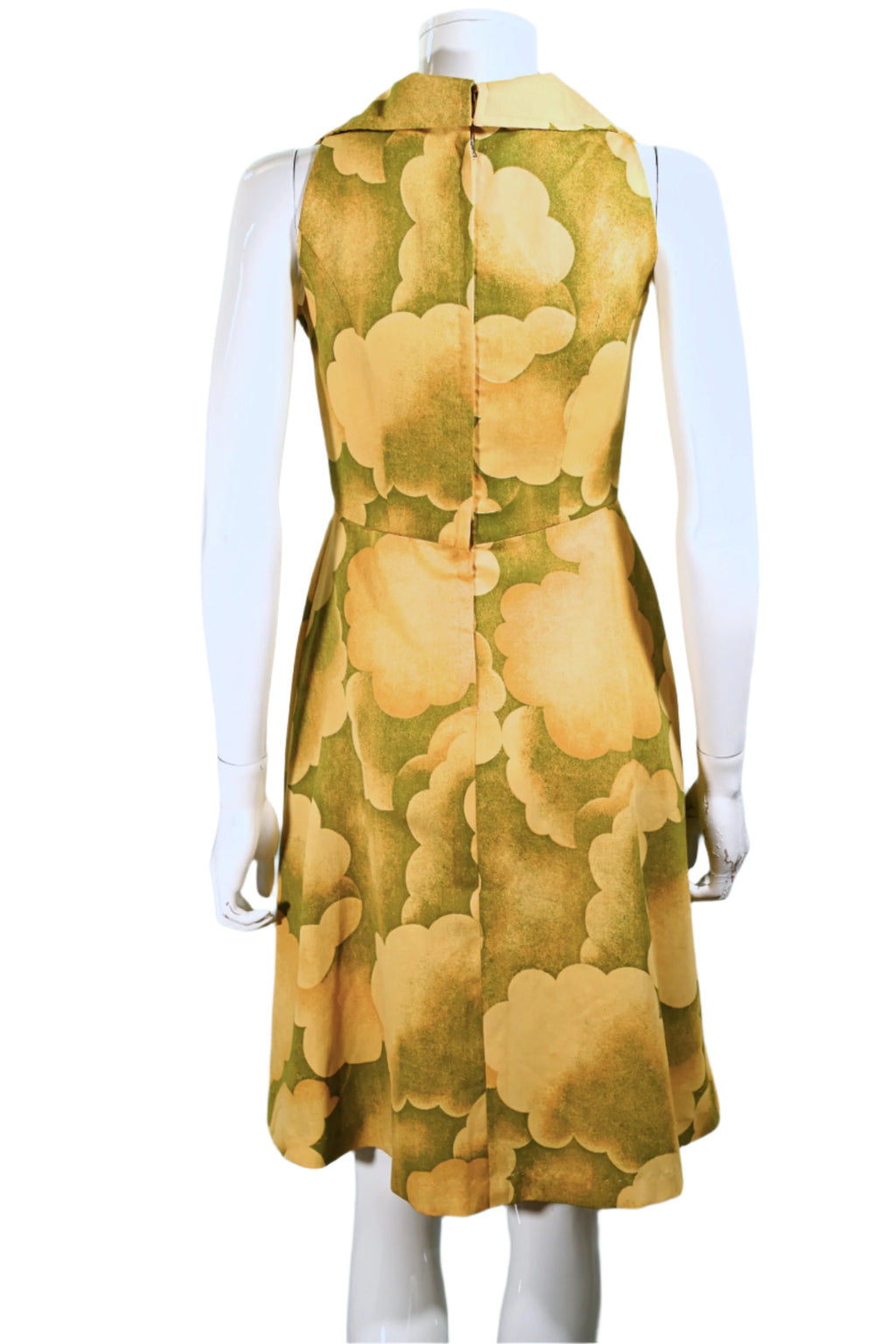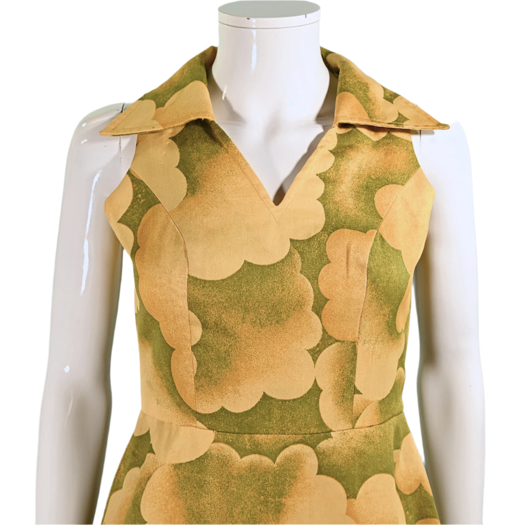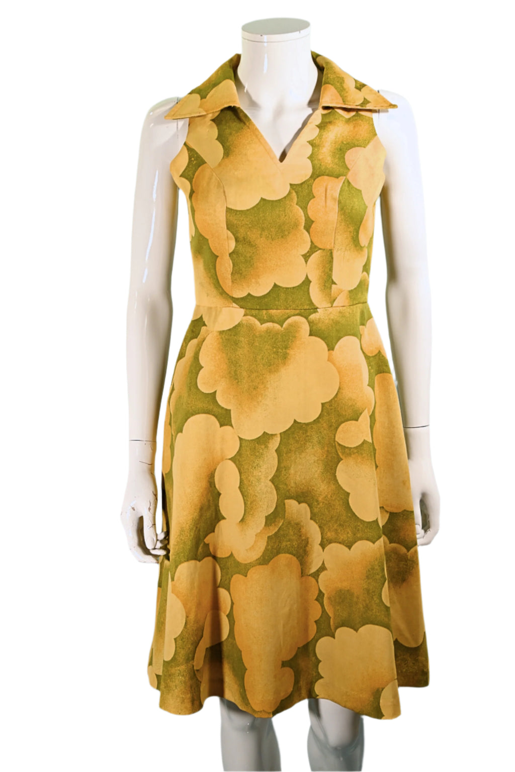 Vintage 60s dress with V neckline, large pointed collar, sleeveless.