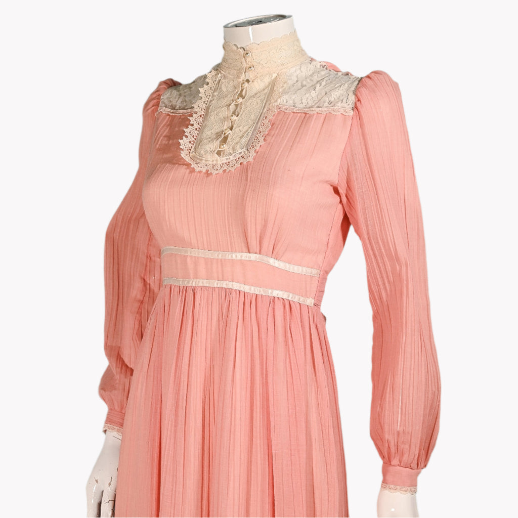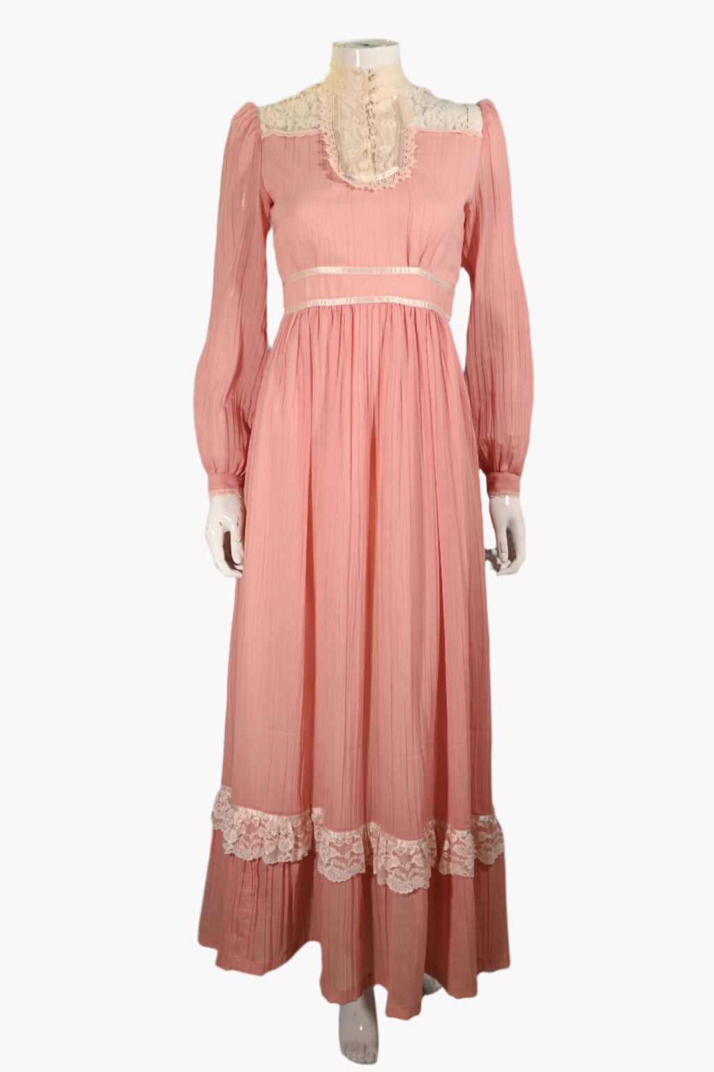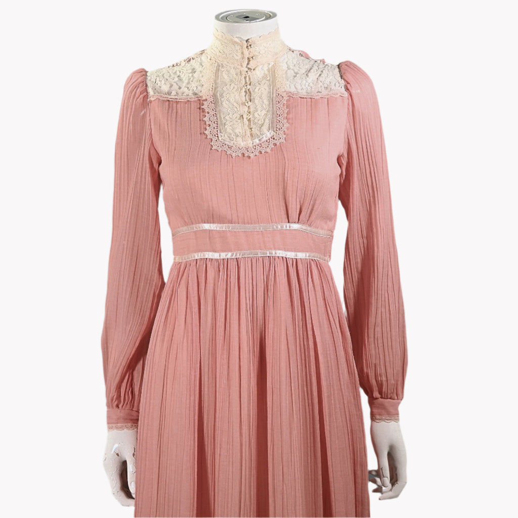 Vintage genuine Gunne Sax maxi dress with long puff sleeves, high lace neckline, sash tie belt at the back.