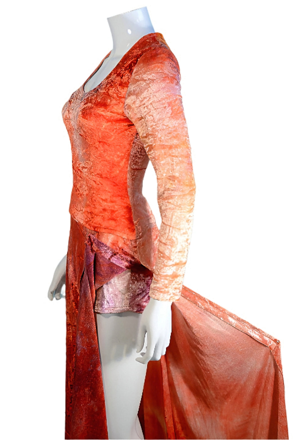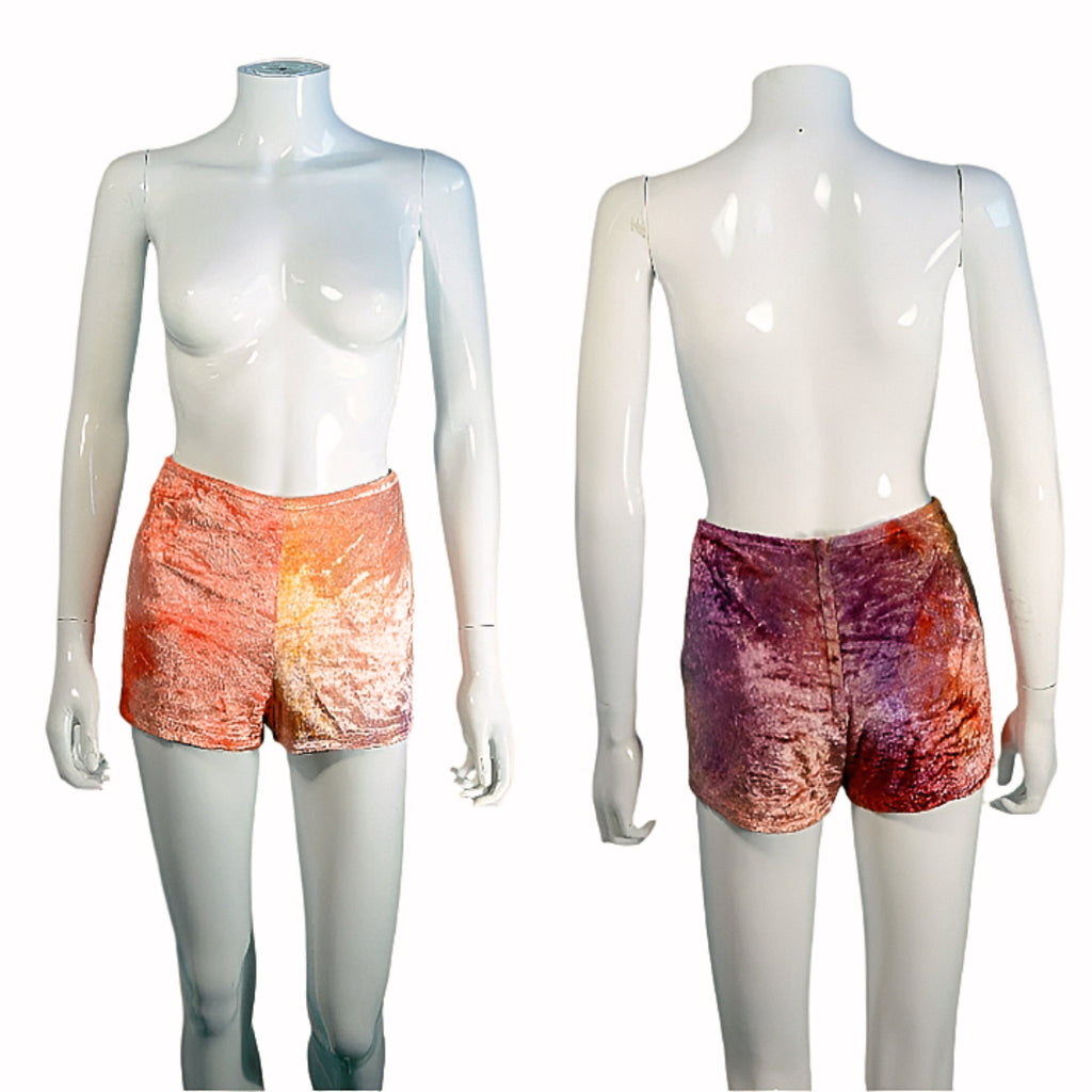COLOR: Multicolored tie-dyed velvet - peaches, purples, pinks.