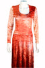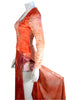 Dress is fitted at the top with long sleeves and slits at the sides.