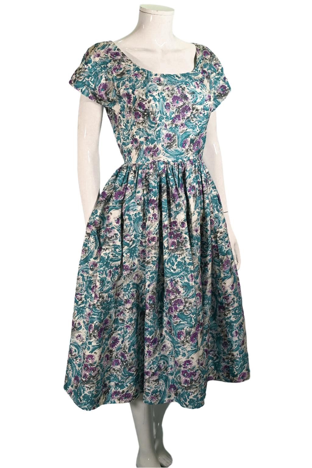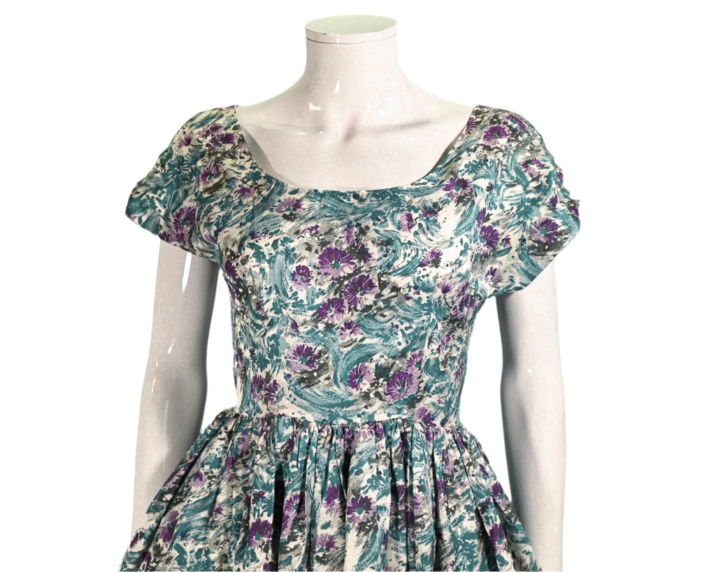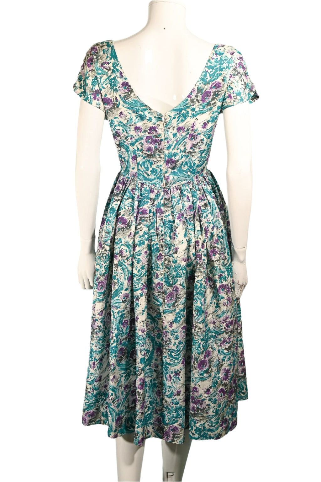 50s Teal Purple Floral Dress, Fit and Flare Fitted 26" Waist