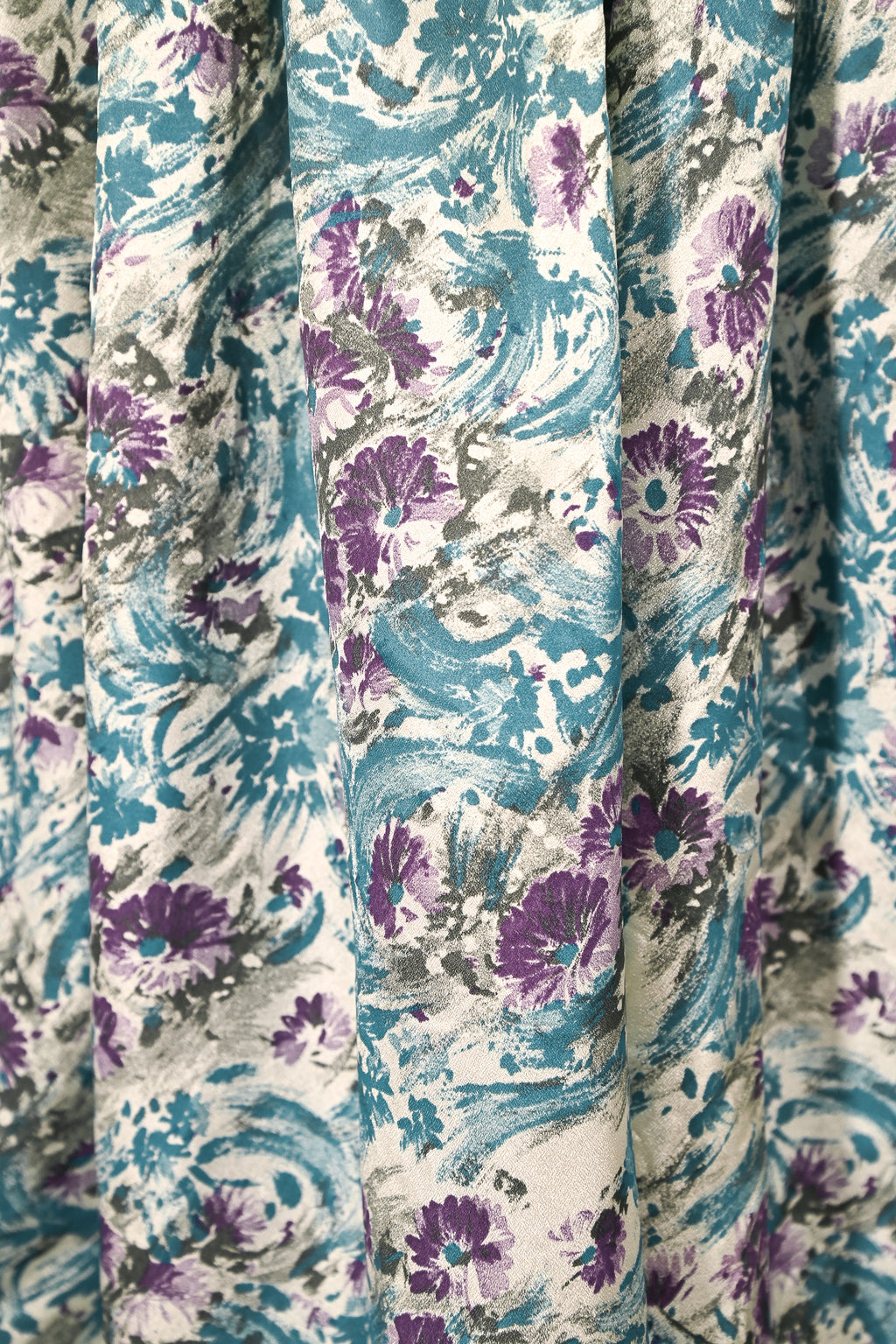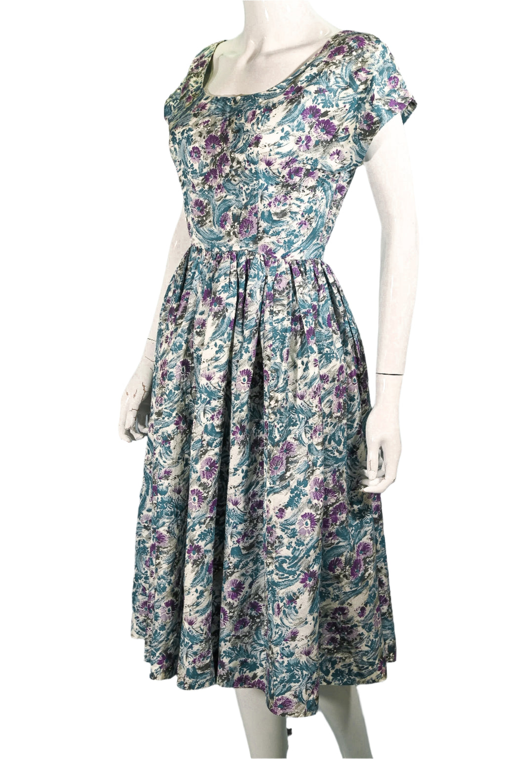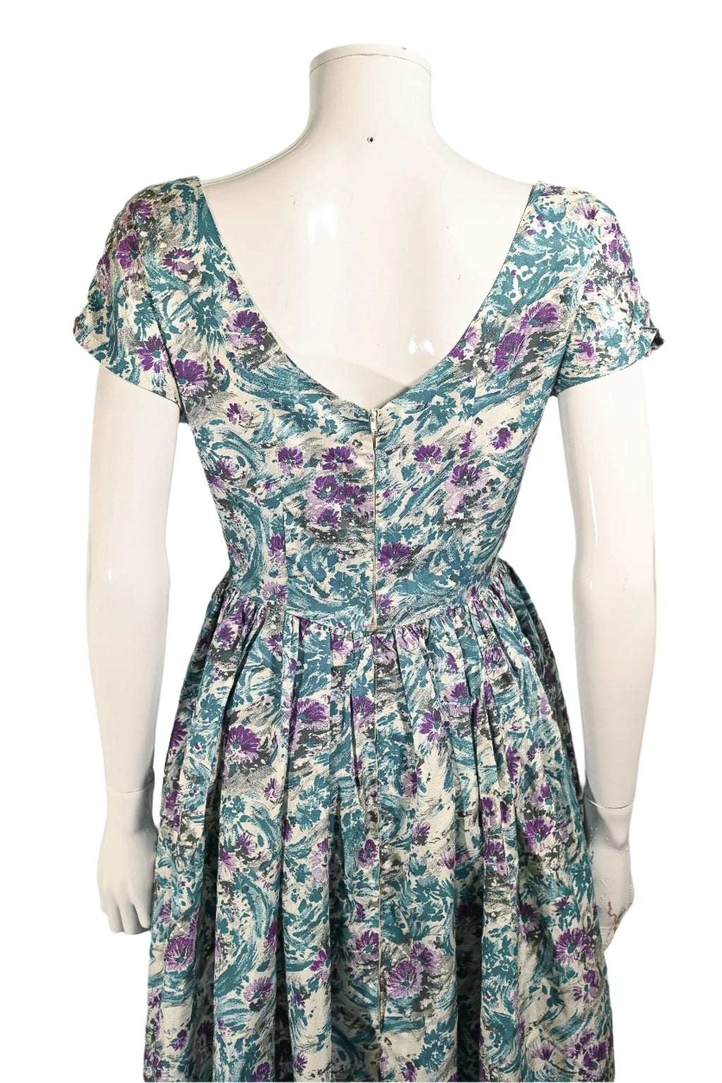 50s Teal Purple Floral Dress, Fit and Flare Fitted 26" Waist