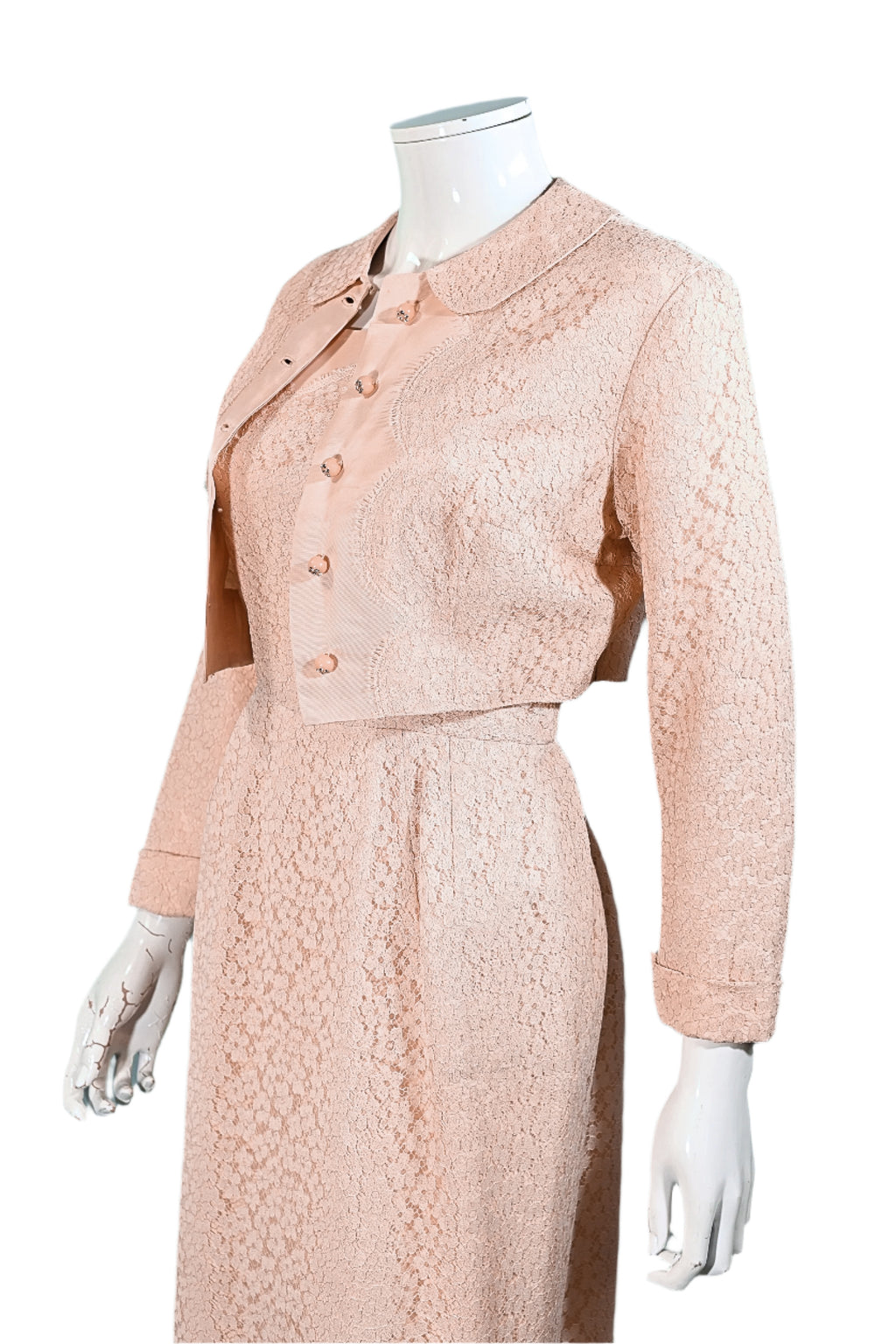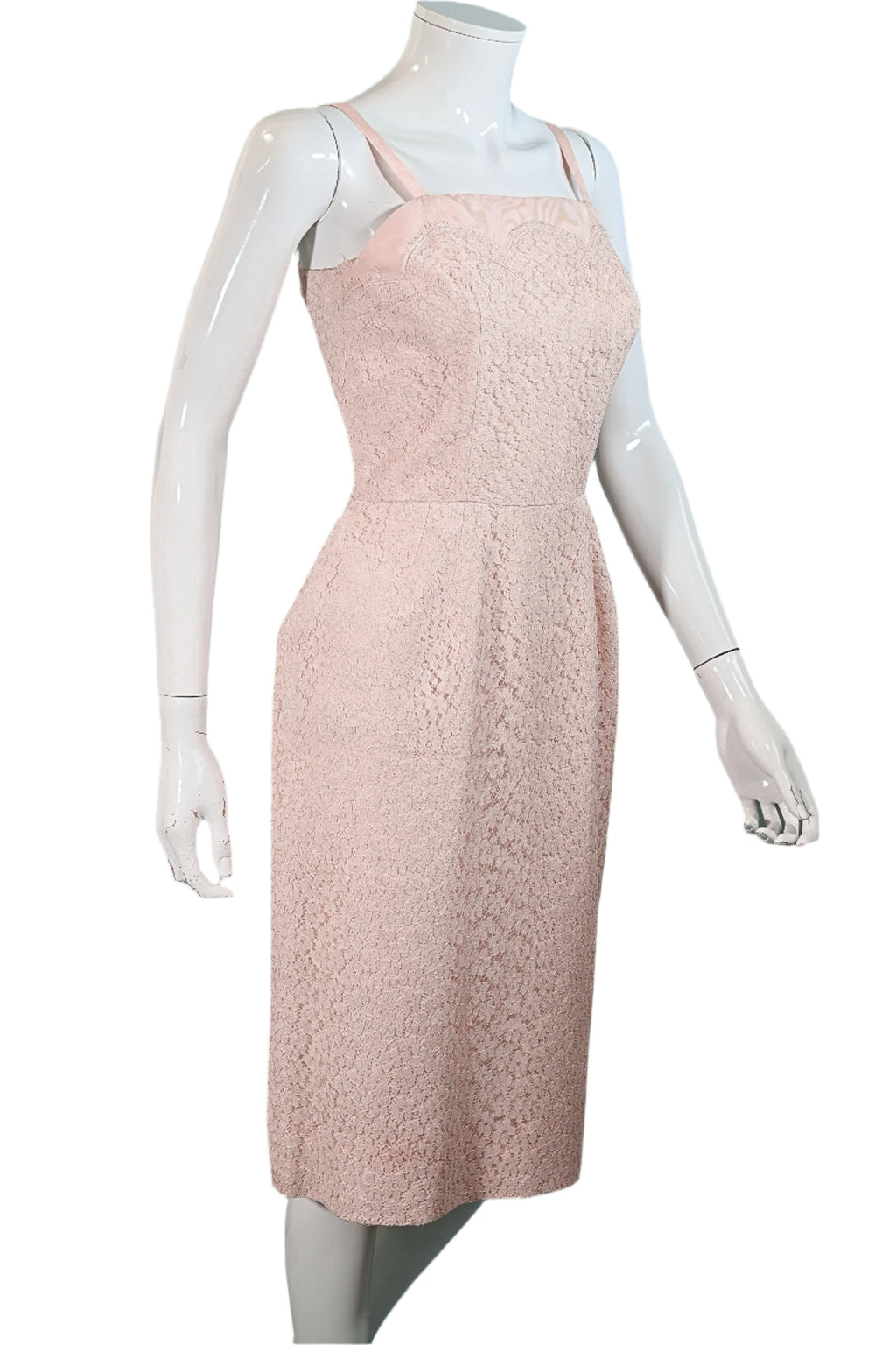 Strappy 1950s lace dress with a fitted waist, darts at bodice/bust to allow room for bust.