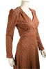 V neckline, long sleeves with a little slit on the inside wrist, flared skirt.
