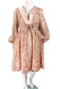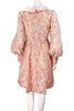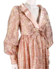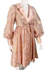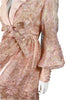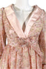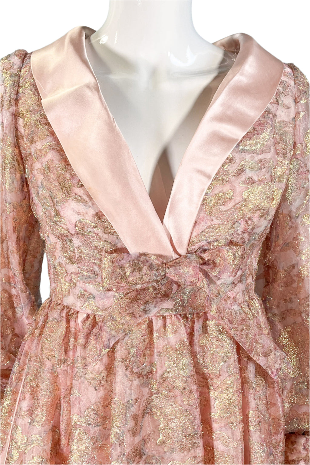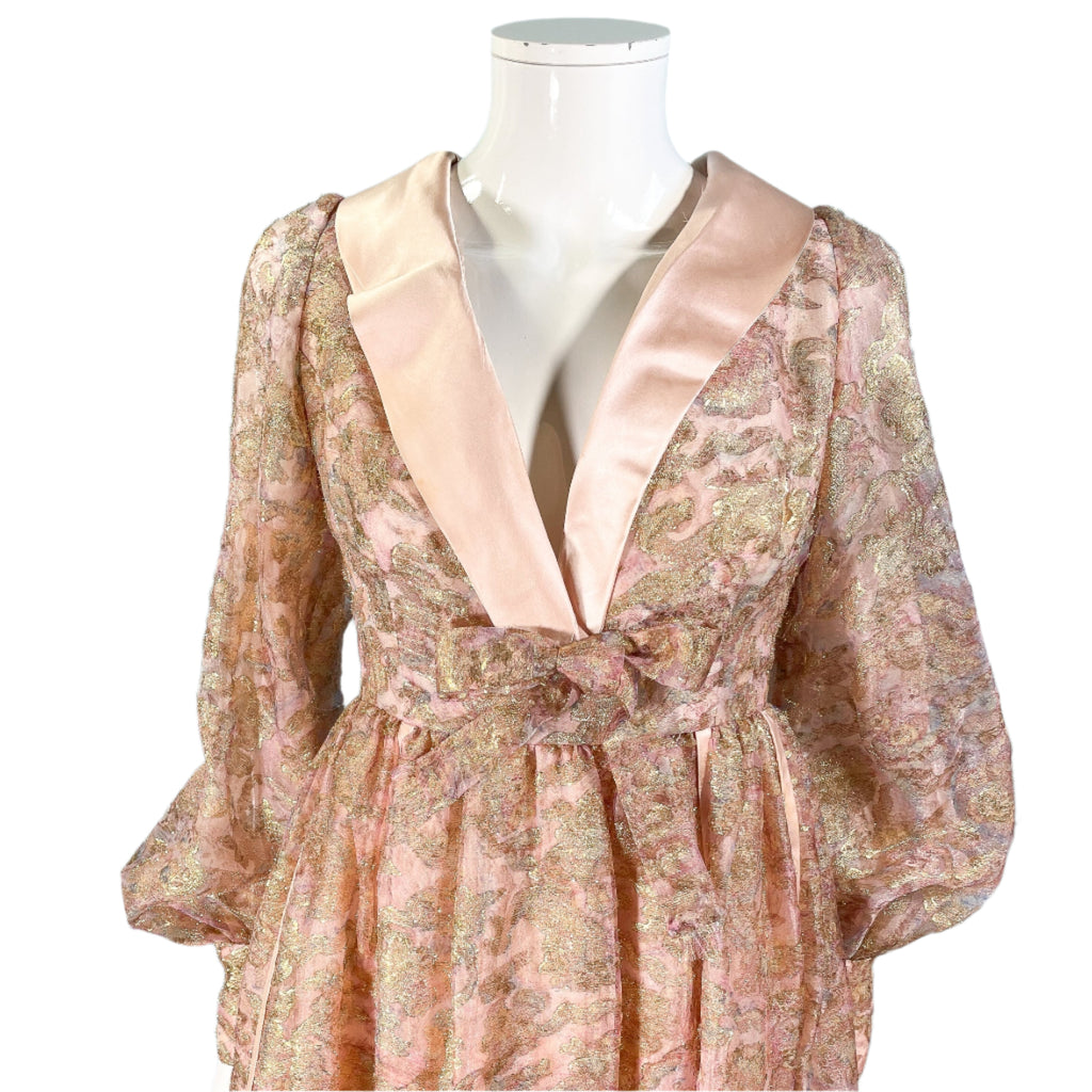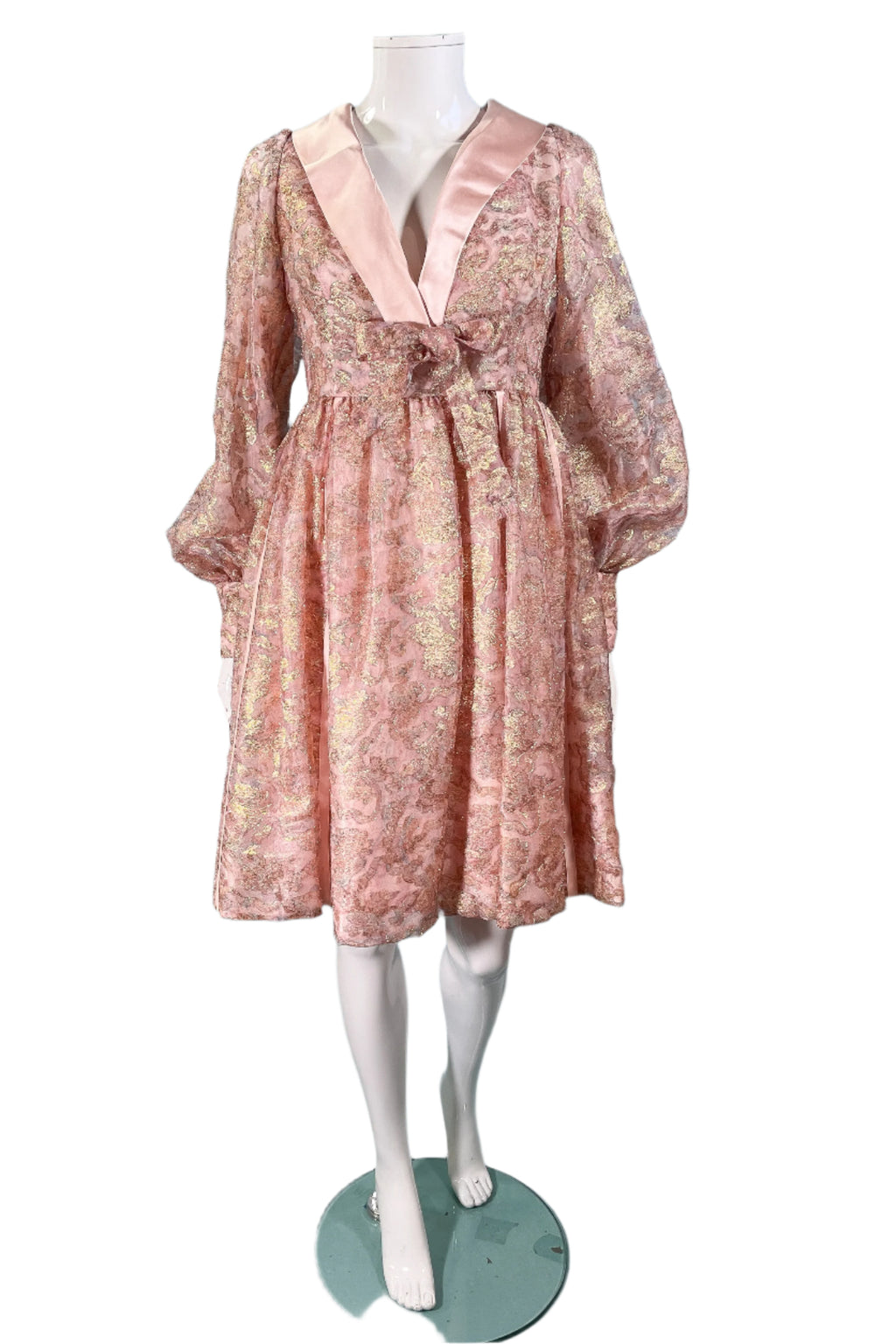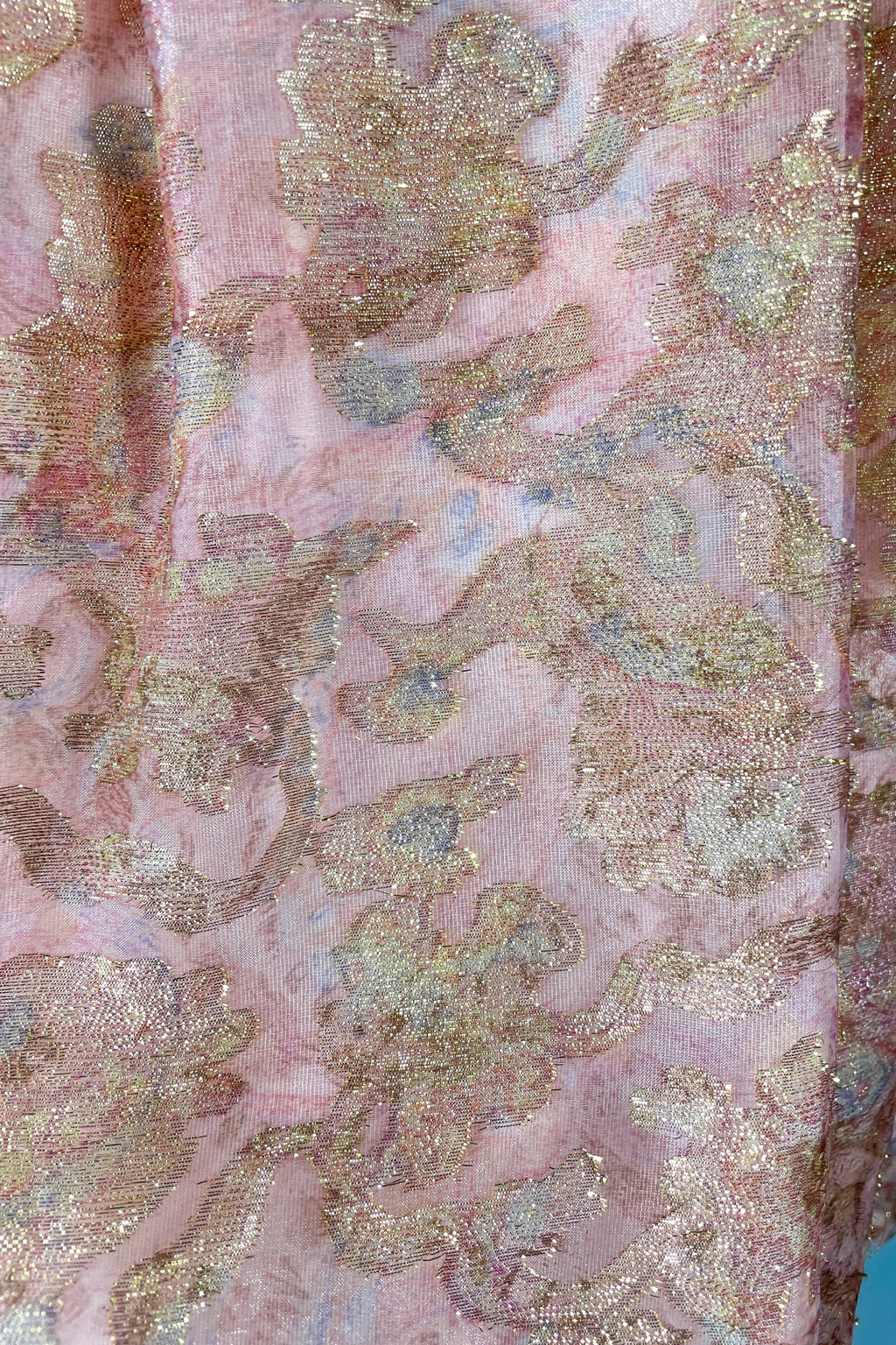 The fabric is semi sheer pink with blue and metallic gold accents.