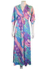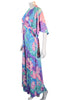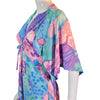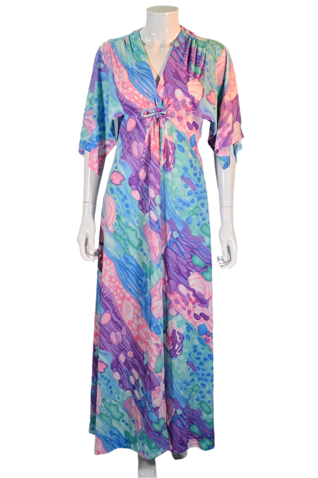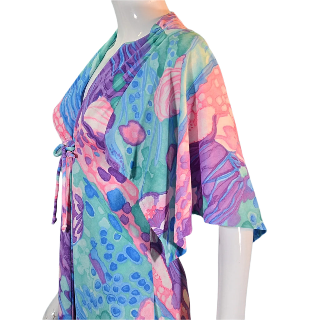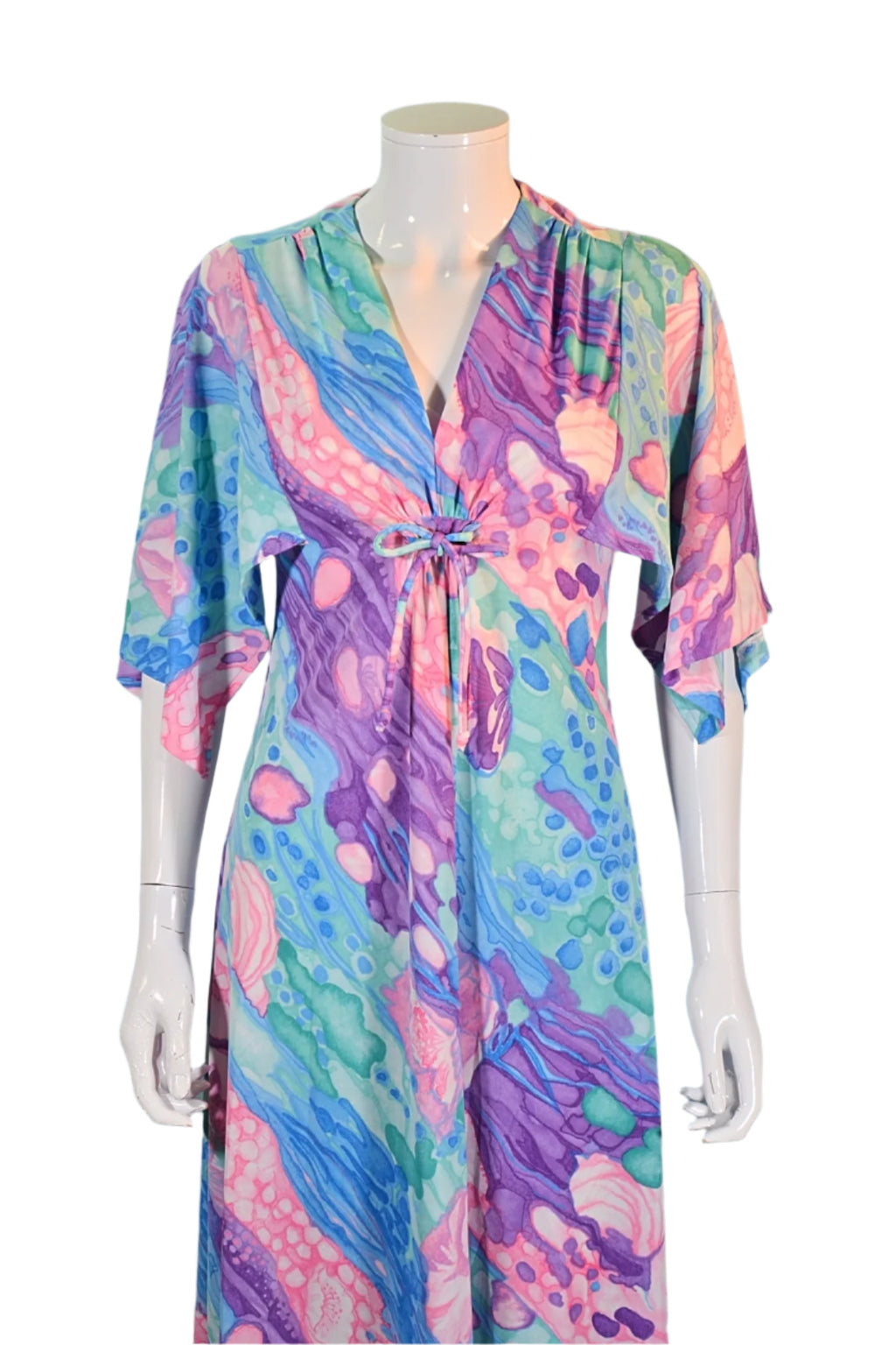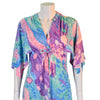 V neck, ties under the bustline creating a looser fit and draping at the front near the waist.