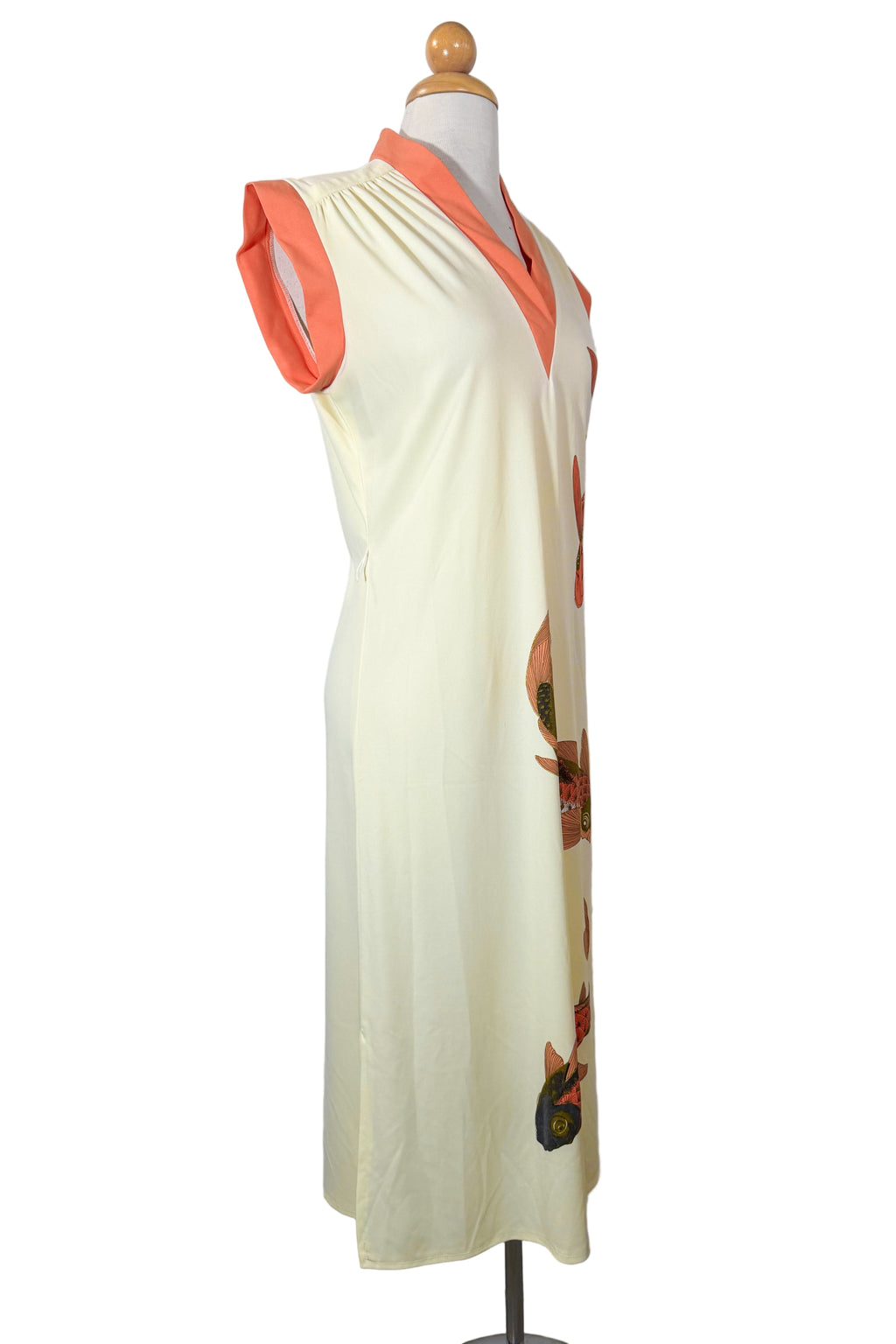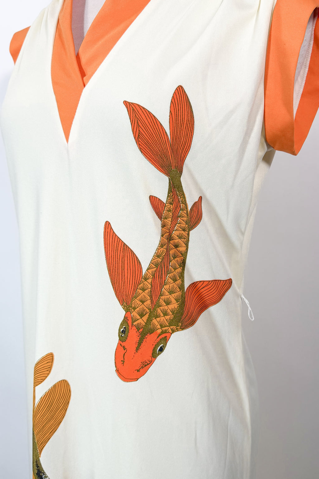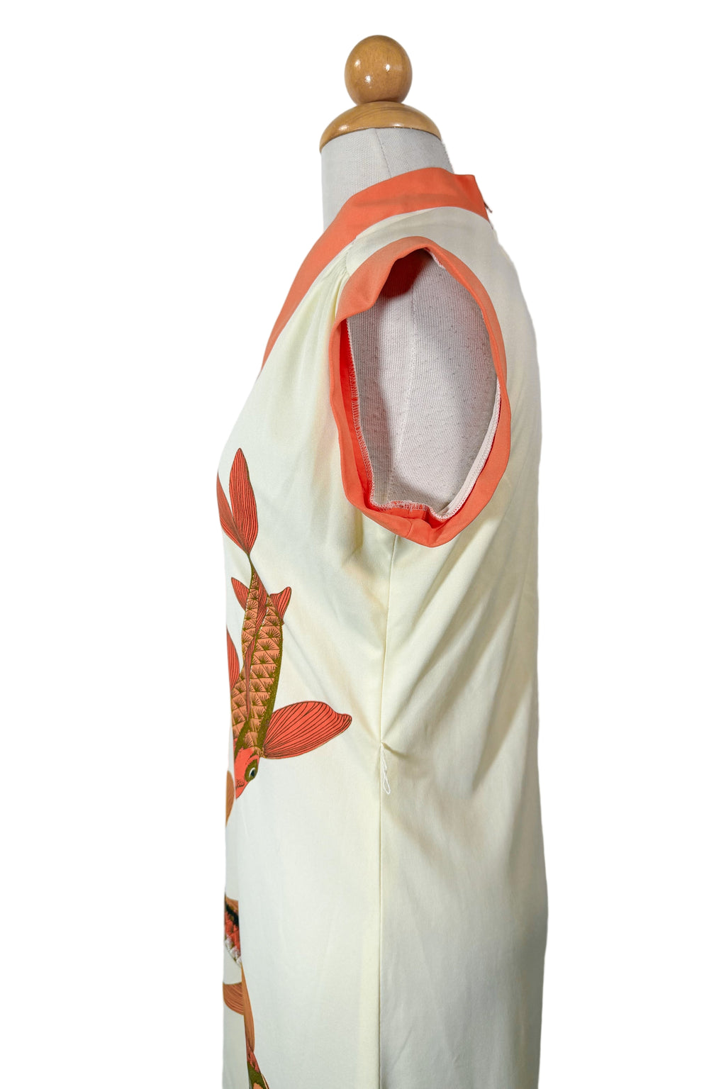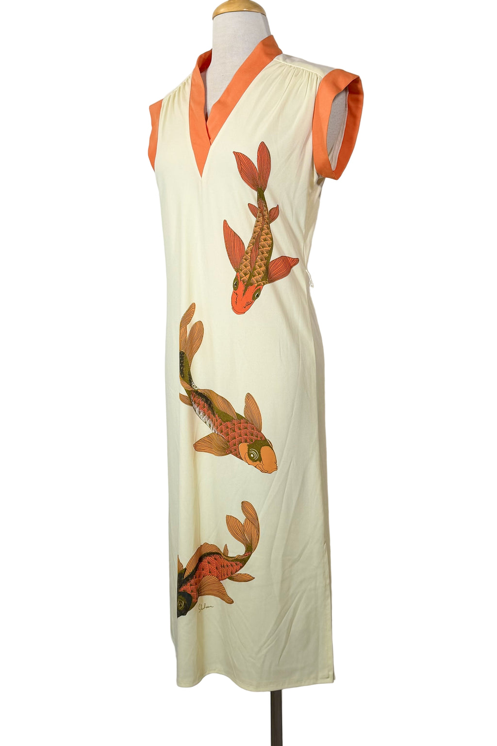 Vintage Alfred Shaheen dress with V neck, cap sleeves and swimming koi fish.