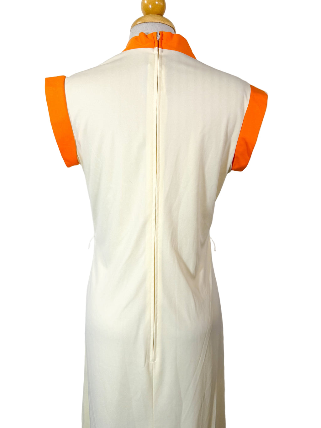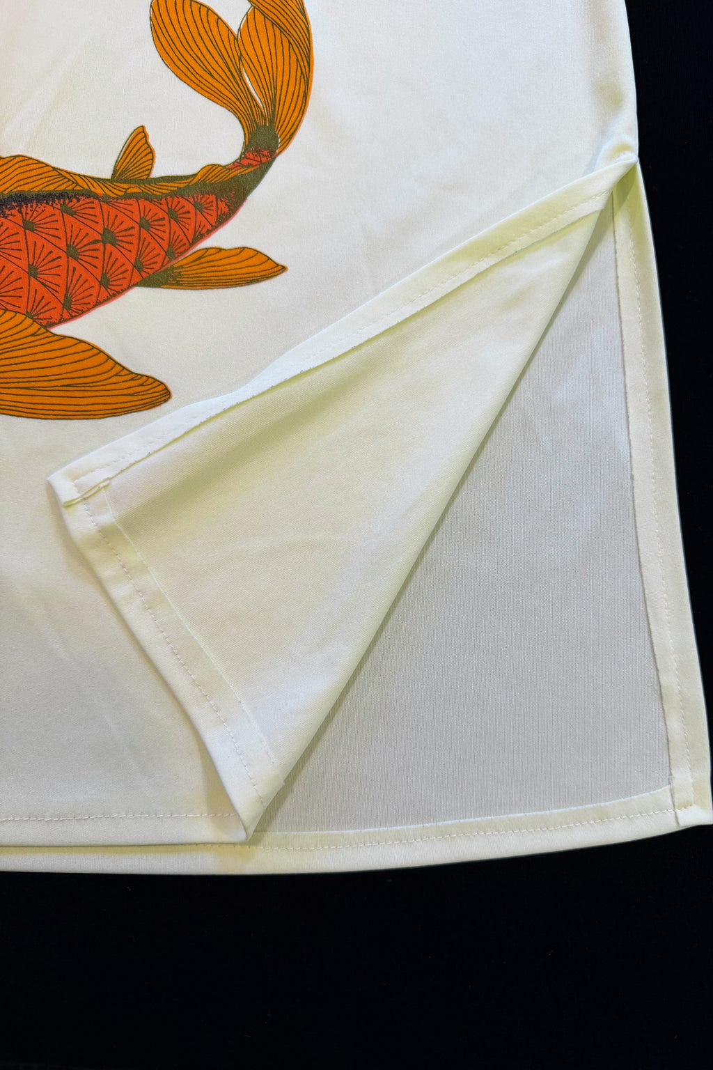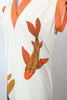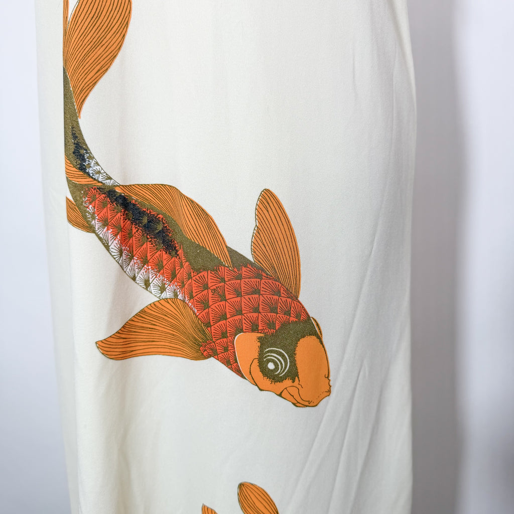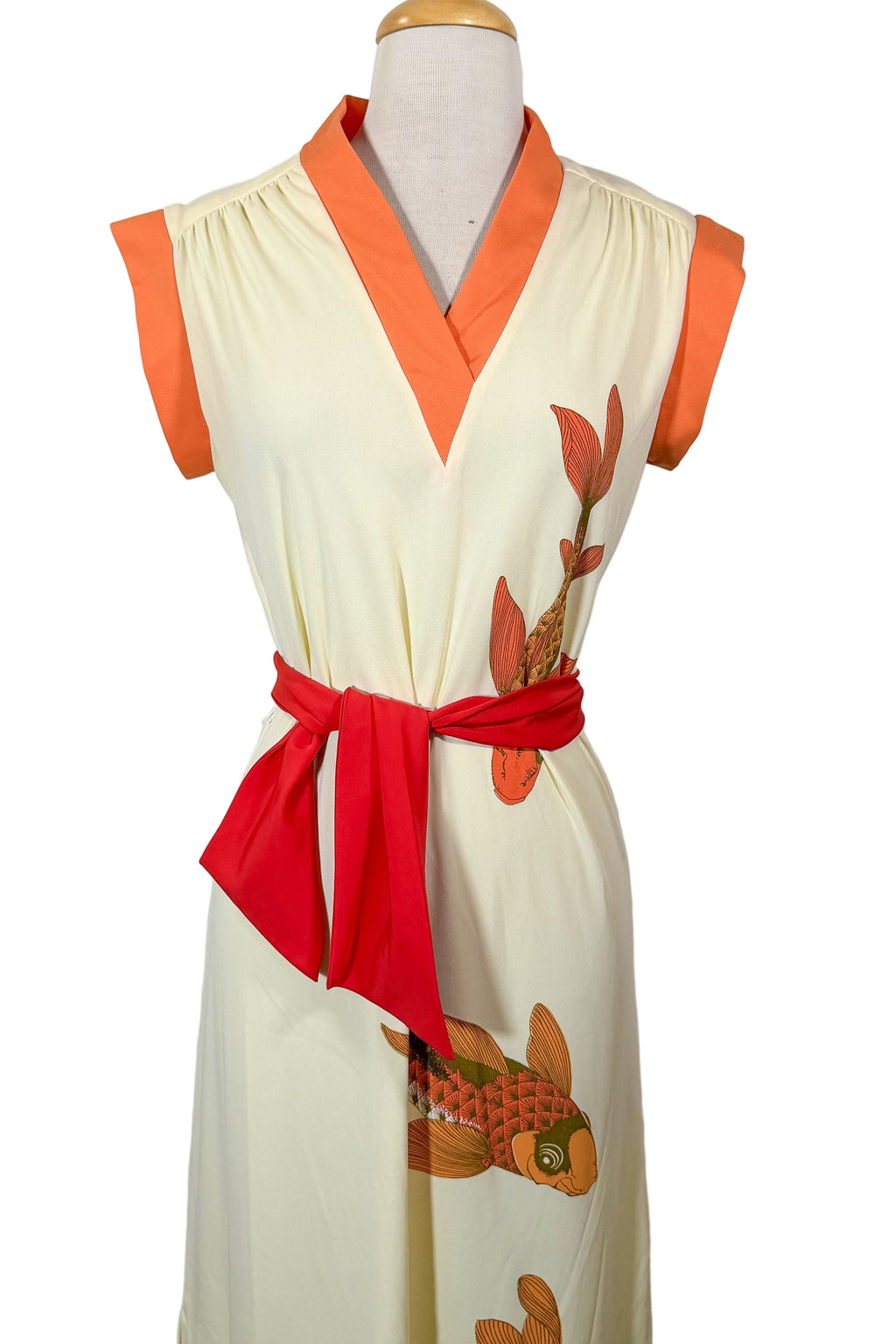 Vintage Alfred Shaheen dress with V neck, cap sleeves and swimming koi fish.