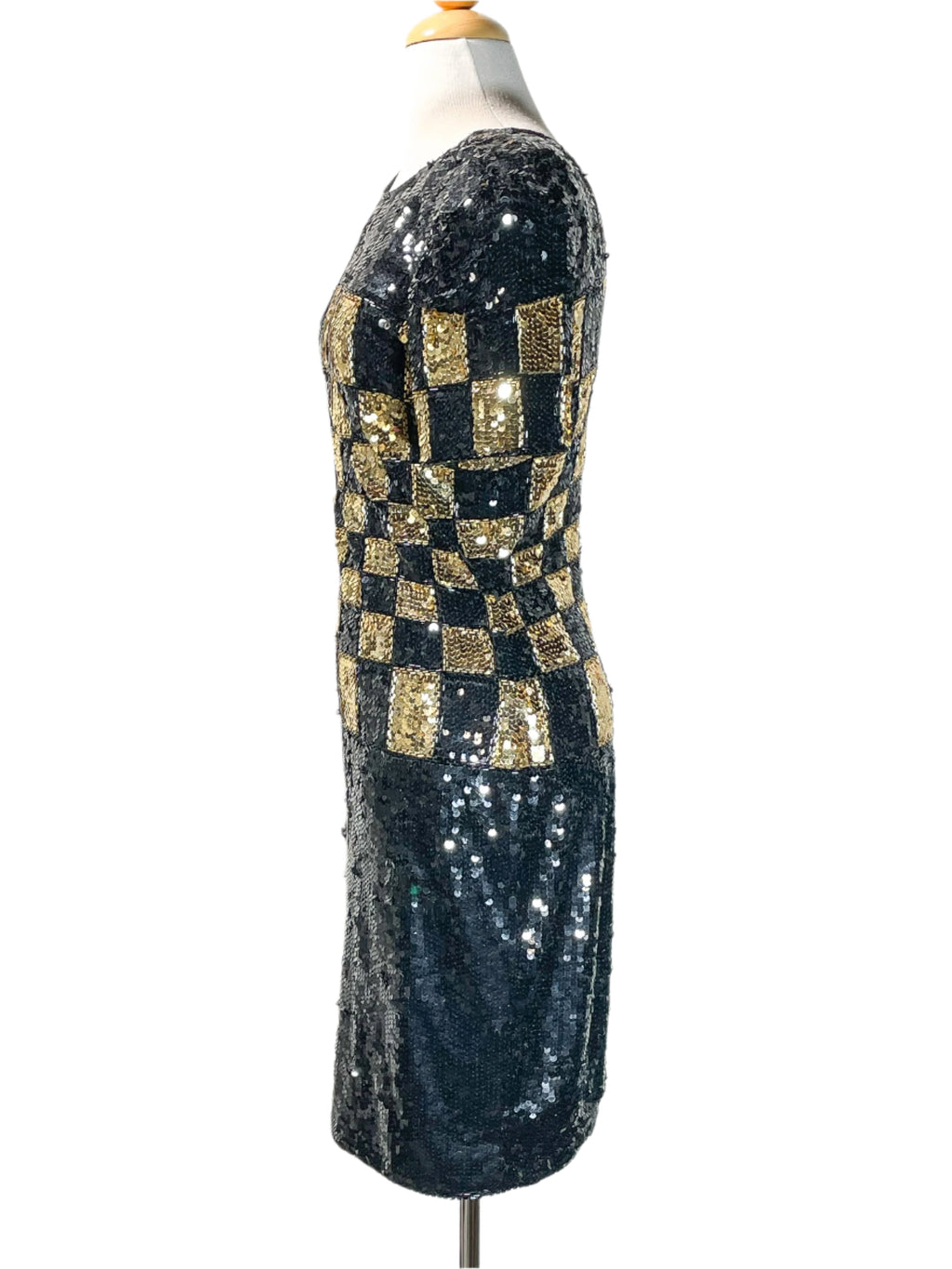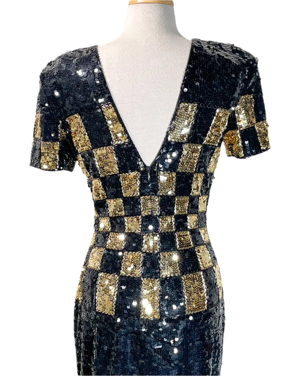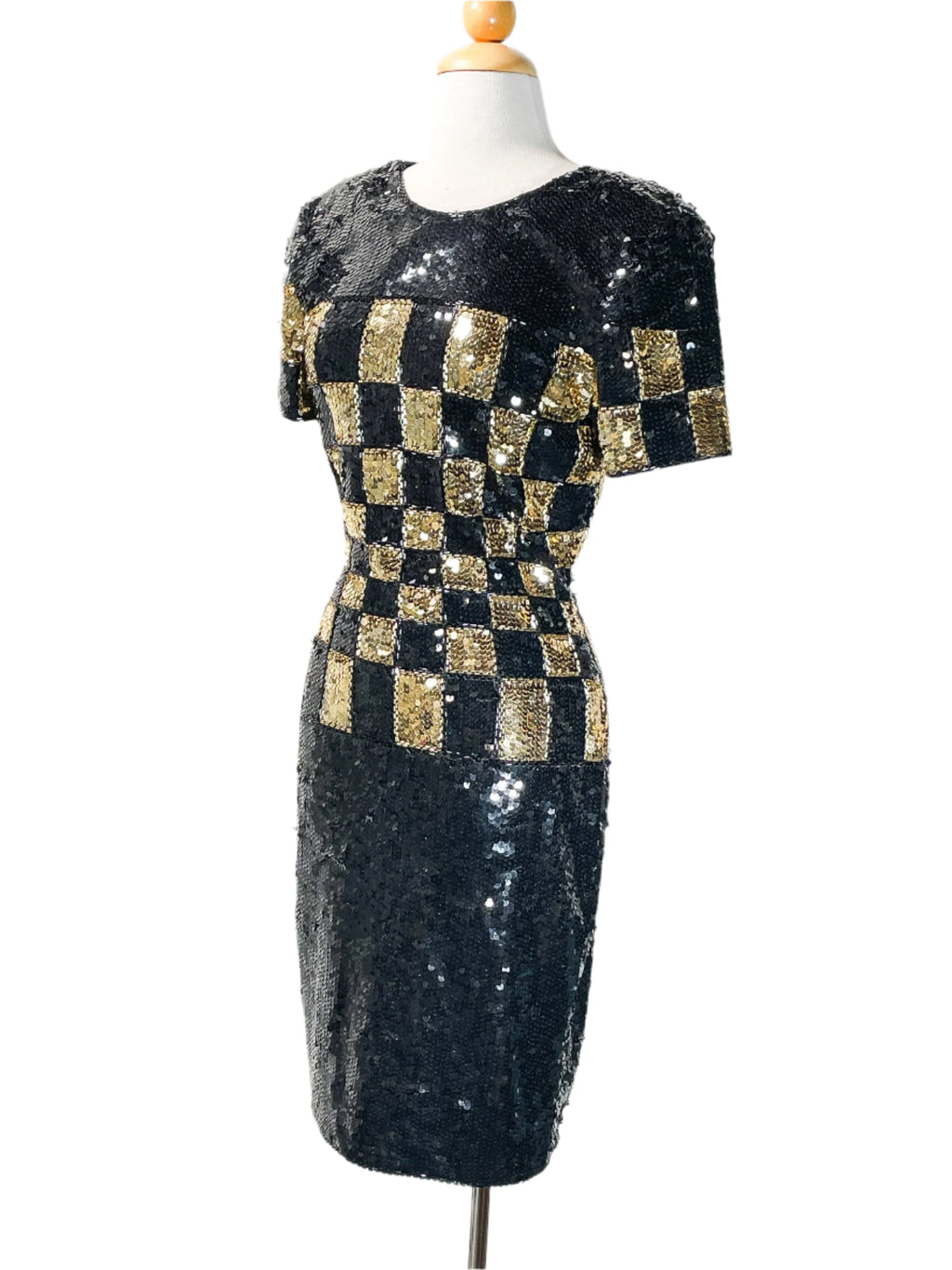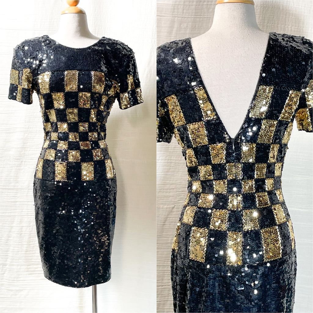 Vintage Tadashi Sexy Black + Gold Sequin Party Dress S/XS