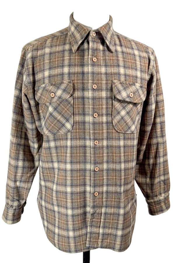 Vintage Pendleton Woolen Mills Shirt, Beige Brown Blue Wool Plaid Board Shirt L
