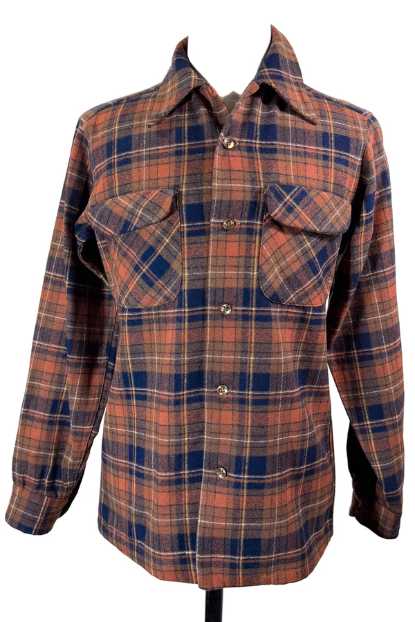 Vintage Pendleton Wool Plaid Board Shirt, Rust/Blue/Brown Plaid + Pockets S