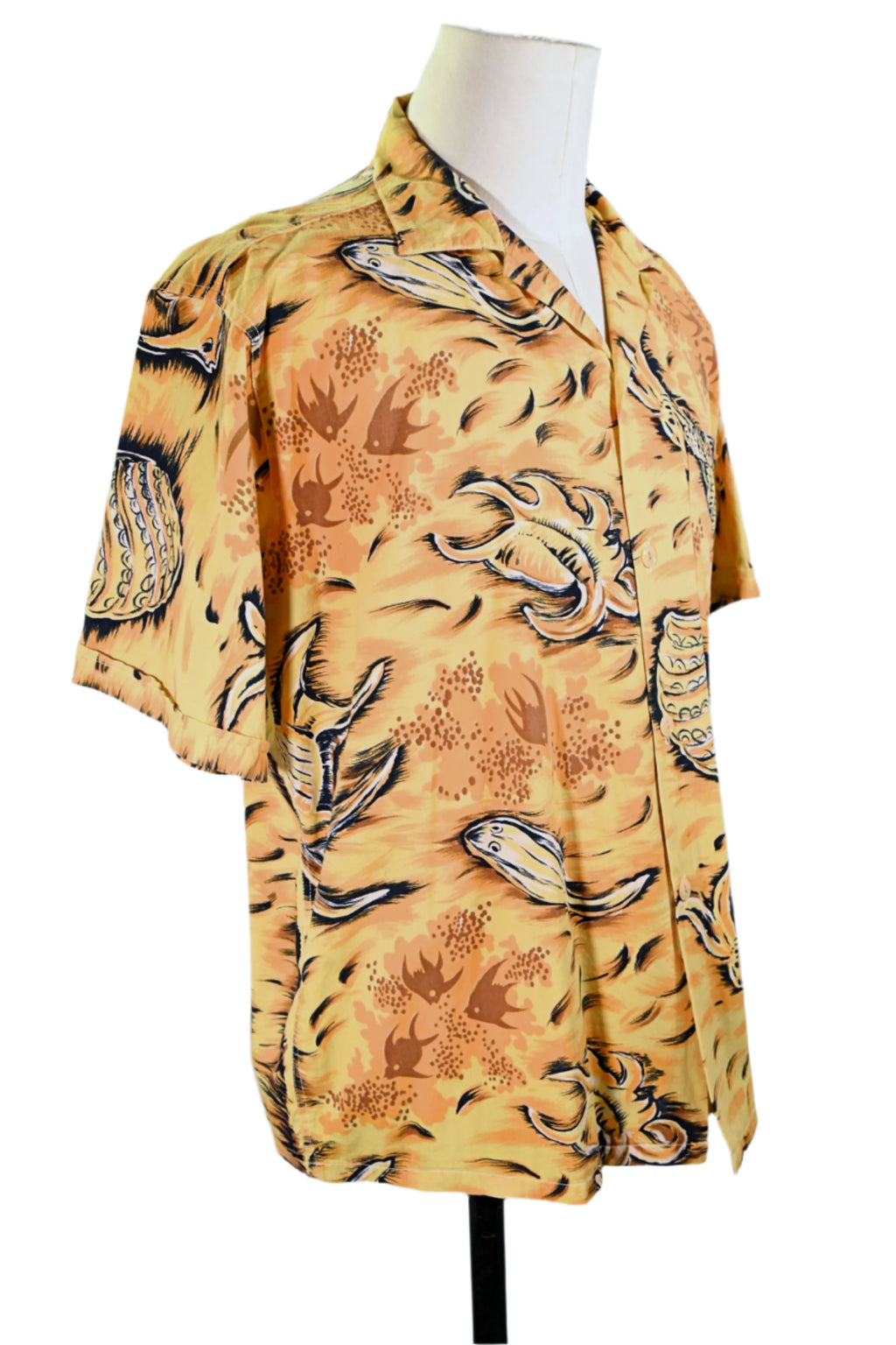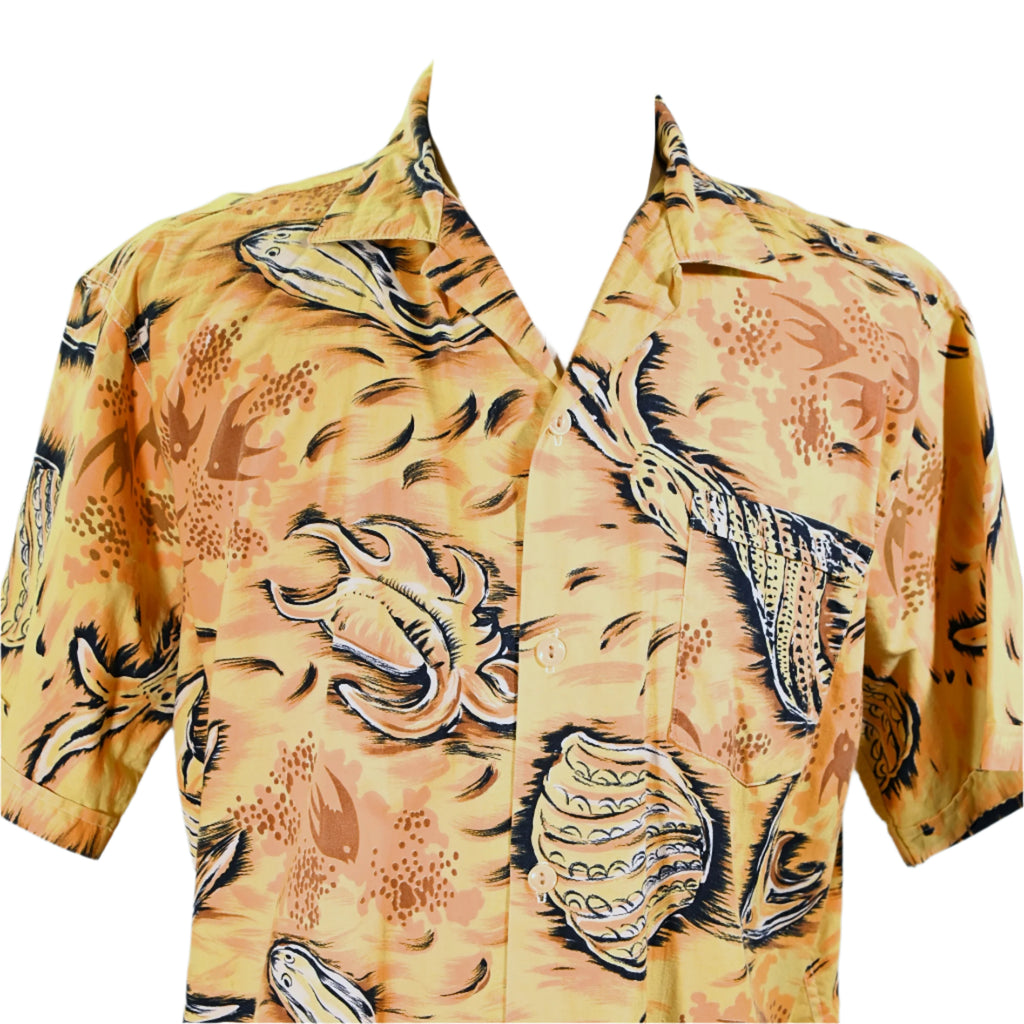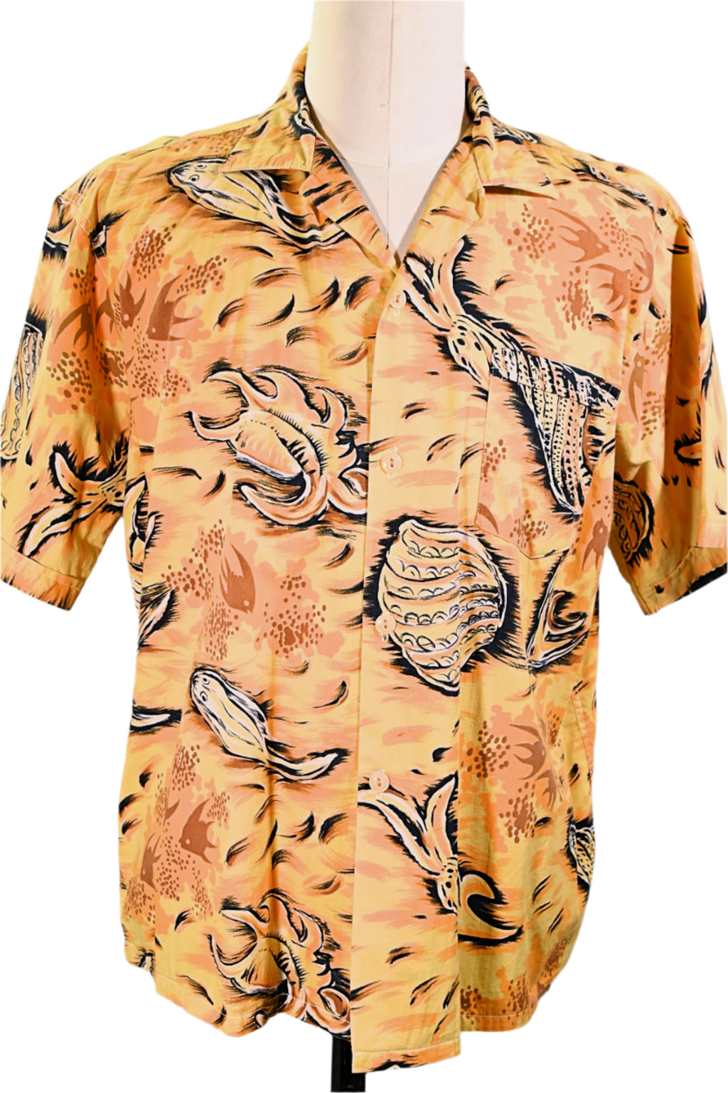 1950s cotton Aloha shirt with fish and seashell underwater scene.