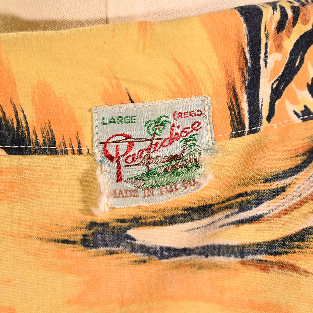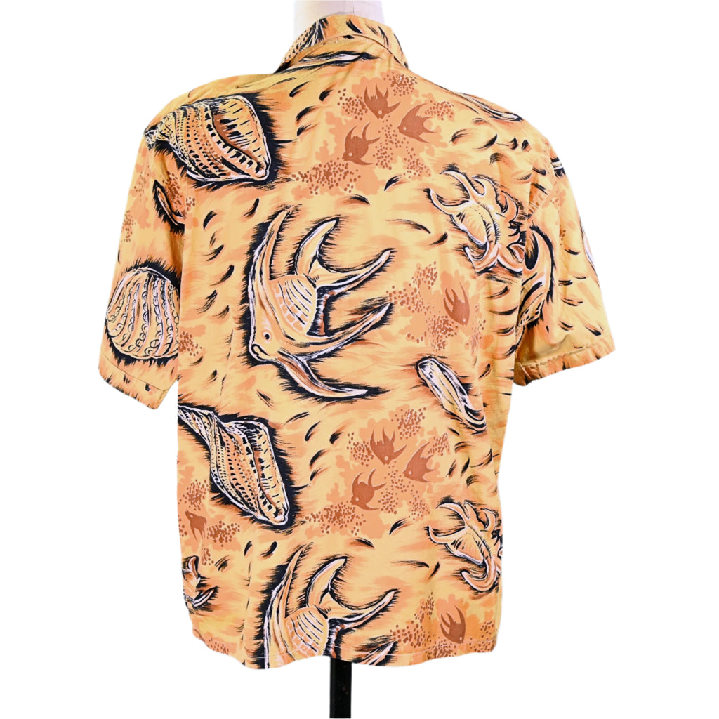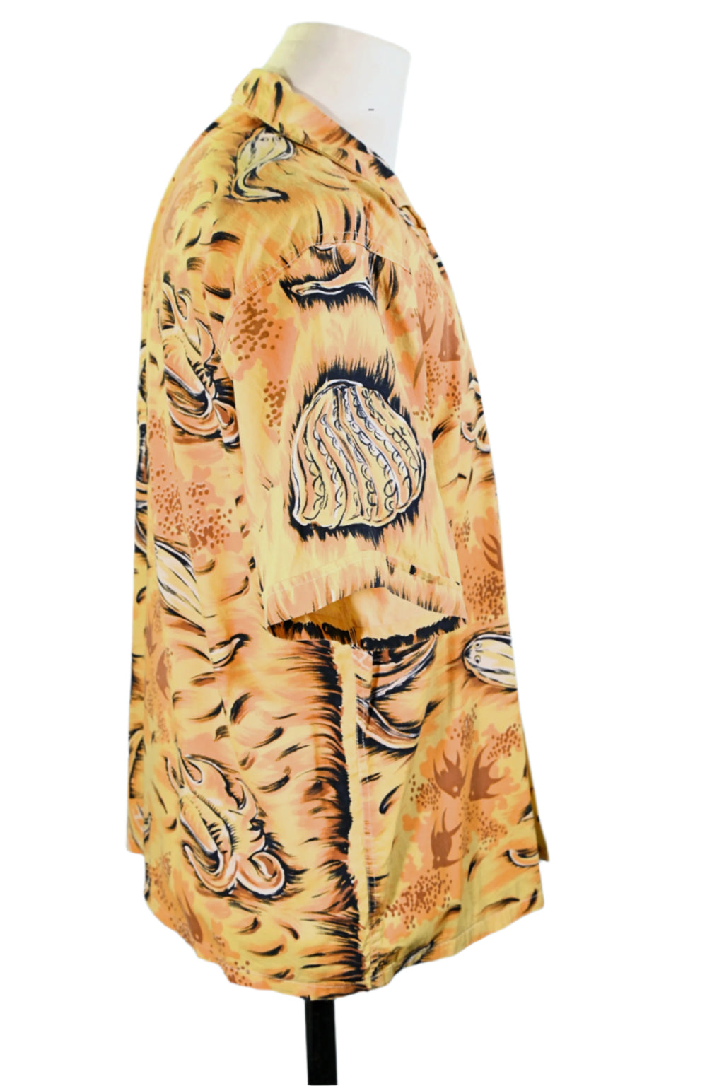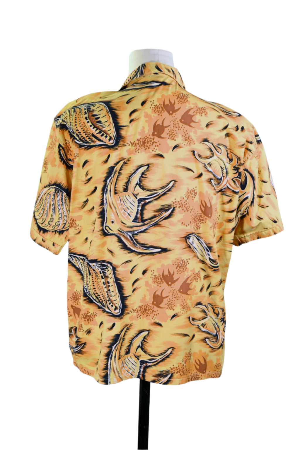 1950s cotton Aloha shirt with fish and seashell underwater scene.