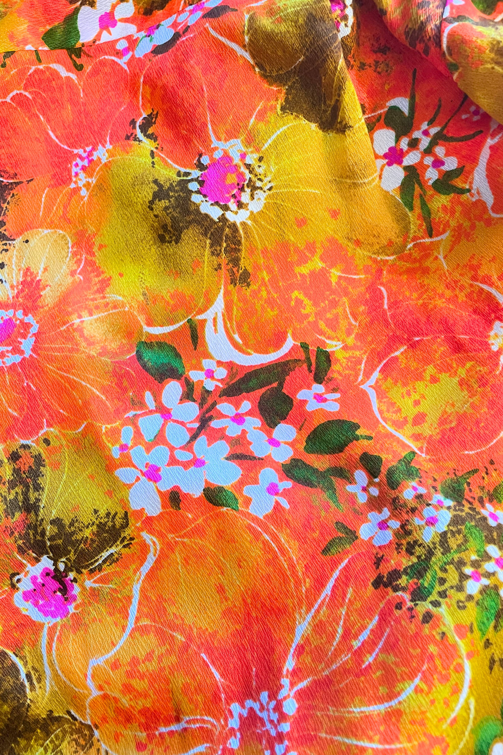 Soft fabric likely Poly blend woven crepe. Bright orange, yellow, pink, green neon.