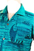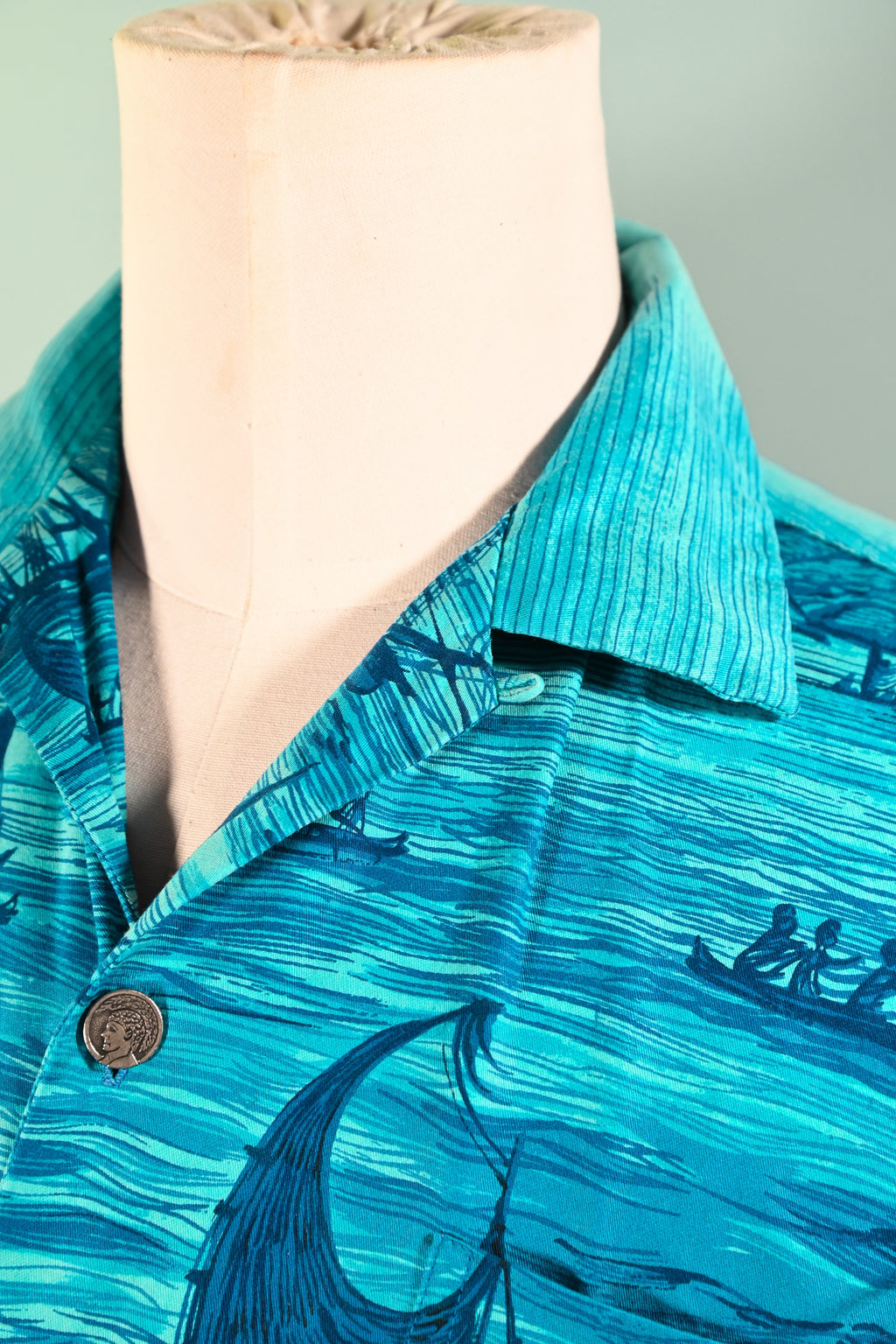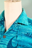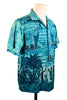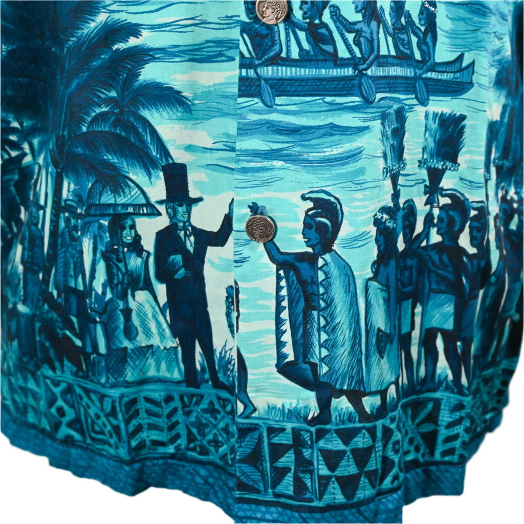 Vintage 60s Polynesian Bazaar shirt featuring early settlers and island natives greeting one another and exchanging gifts.