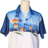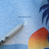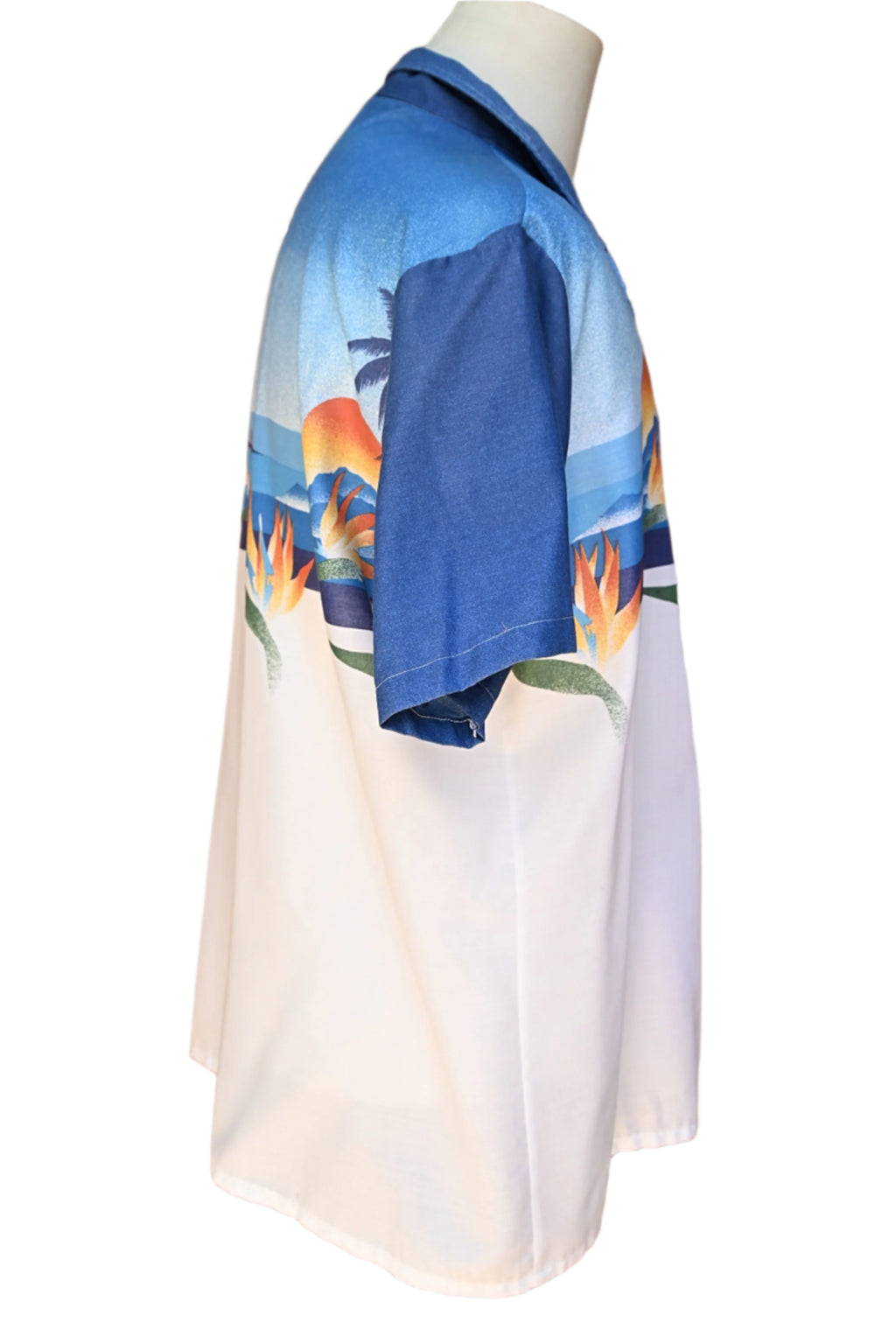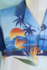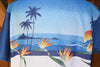 Light to dark blue speckled turning to silhouette. Images of Birds of Paradise, mountains, ocean, sun and palm trees.
