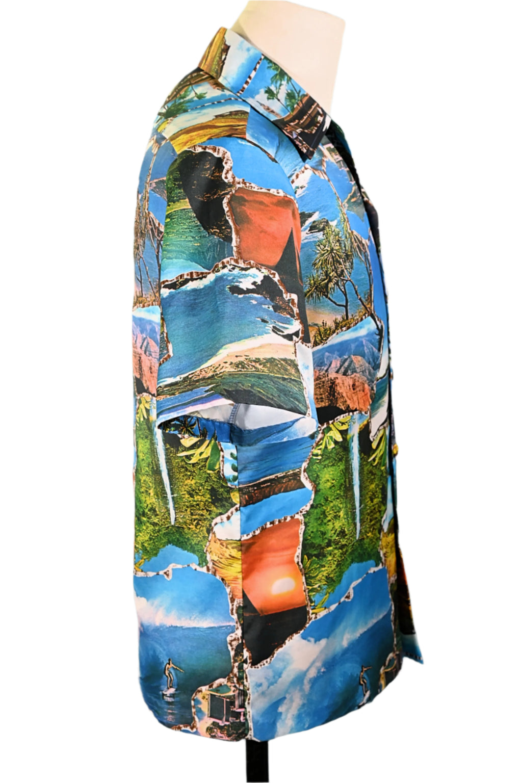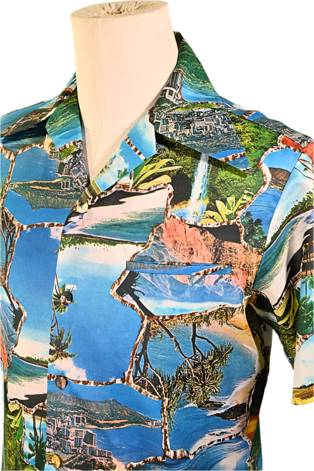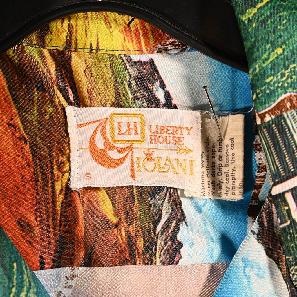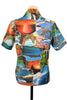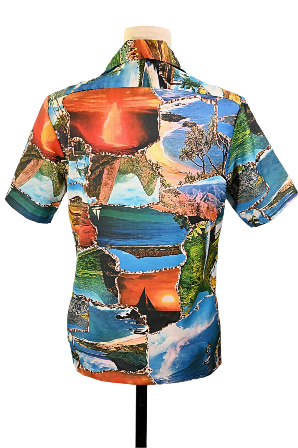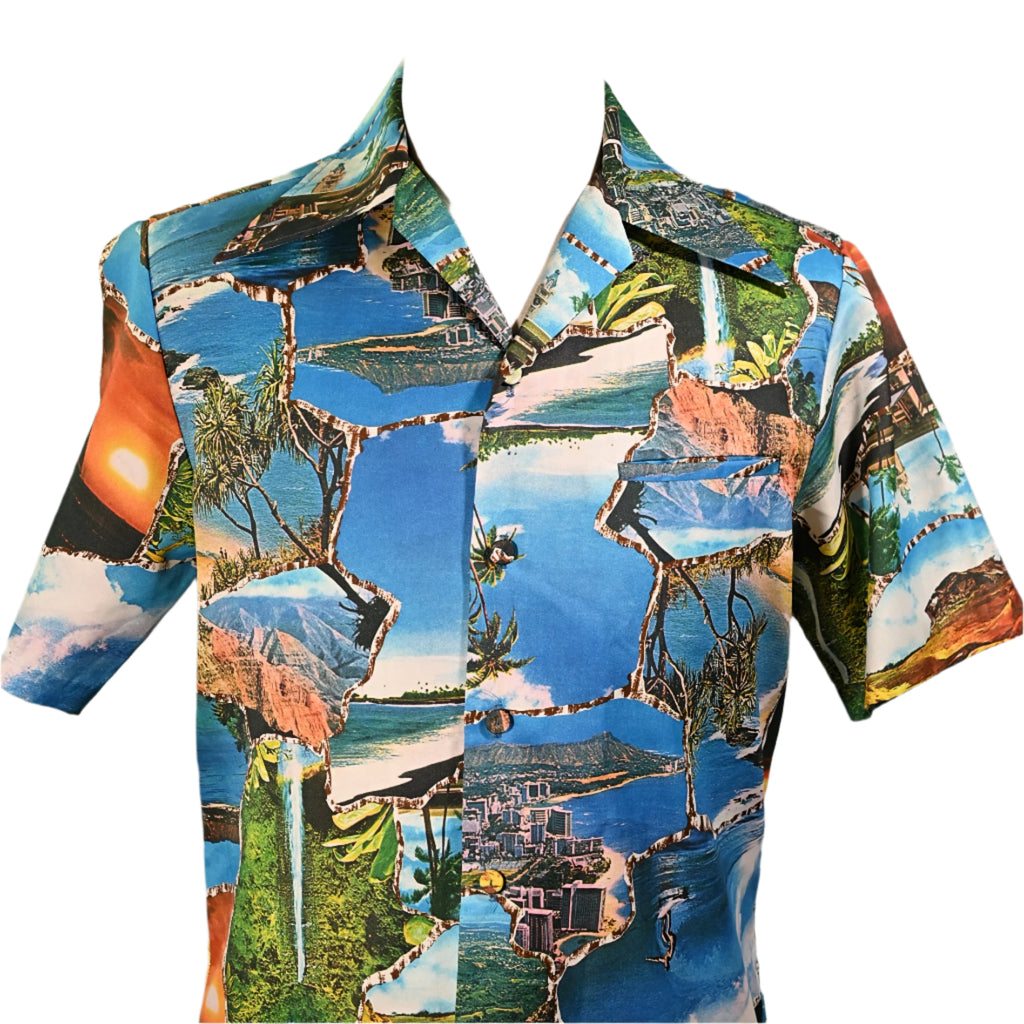 Vintage 70s photo image shirt showing images of Hawaii including waterfalls, volcanoes, surfers and more.