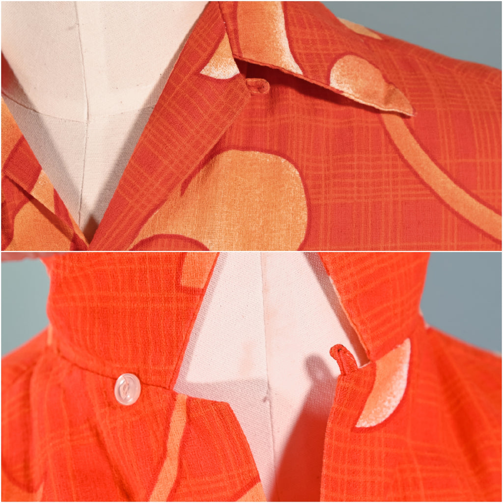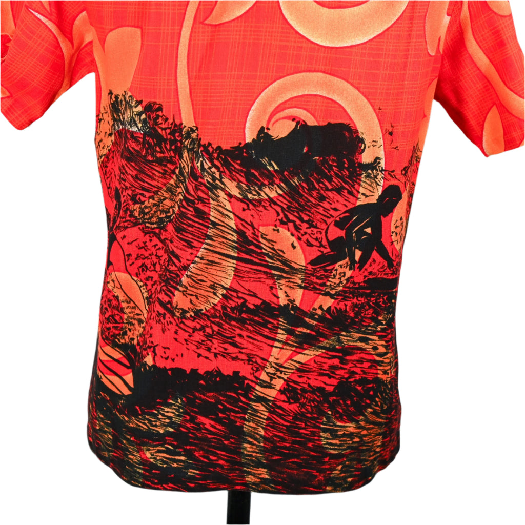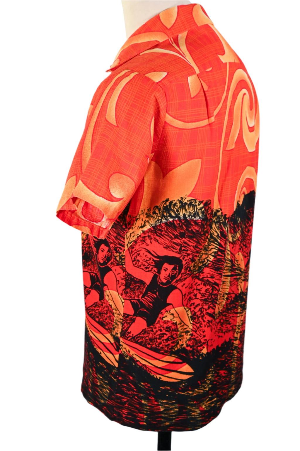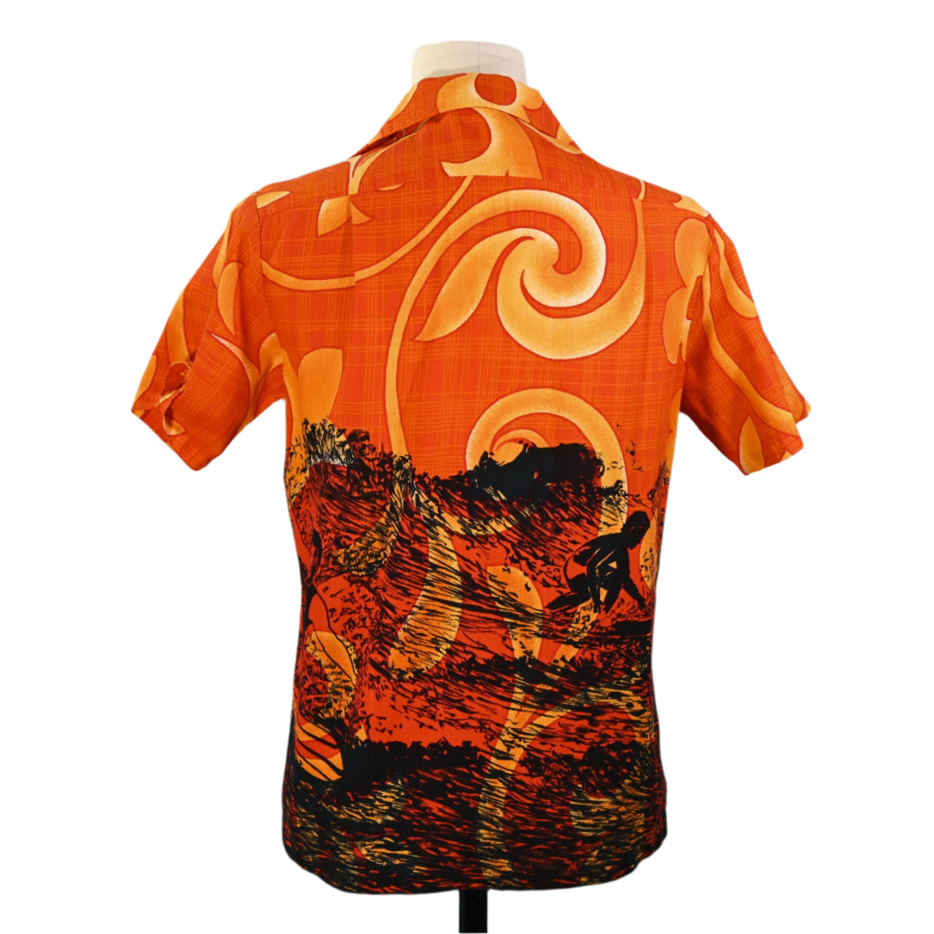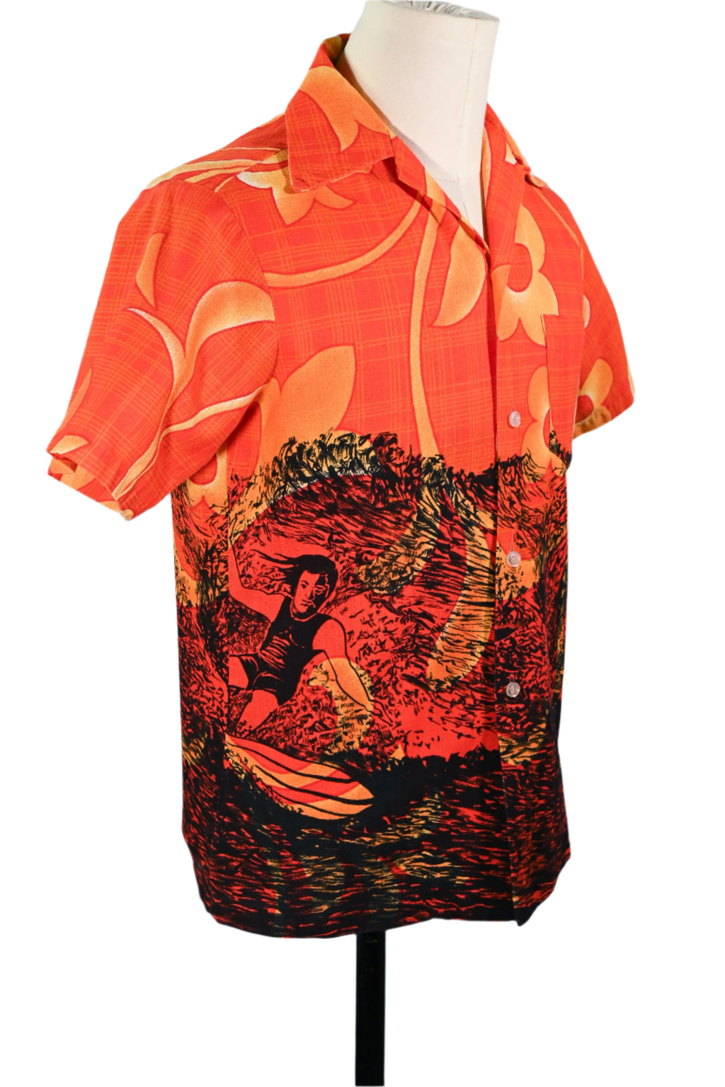 Great bold & vivid colored barkcloth Hawaiian shirt with flowers and surfers.