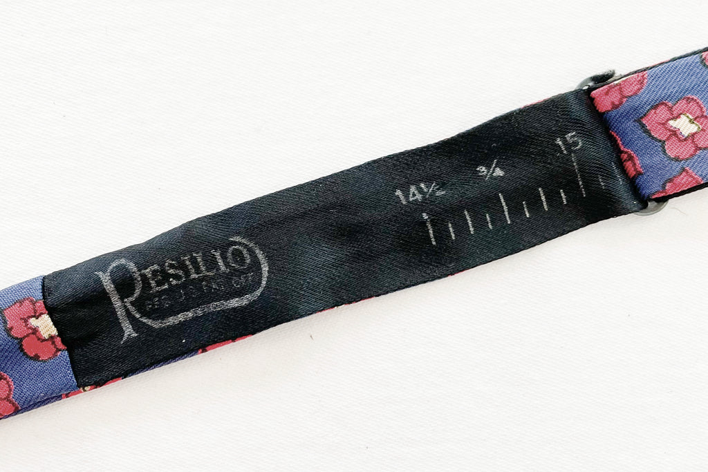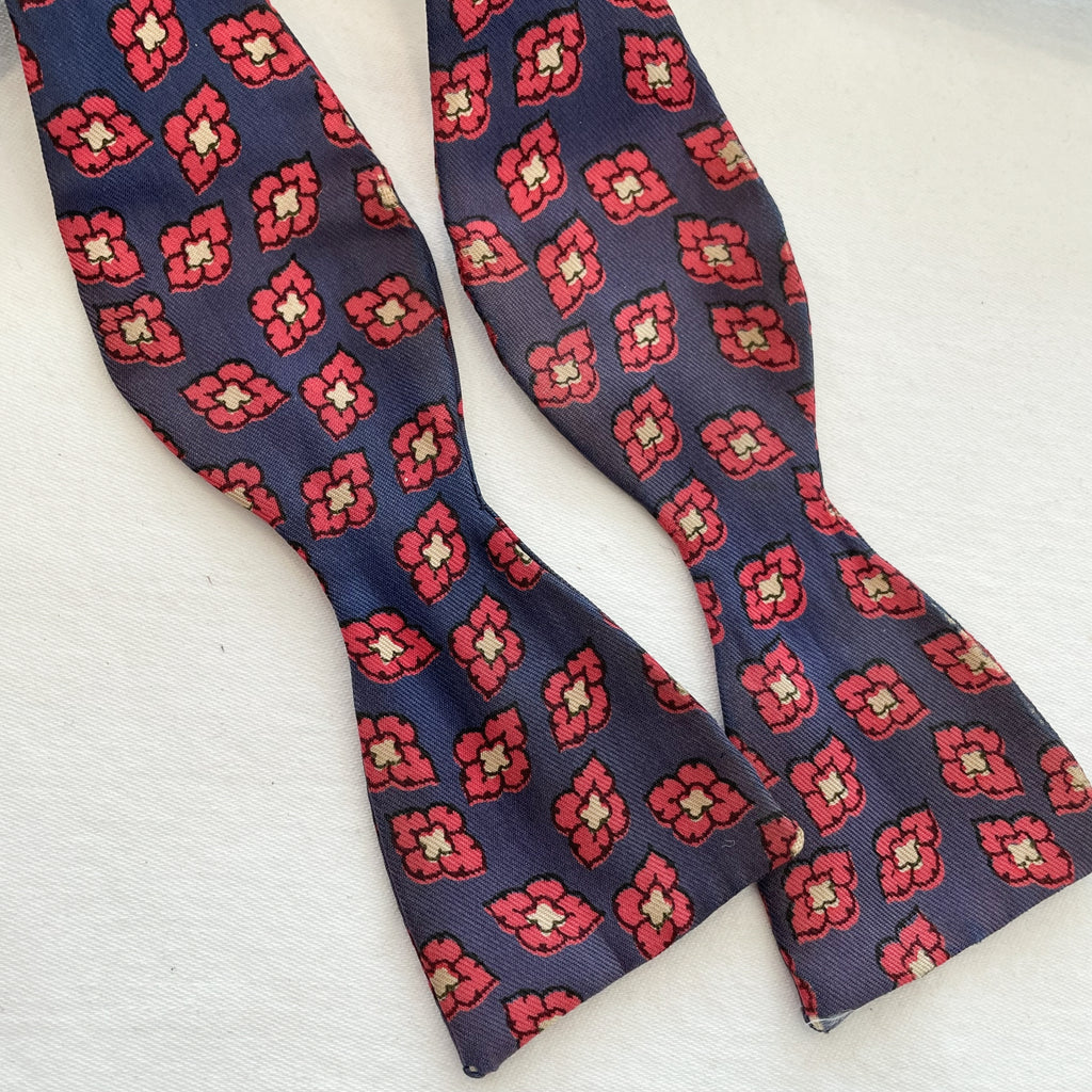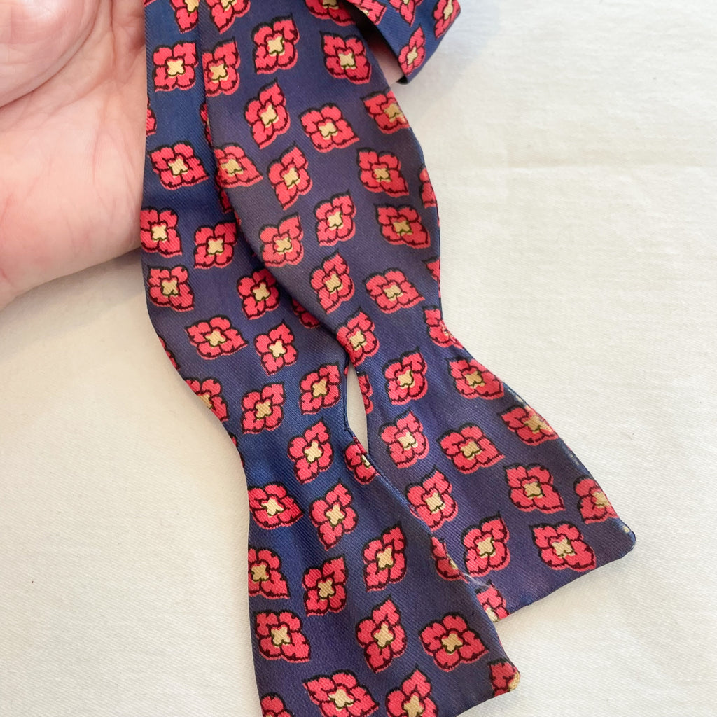 Vintage blue and red floral print bowtie. Silky fabric, content unmarked.