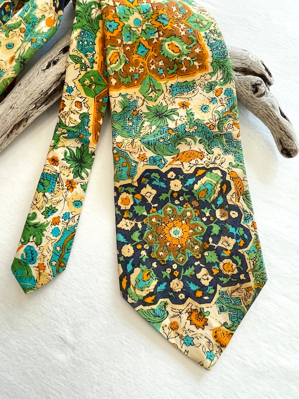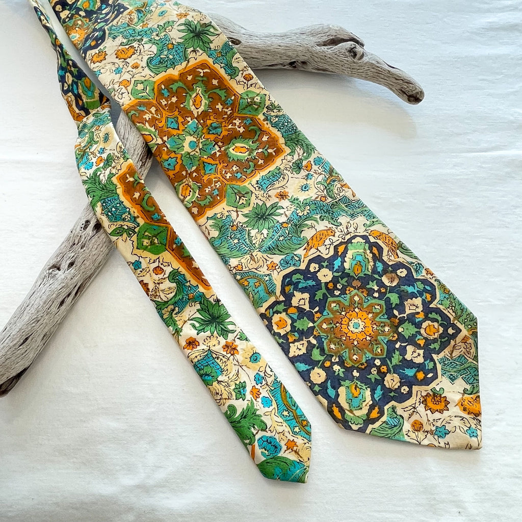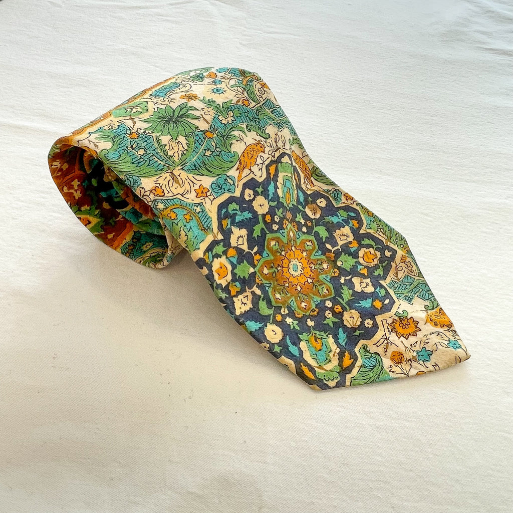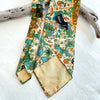 Beautiful colorful tie with tropical style graphics including birds, batik style print. Cream ground, navy, green, caramel, yellow.