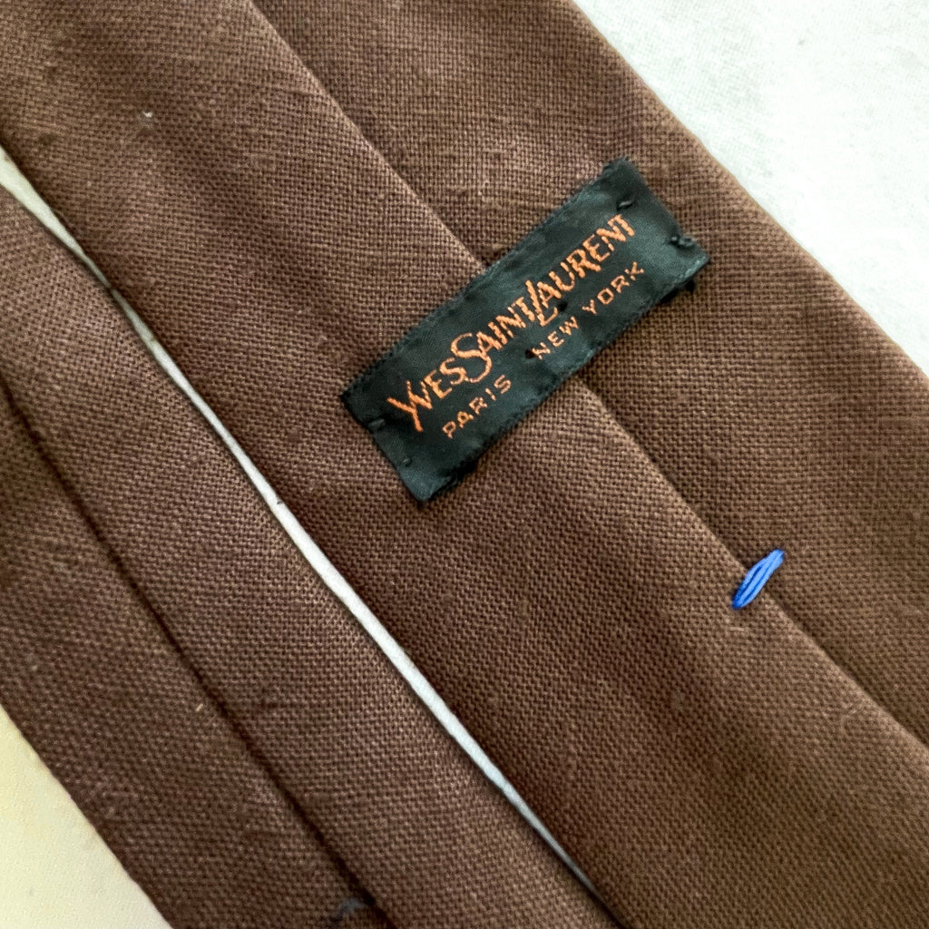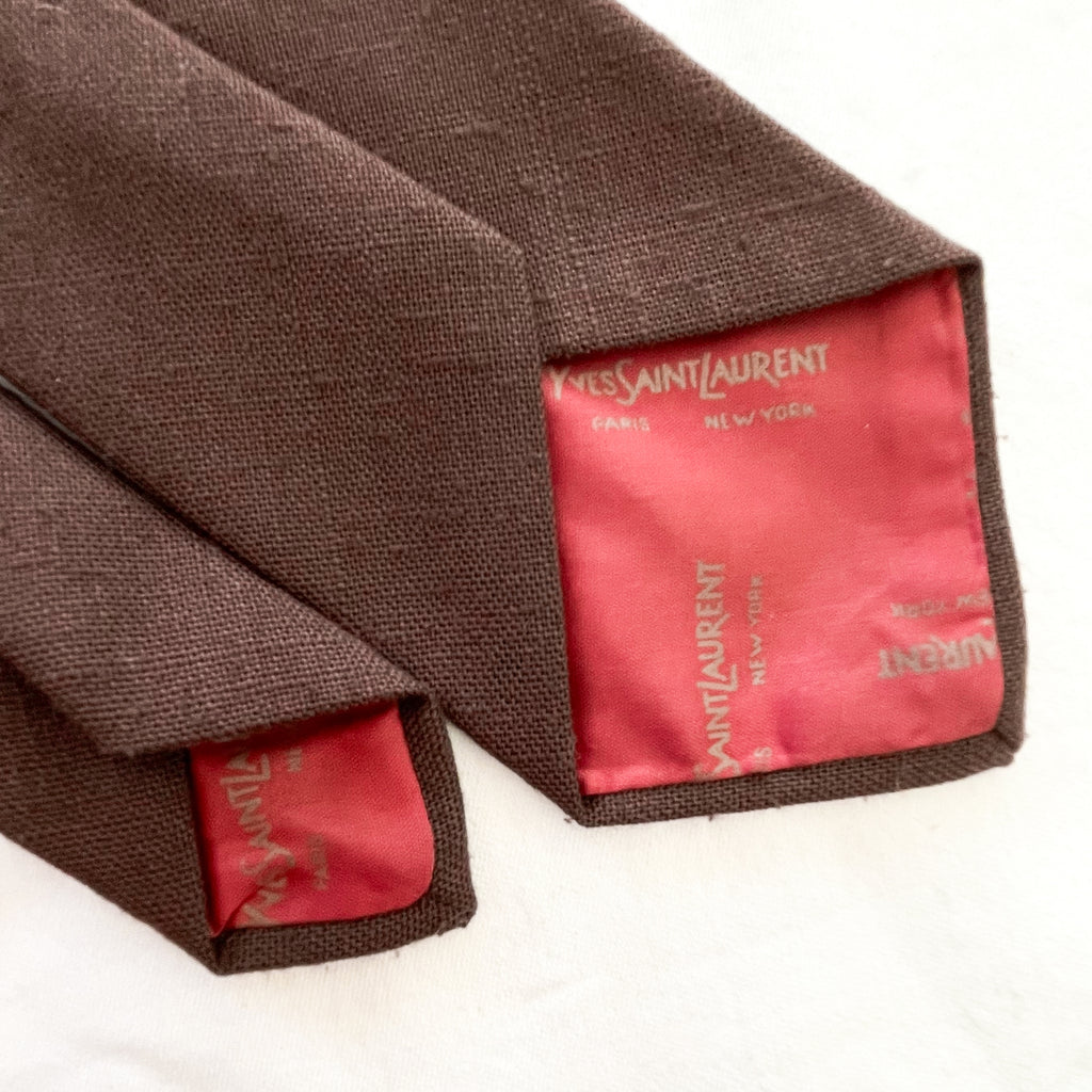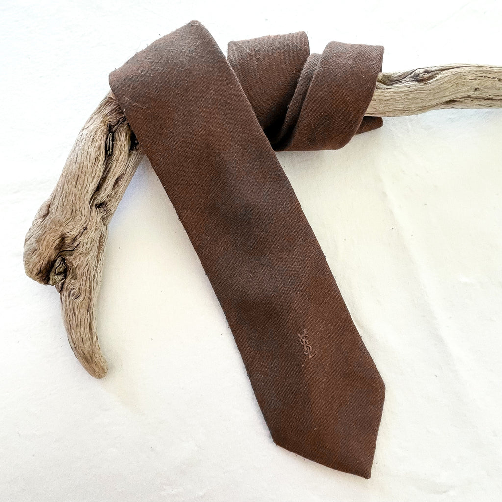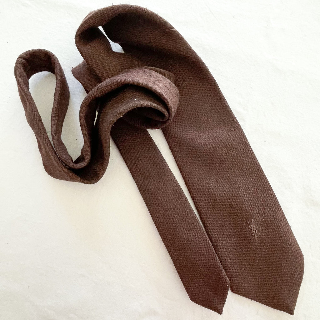 Vintage YSL brown linen necktie. Nubby linen, matching YSL logo embroidered on the front.