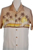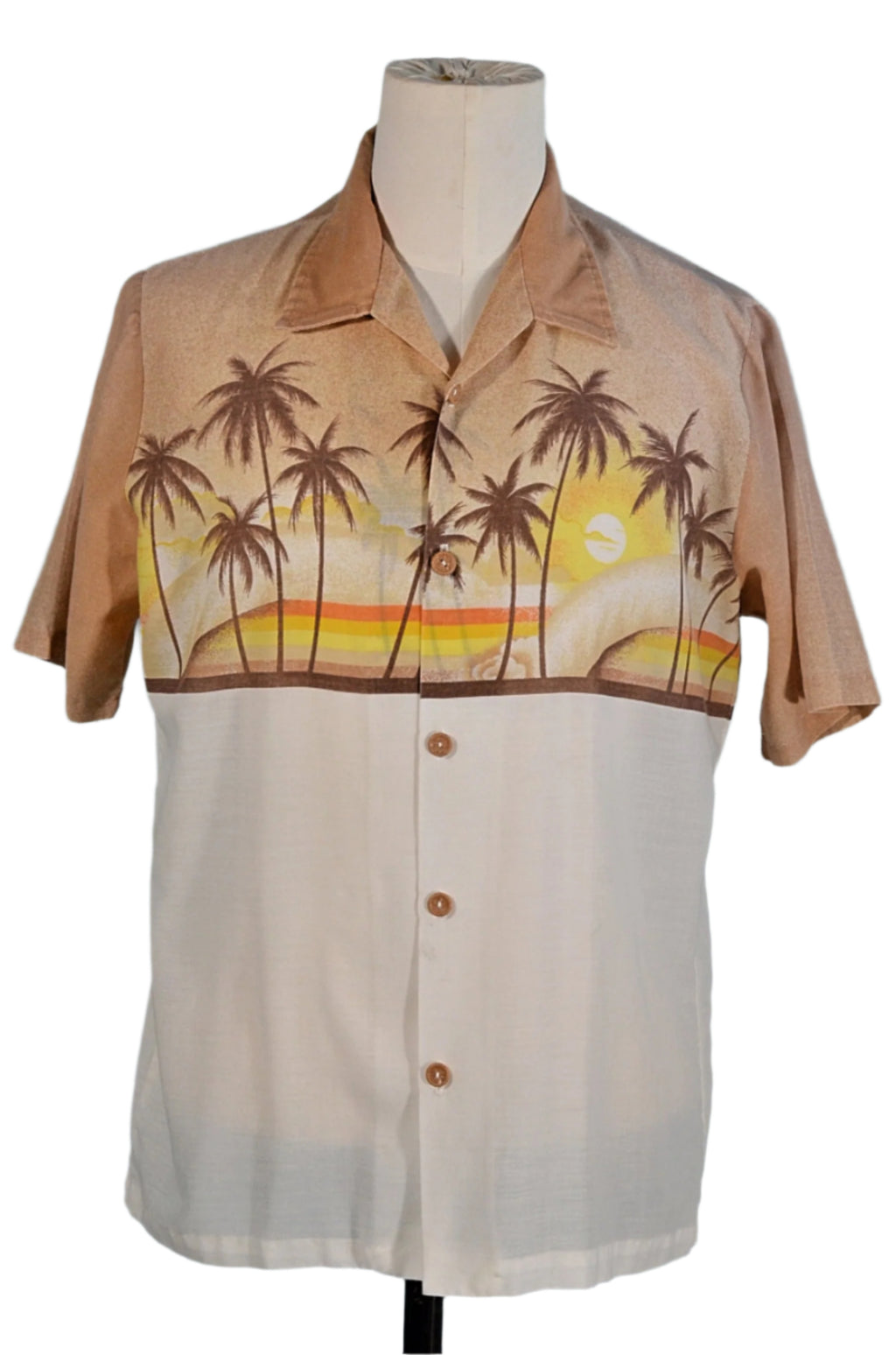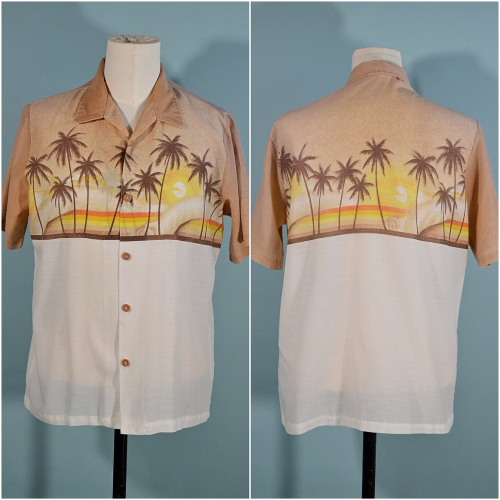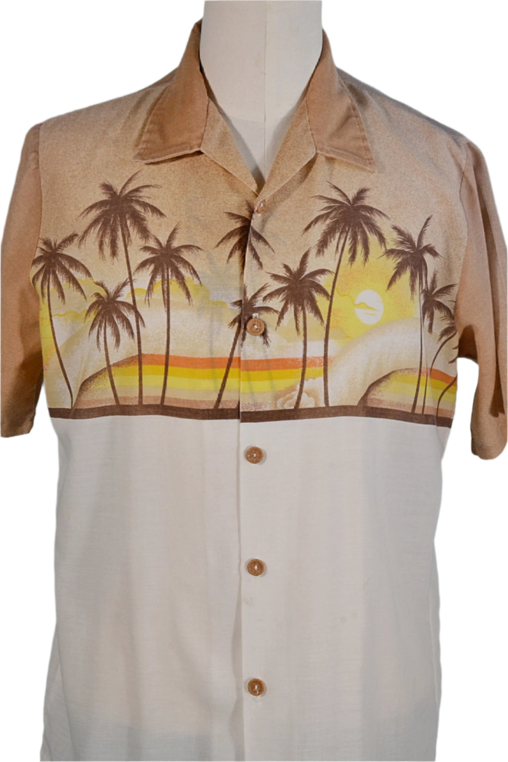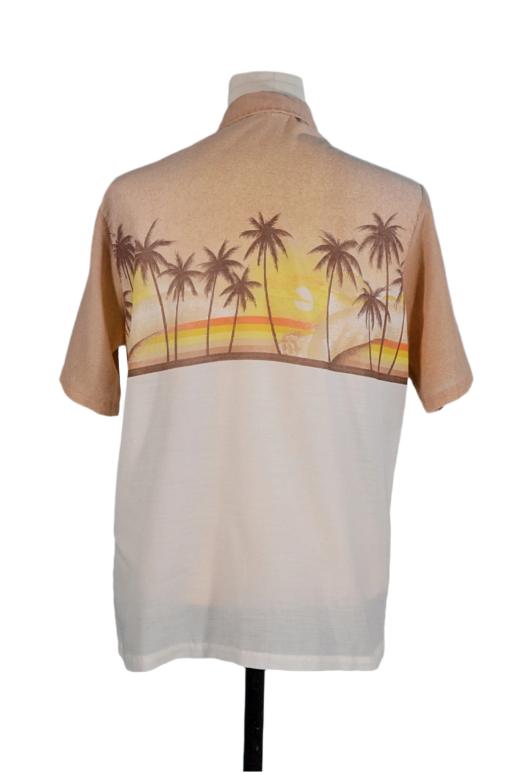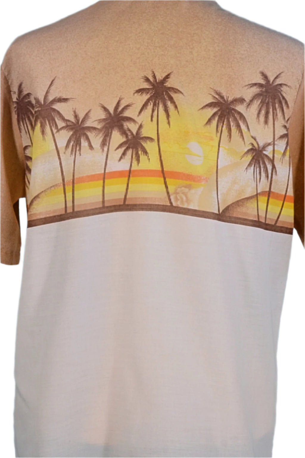 Great 1970s California Style Hawaiian Aloha shirt. Wooden buttons up the front. Palm trees, sunset, and a rainbow.