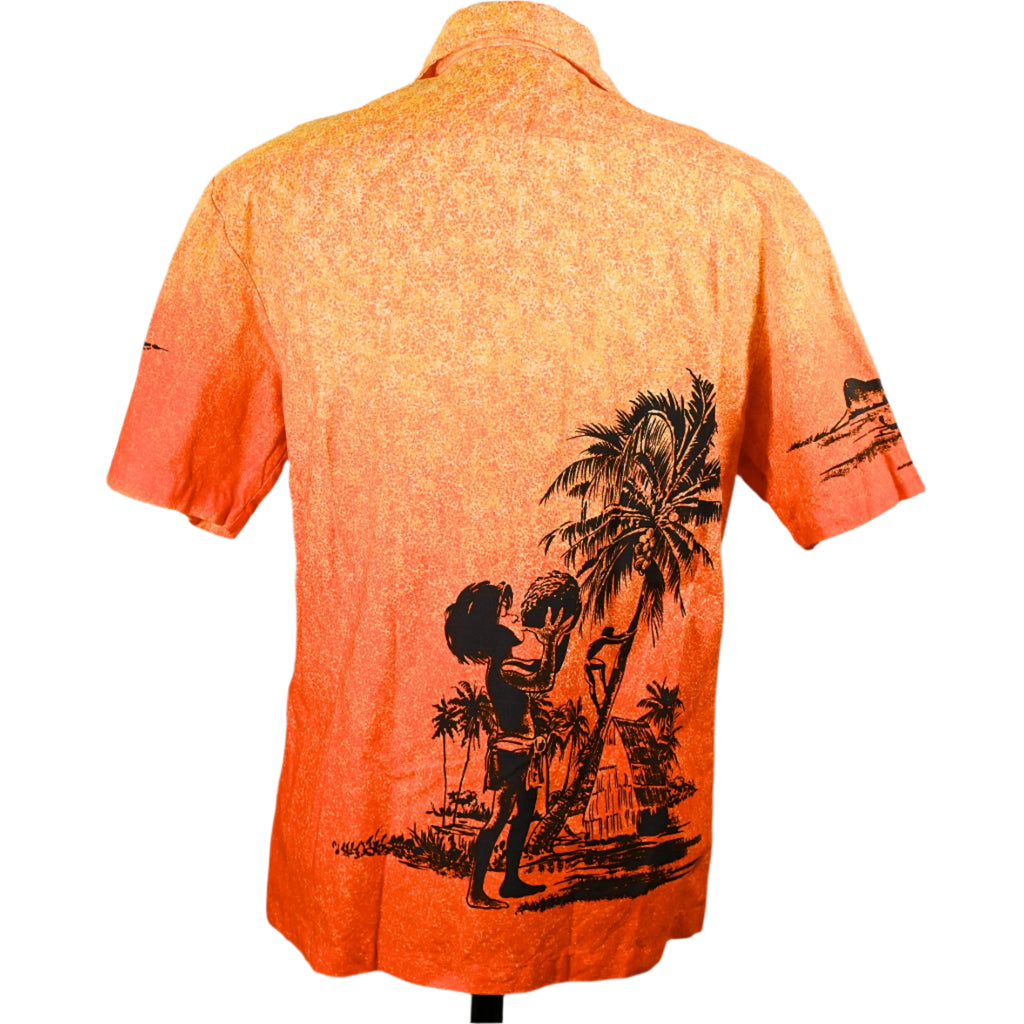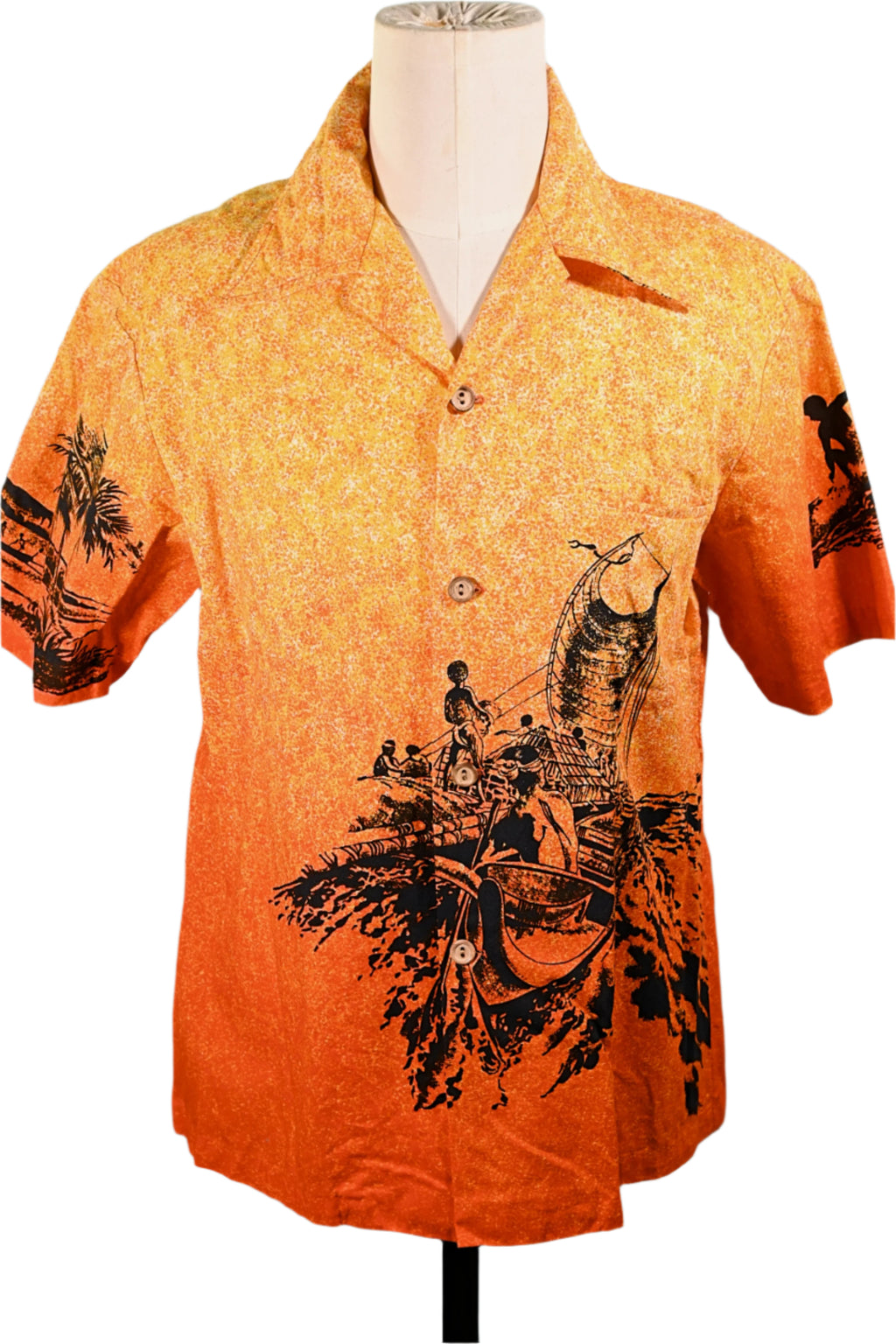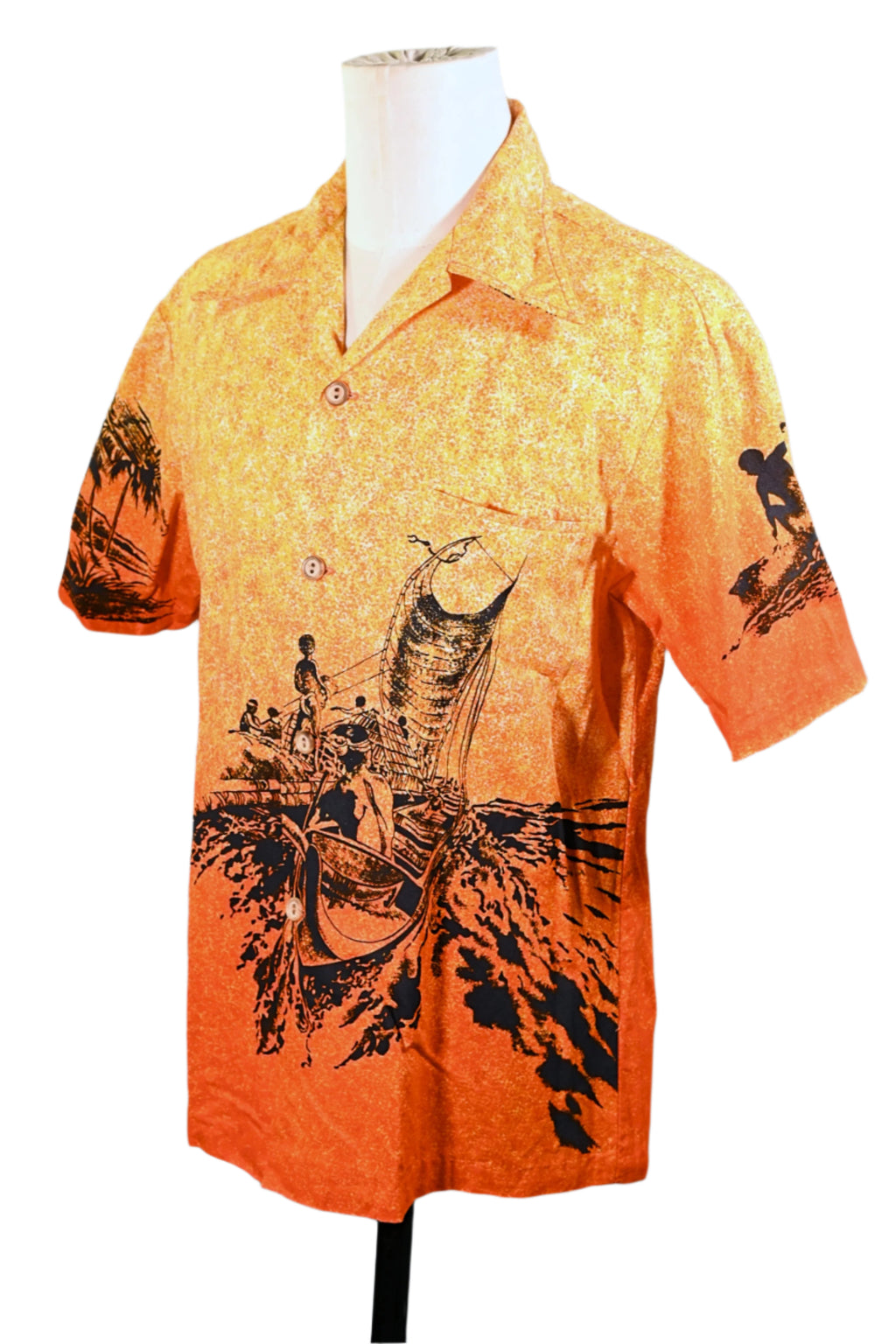 Coconut boy with palm trees, outrigger boat, surfers in silhouette.