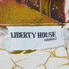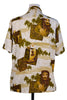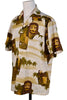 This is a great vintage Polynesian Hawaiian print Aloha shirt. The print on the textural fabric is palm trees, dancers with drums, ships, pineapples and Tikis.