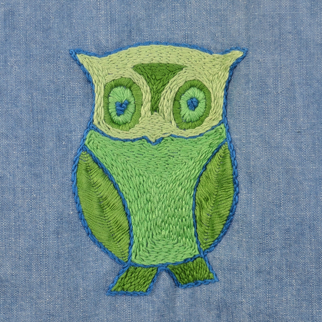 Complete with mushrooms, a big green owl, flowers, and a ladybug