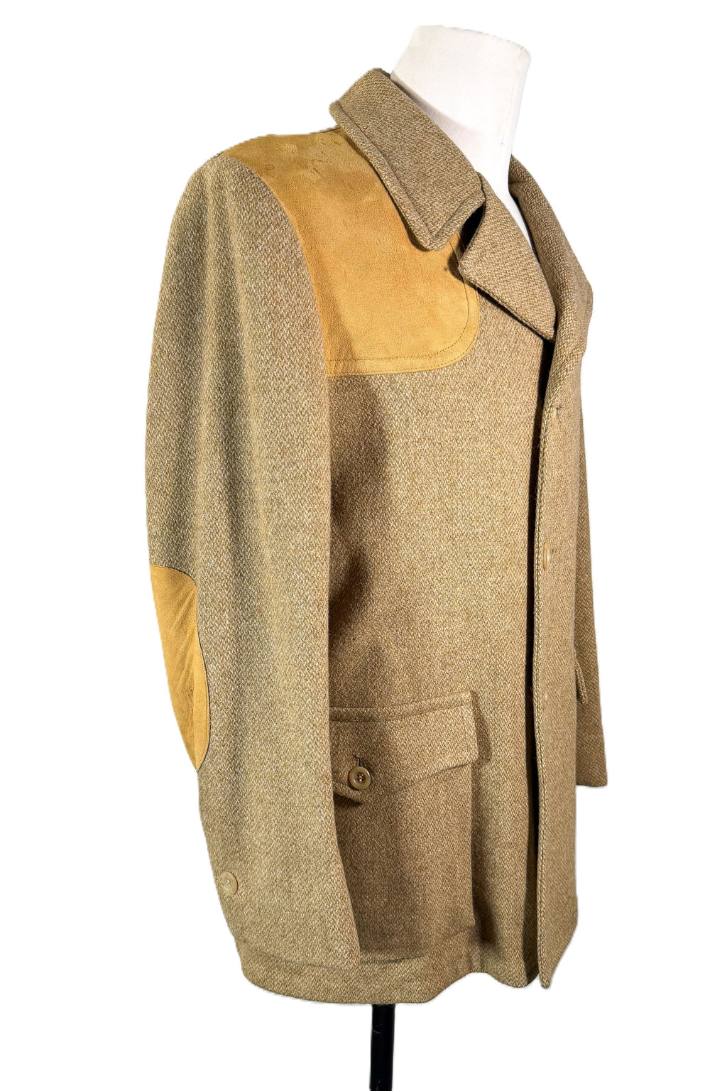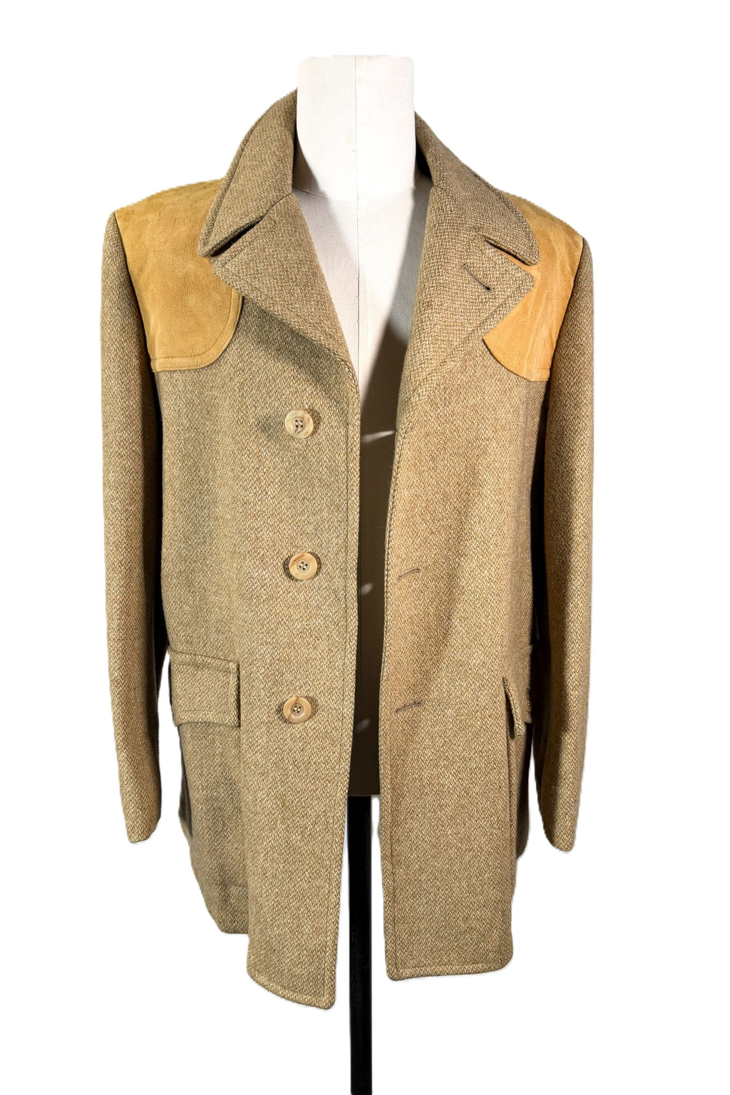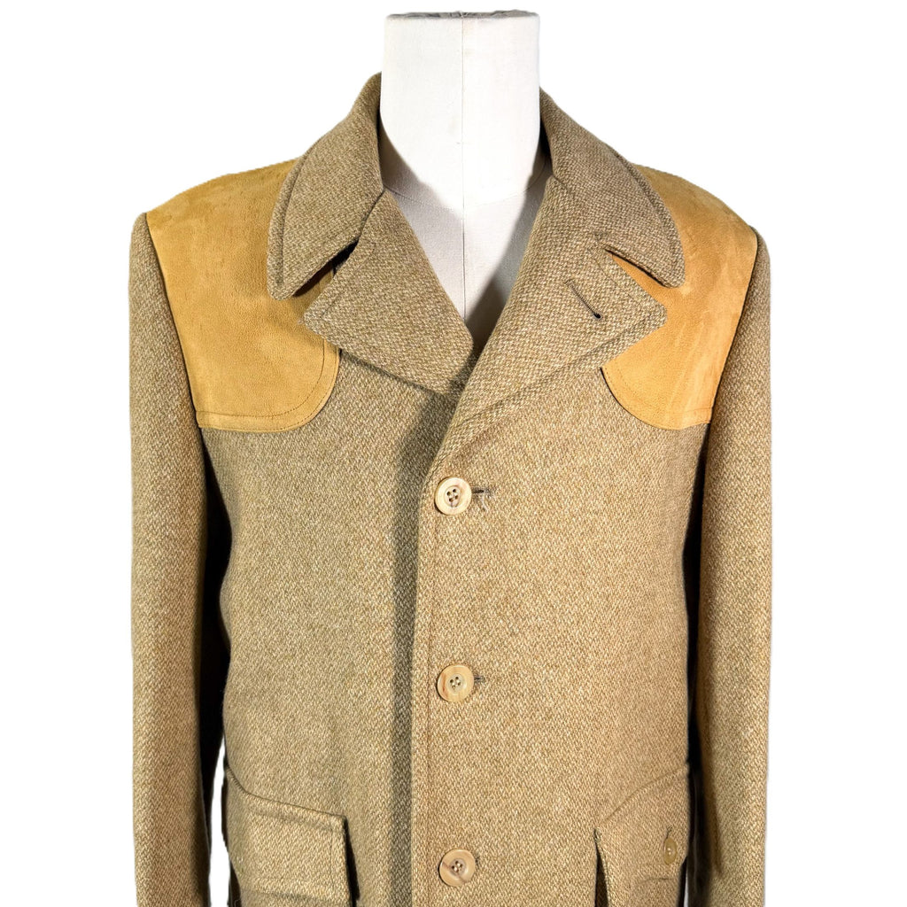 Vintage wool tweed jacket with suede patches on the shoulders and elbows.